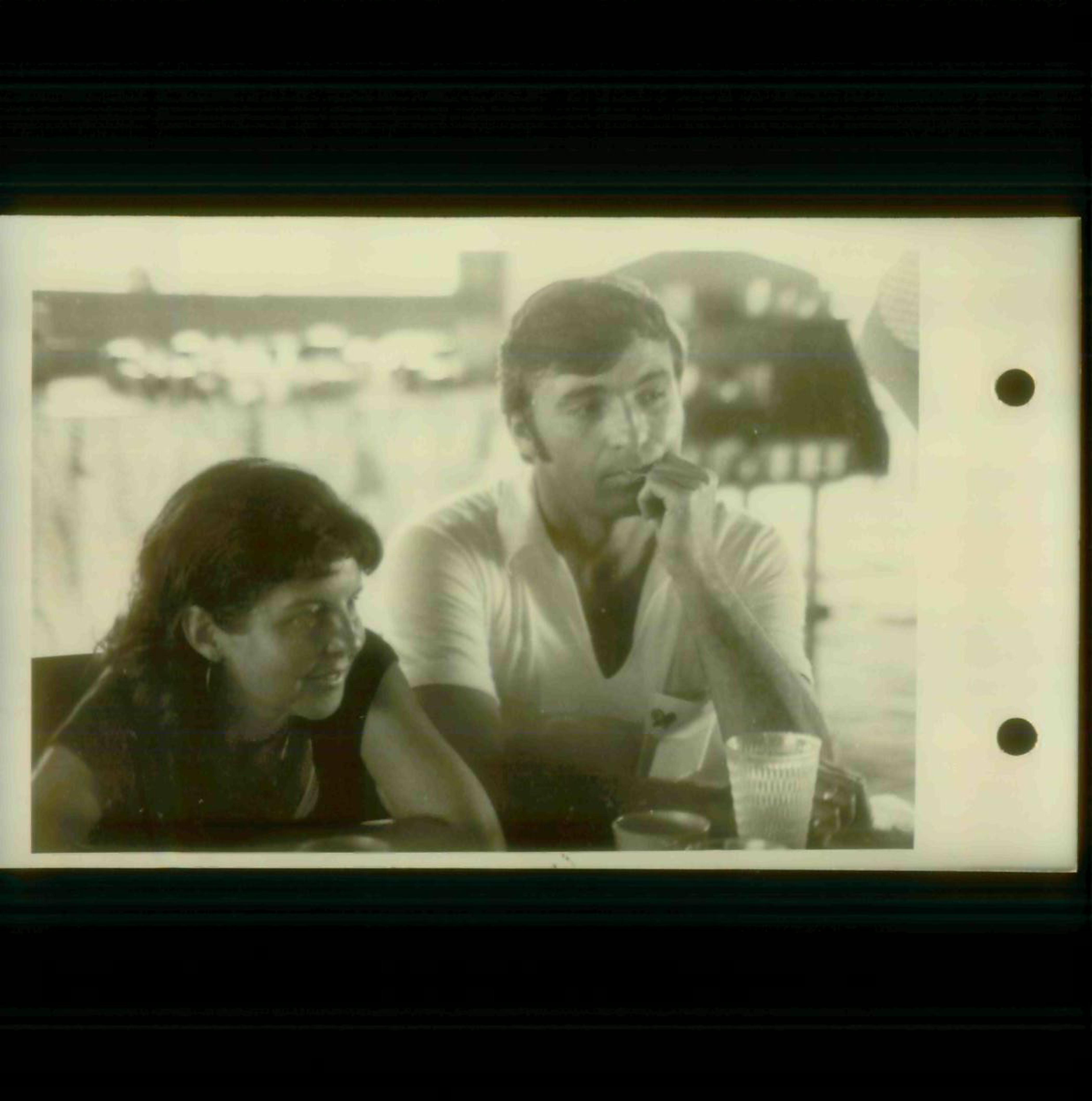 A man and a woman sit next to each other on one side of a bench with glass cups in front of them. They appear to be listening to someone speak in Jonestown.