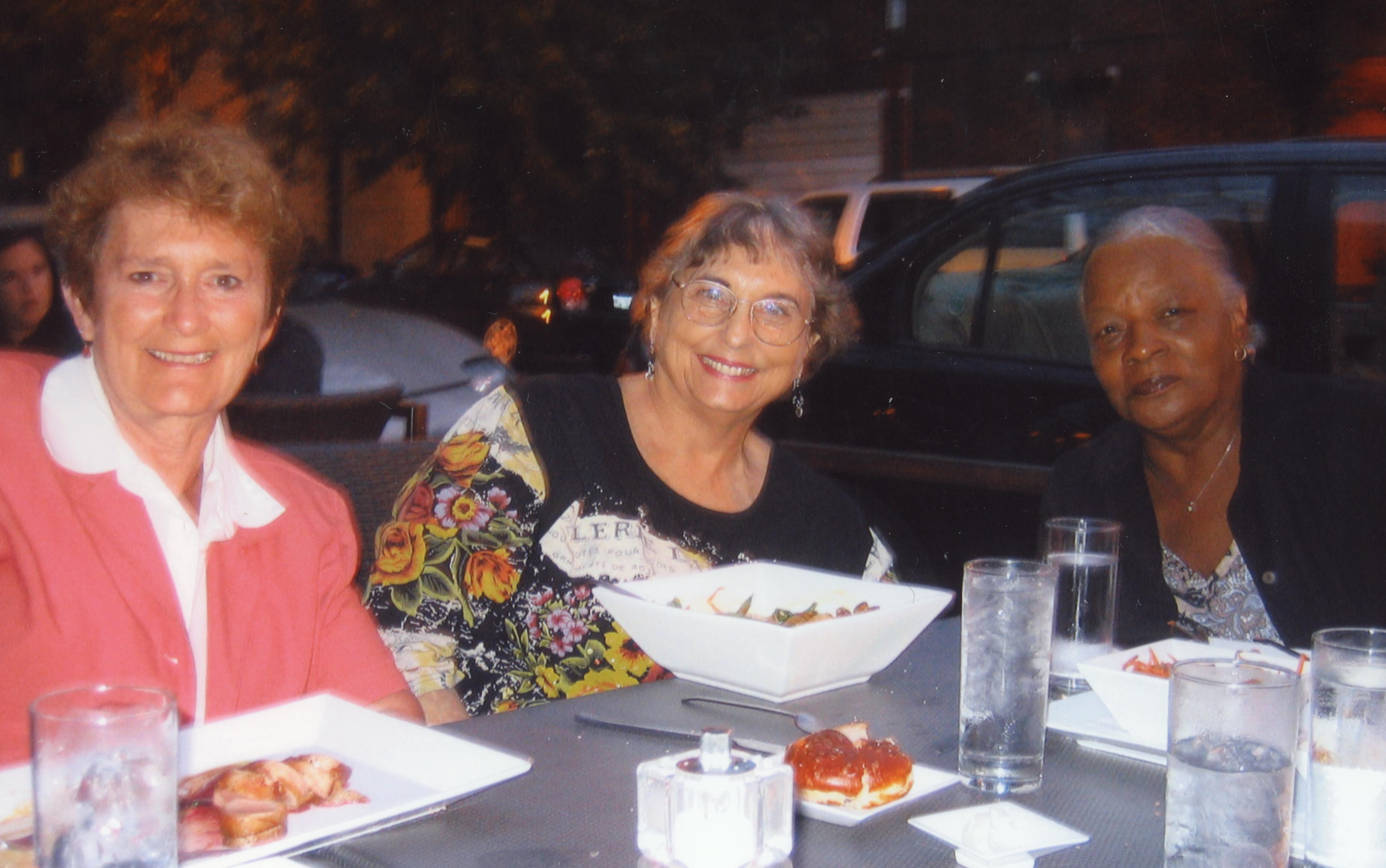 Laura Johnston Kohl, Claire Janaro, and an unknown woman pose with their food at a restaurant table in the evening.
