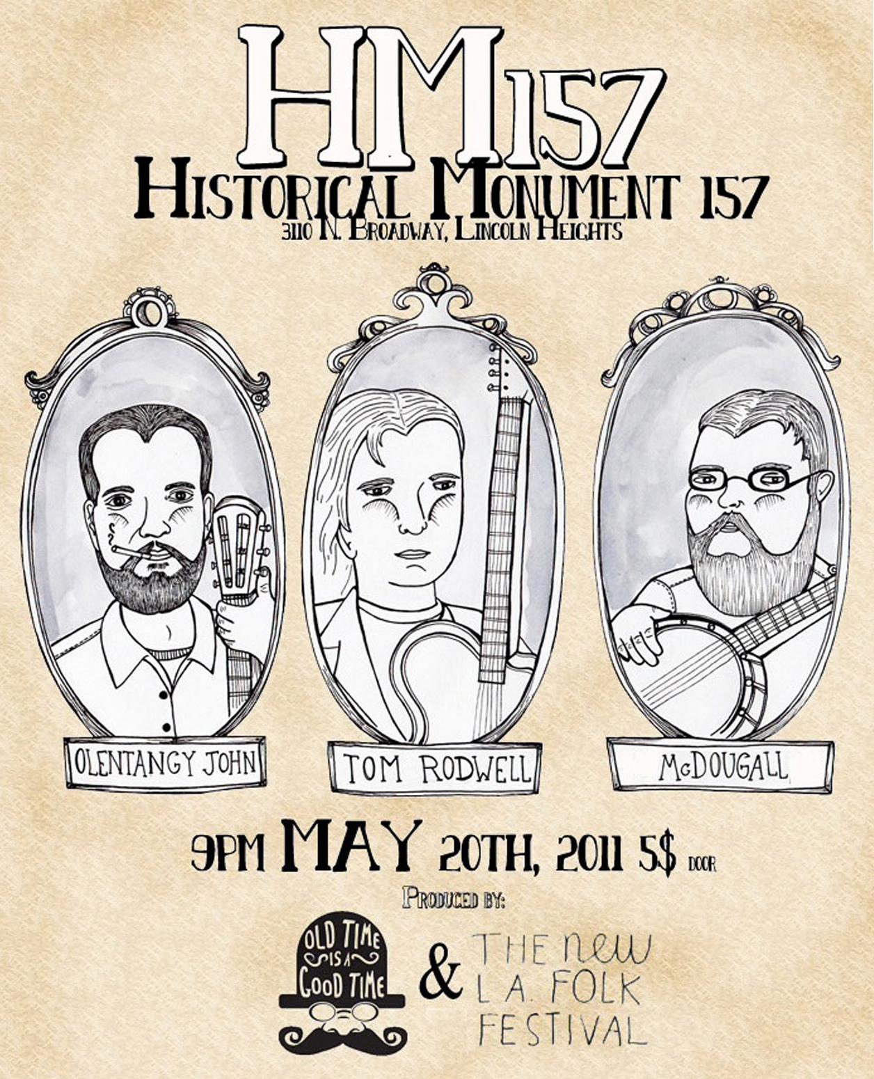 Poster for a musical event featuring Olentangy John, Tom Rodwell, and McDougall, in collaboration with the New Los Angeles Folk Festival