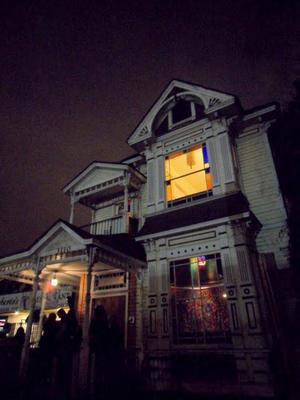 HM 157 house at night, a room upstairs with a light on, and people on the front porch