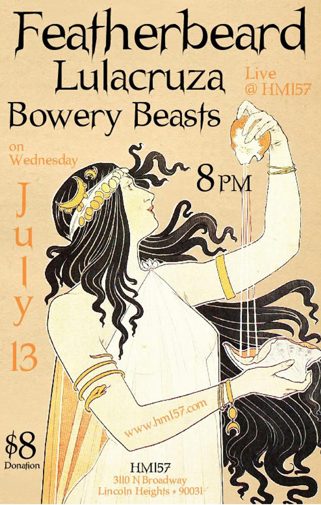Poster for a musical event featuring Featherbeard, Lulacruza, and Bowery Beats. The poster is vaguely Art Deco in style.