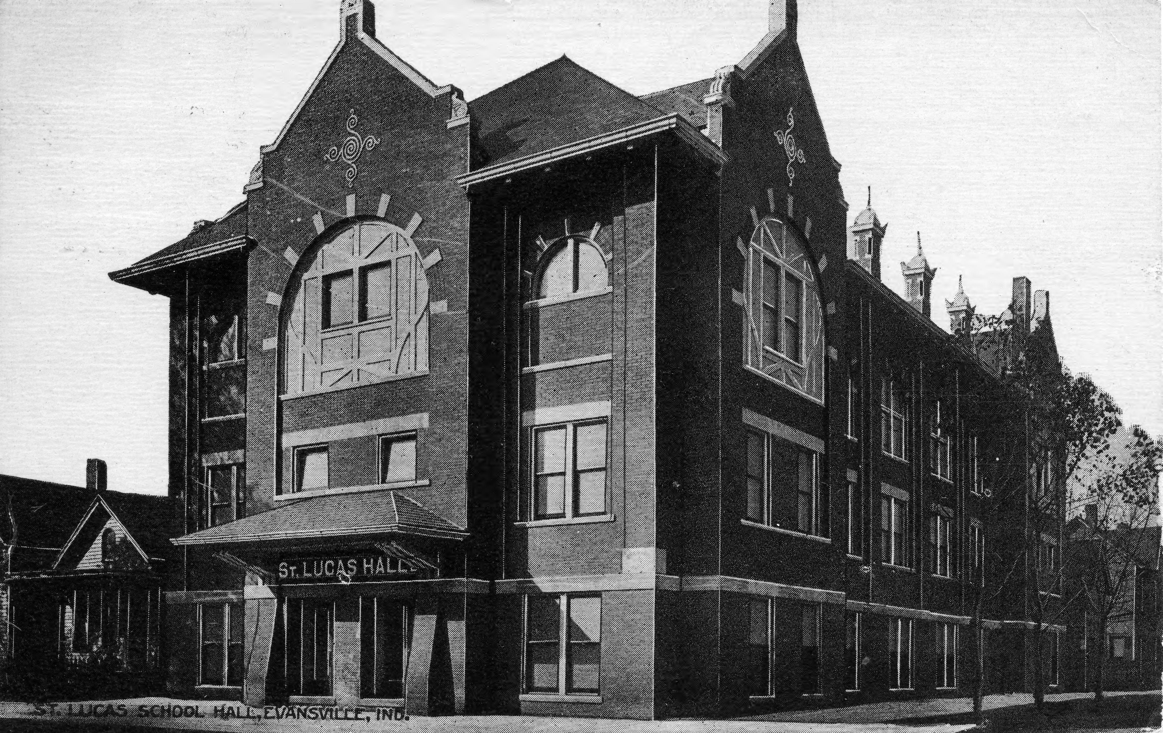 St. Lucas Hall, affiliated with St. Lucas German Evangelical Church (now UCC) at 33 W. Virginia St. "On July 14, 1889, Pastor Schmidt arrived in Evansville to lead a new German-Evangelical congregation. On July 21 St. Lucas was born. Dedication of the sanctuary took place on April 20, 1890. St. Lucas continued to grow and the Sunday School Hall was dedicated on October 27, 1907. The 21 stained glass windows were bestowed on September 21, 1911." During the 1937 flood the Indiana Naval Militia quartered in the parish house. The church office also became a broadcasting station of military forces. (http://stlucasevansville.com/history/) Today this church looks much the same as this and well maintained, although the exterior tracery on the windows, including the rose window, is gone.