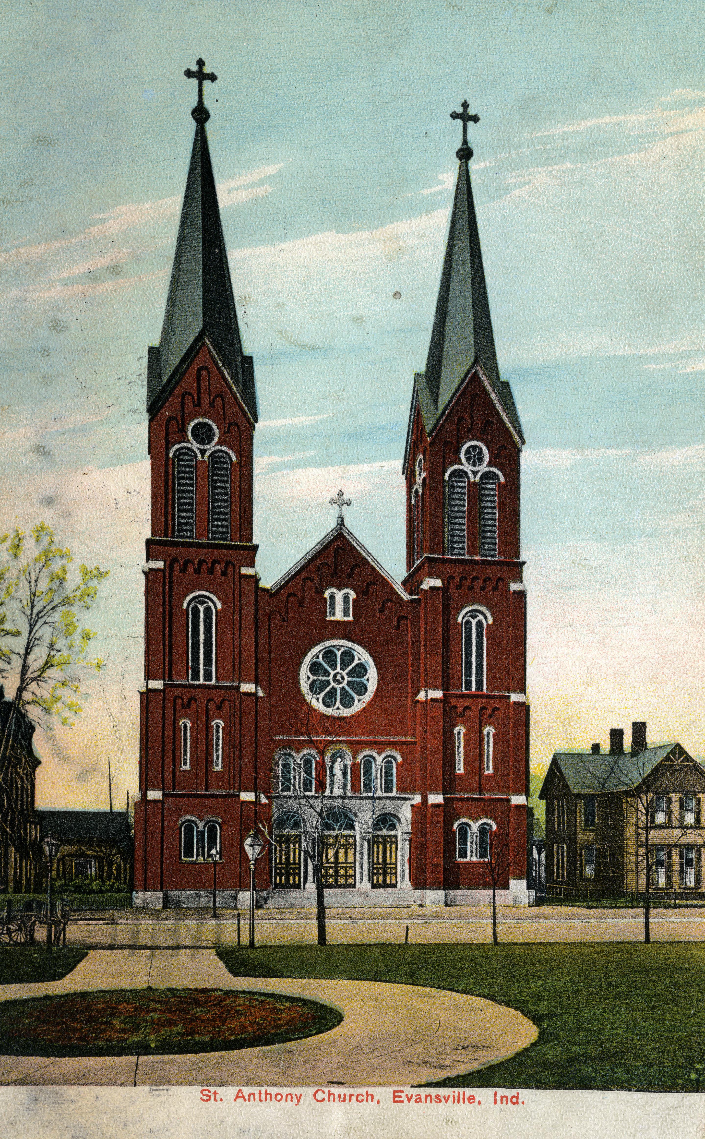 St. Anthony Catholic Church at 712 First Ave. "[This church] began with the vision and benevolence of German immigrants Anthony Reis and his wife, Magdalena, who made their fortune in the tannery business beginning in 1857. In addition to fortune, Mr. Reis found a place in history as the inspiration for an early Catholic church in Evansville, Indiana. In 1872, Mr. Reis built the current Saint Anthony rectory as a mansion for his family. The Reis home was located on the block bounded by First Avenue, Columbia Street, Second Avenue and Delaware Street. Mr. Reis died in 1884, and the next year his widow donated this parcel of land to the Indianapolis Diocese with the stipulation that the land be used as the site of a Catholic Church to be named in memory of her husband. Three years later, Bishop Francis S. Chatard received a petition from 150, mostly poor, German families from Holy Trinity Church requesting the organization of a new parish. Saint Antonius Kirche, or Saint Anthony Church, became the sixth Catholic parish in Evansville."