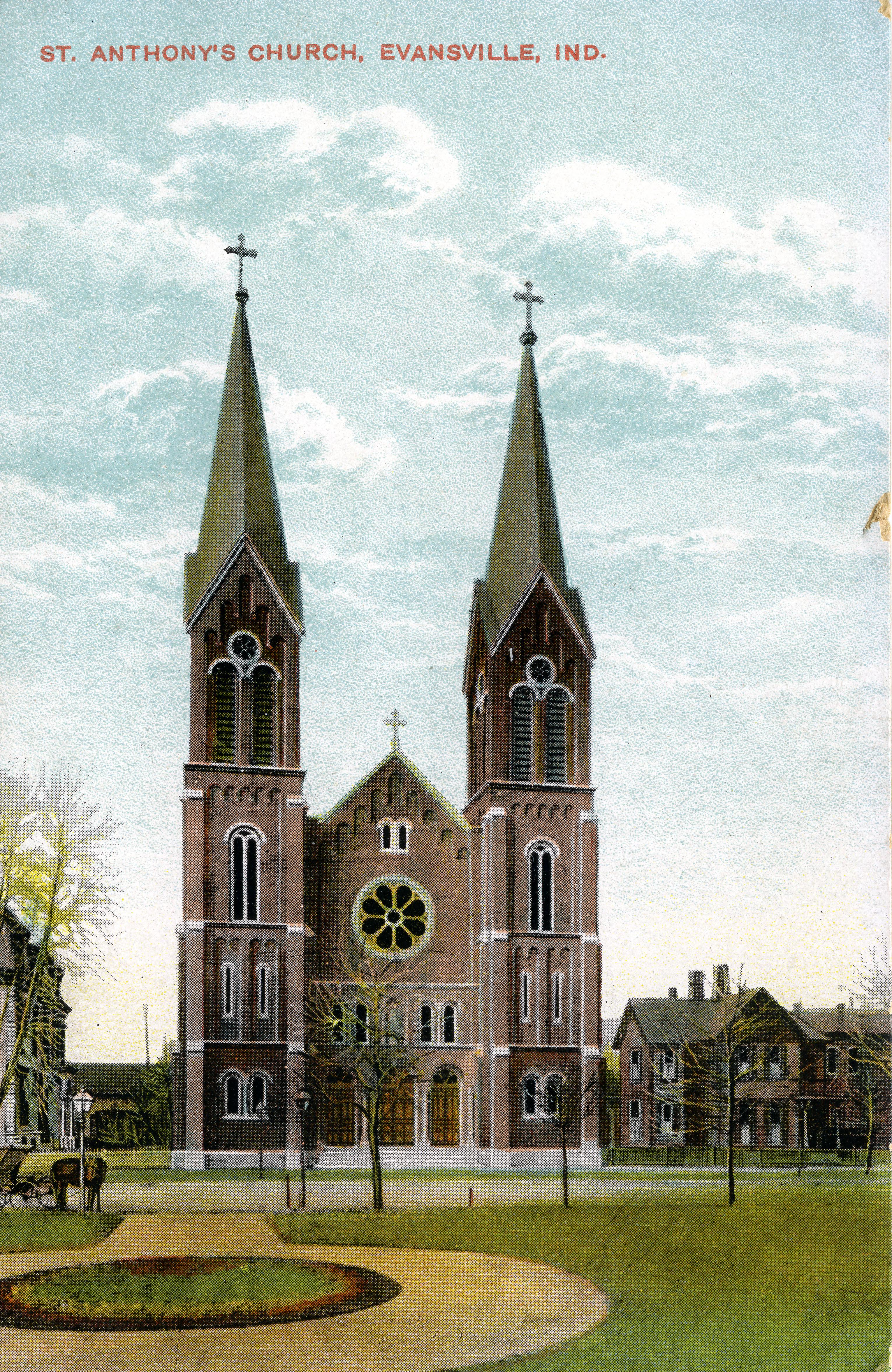 In 1888, Rev. Joseph Schuck, a 23 year-old native of Germany, became the first pastor and began plans for a school that would house a provisional church on the second floor. Within weeks, Father Schuck was forced to step down as pastor because of poor health and was replaced by Rev. Kasper Seiler. While the church-school was being built, Mrs. Reis provided Father Seiler a temporary room in her home and offered the use of her attic for church services. On June 13, 1888, the Feast of Saint Anthony, the new parish celebrated its first Mass and continued to hold services in the attic for the next four months. On November 4, 1888, Mass was held for the first time in the new parish building. The parish grew so rapidly that preparations soon began for the construction of a larger church, separate from the school. Brother Adrian O.S.F., a renowned architect from Saint Louis, was chosen to design the church. On Pentecost Monday, May 25, 1896, the church was ready for its formal consecration. The ceremony began at 7 a.m. and was attended by more than 25 priests from Southern Indiana, Illinois and Kentucky. Members of Evansville�s Catholic parishes assembled at Holy Trinity Church and paraded to Saint Anthony to attend the Pontifical High Mass. The 290 families in the new parish pledged $17,000 for the new church, and donations from other parishes and pew rent (a payment for the right to sit in the same pew each Sunday) would help offset the remainder of the costs. In 1888, the Sisters of St. Francis of Oldenburg, Indiana were called to conduct school. The Franciscans would represent the only religious order teaching at Saint Anthony until 1975. In 1927, enrollment at the school had grown to approximately 400 pupils and a new school and parish building was built and dedicated in June of 1932. Saint Anthony School continued to serve school families until 1987. That year due to declining enrollment, Saint Anthony School consolidated with St. Joseph School as Ascension Elementary School. One year later, Ascension School closed. Today, Saint Anthony�s Church has been restored to its former splendor. The parishioners continue their mission to serve the poor in Evansville. The former school is now known as the Center for Family Life, or CFL, and is home to the church cafeteria, gym, chapel, meeting rooms, and Parish Offices. (http://allsaintsevansville.org/about-us/history-of-st-anthony/) Today St. Anthony is part of All Saints Parish, with St. Joseph Catholic Church. This postcard was printed in Germany.