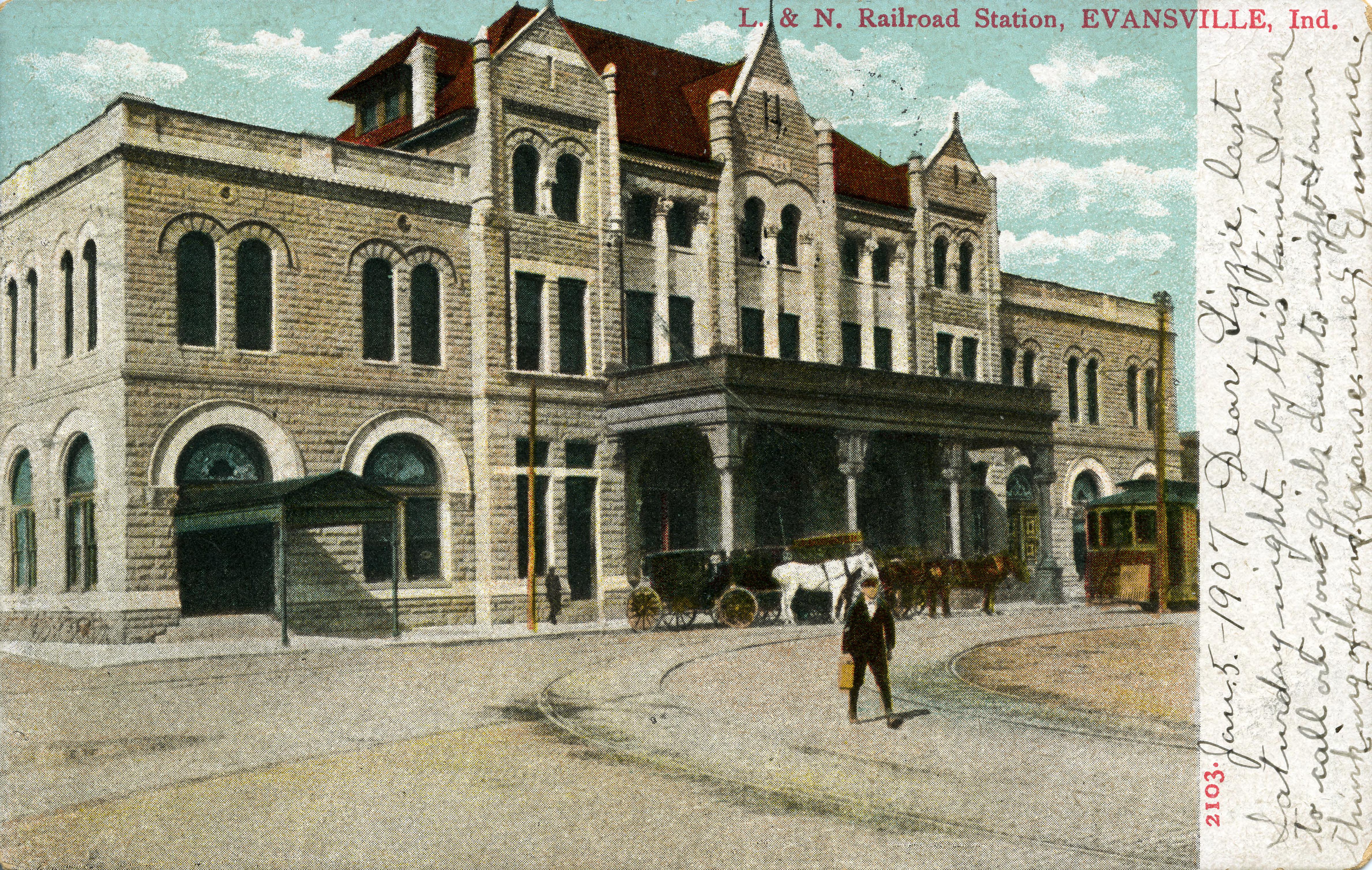 L & N RR (Louisville & Nashville Railroad) Station at 300 Fulton Ave., formerly 214 Fulton Ave., aka Union Station. Built in 1902, as the popularity of passenger rail declined, this was vacated in 1975 and razed in 1985 when restoration plans failed. A handwritten note, dated Jan. 5, 1907, reads, "Dear Lizzie, last Saturday night by this time I was to call on your girls and tonight I am thinking of you (excuse me) Emma. This is postcard 2103. It was made in Germany.