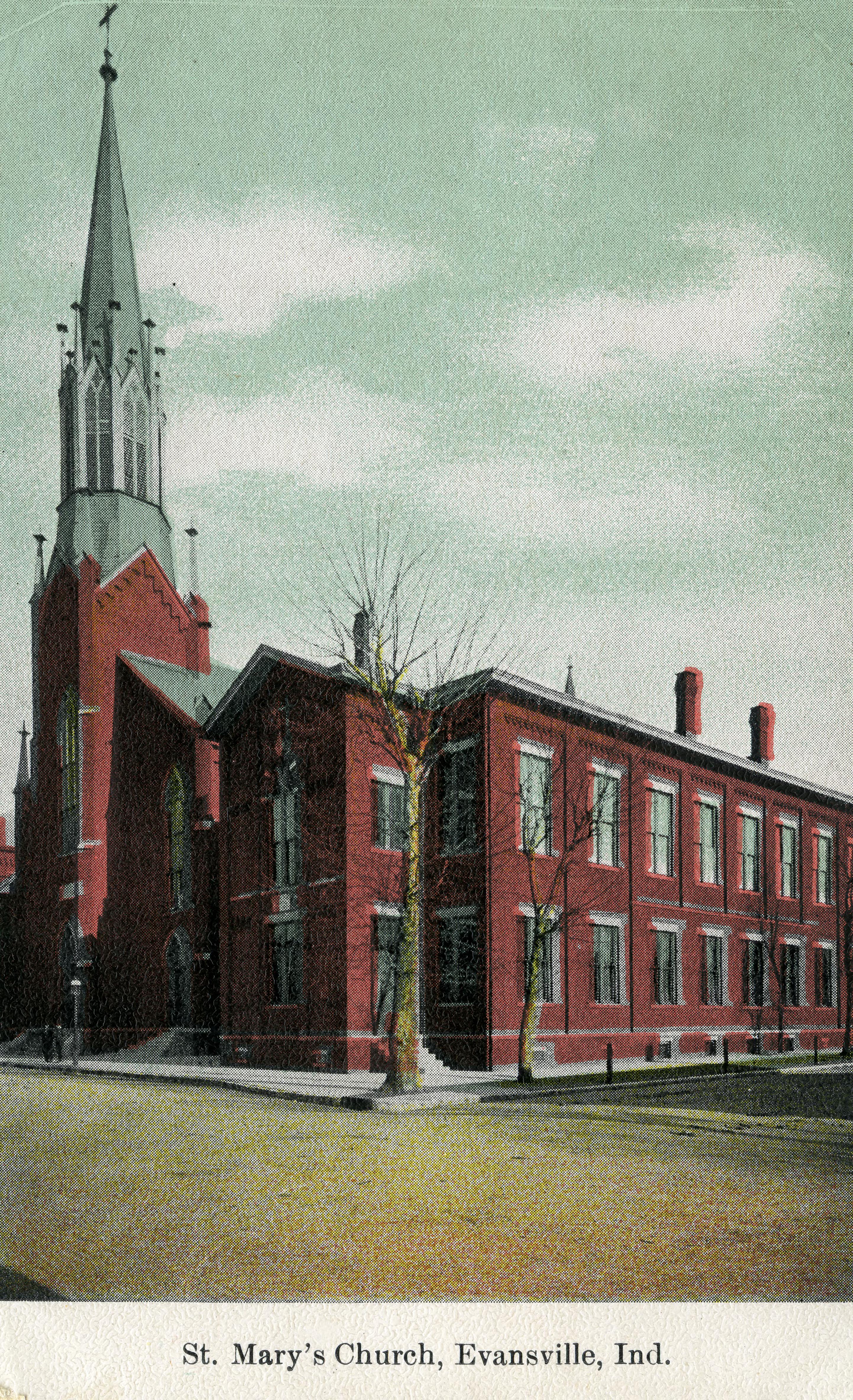 St. Mary's Church at 613 Cherry St. "Like a number of communities along the Ohio River, Evansville was growing. The decade between 1860 and 1870 saw the population of the city double from a little over 11,000 people to almost 22,000 people. Of these 22,000, four fifths were either direct German immigrants or had German ancestry. Some belonged to the Evangelical tradition, but most were either Lutheran or Roman Catholic. Between 1834 and 1857, Evansville had only one Catholic Church, Assumption, to serve all Catholics regardless of nationality. It was an �English speaking� church, generally. In 1857, Holy Trinity became the second Catholic Parish in Evansville, and it was �German speaking�. While the Mass, most sacraments, and even Benediction were conducted in Latin, certain other aspects of spiritual life were conducted in the language of the people. Preaching, the Sacrament of Reconciliation, wedding vows and most popular devotional activities were conducted in the vernacular. Holy Trinity was the only German speaking church between St. Philip in Posey County on the west, and Rockport in Spencer County on the east. Soon Trinity too was bulging at the seams. In 1866, James Maurice de St. Palais, bishop of the Vincennes Diocese, recognized the need for another �German speaking� Catholic church in Evansville, and appointed the Reverend Johannes (John) Viefhaus, assistant pastor at Holy Trinity, to found it and serve as pastor. Fr. Viefhaus purchased five lots in the old eastern subdivision which had been platted by Robert Evans and John Shanklin in 1839 and erected a brick school building at the corner of Upper 6th and Cherry Streets. This two-story brick building cost $5,000.00 The siting of the parish facilities was important, because the new parish boundaries would stretch from Main Street in Evansville all the way to the Warrick County line on the east. The immediate area surrounding the new church ground was already densely residential on the standard average 25 foot wide lots. There were lots of people to take care of. Plans began immediately for the erection of a large brick church. Ludwig Reidinger of Lawrenceburg, Indiana, was the architect and Bishop St. Palais laid the cornerstone on 28 October 1866. The church was placed under the patronage of St. Mary of the Immaculate Conception. Holy Eucharist was first celebrated in the church on 23 December 1867 and the building was dedicated on 1 January 1868. The cost of the building and its furnishings, including altars, pews, bells and organ, was $60,000.00. In use daily, this worship space remains now as the oldest standing Catholic church within the city of Evansville. In 1871, the Franciscan sisters of Oldenburg, Indiana erected a second brick school building on the property. This three-story facility provided school rooms for female students and housed the sisters� residence. The older school building, in true Germanic custom, was allocated for the education of the male students. By 1880, there were approximately 400 students at St. Mary School taught by four Franciscan sisters and one lay teacher, Professor Steinhauser, who did double duty as principal. The Parish House, a two story edifice, also of brick, was erected adjacent to the church in 1881, to house the pastor and new assistant. After 26 years as pastor, Father Viefhaus resigned in 1892. He retired to a Carthusian monastery in Germany where he died in 1916. Over the next 50 years, many changes and upgrades were added to the parish plant. The facades of the buildings received a faux stone veneer called �sham-rock� about 1900, and the other exterior walls were coated with a stucco. The chancel of the church received its initial marble floor around 1916 and a new Estey Pipe Organ was installed in the loft in 1918. This instrument cost $9,300.00. During this era also, a steam heat boiler and electricity were introduced. A fire in 1937, probably the result of faulty wiring, caused significant smoke and water damage, but overall structural damage was minimal. The cost to repair and renovate the church in that depression time was $33,000.00. Records from that period tell us that the Chancel was expanded somewhat and more marble flooring added, that the choir loft was cut back some 20 feet, and that decorative capitals were added to the ribbed columns that form the nave. The stained glass window in the ceiling of the apse is thought by some to have been added at the same time. The 1937 flood did not reach into the buildings, but did puddle on Cherry Street directly in front of the facilities. New windows, by Frei Studios of St. Louis, were installed in 1941, and a new Wicks pipe organ the following year. In 1940, a new suite of rooms, including the �tower� corner were added to the Parish House, and in 1944, the boys school building was remodeled into a facility with a large dining room, kitchen, club rooms and auditorium. The old boys� school is now named Rager Hall after Reverend John C. Rager who served the parish for 26 years as pastor. The 1950s saw the installation of the Terrazzo floor in the church and the Bedford stone vestibule additions to the front church. The church became the first Catholic church within the city of Evansville to be air-conditioned in 1962, with the AC units placed in the choir loft. Because of substantially declining enrollments, the grade school closed in 1973. The building was remodeled in 1996 to provide administrative offices, meeting rooms, Christian education space, a chapel, a library and a food pantry. It is now called the Ministry Center. By the 1980s, Evansville�s downtown area had seen residential flight to the suburbs. The fabric of the church building was showing its age with crumbling plaster and peeling paint; the steeple was leaning; there were no immediate rest room facilities; wiring posed a huge risk; and the changes in Catholic liturgy demanded more than a stop-gap fix. A capital campaign to remedy all 