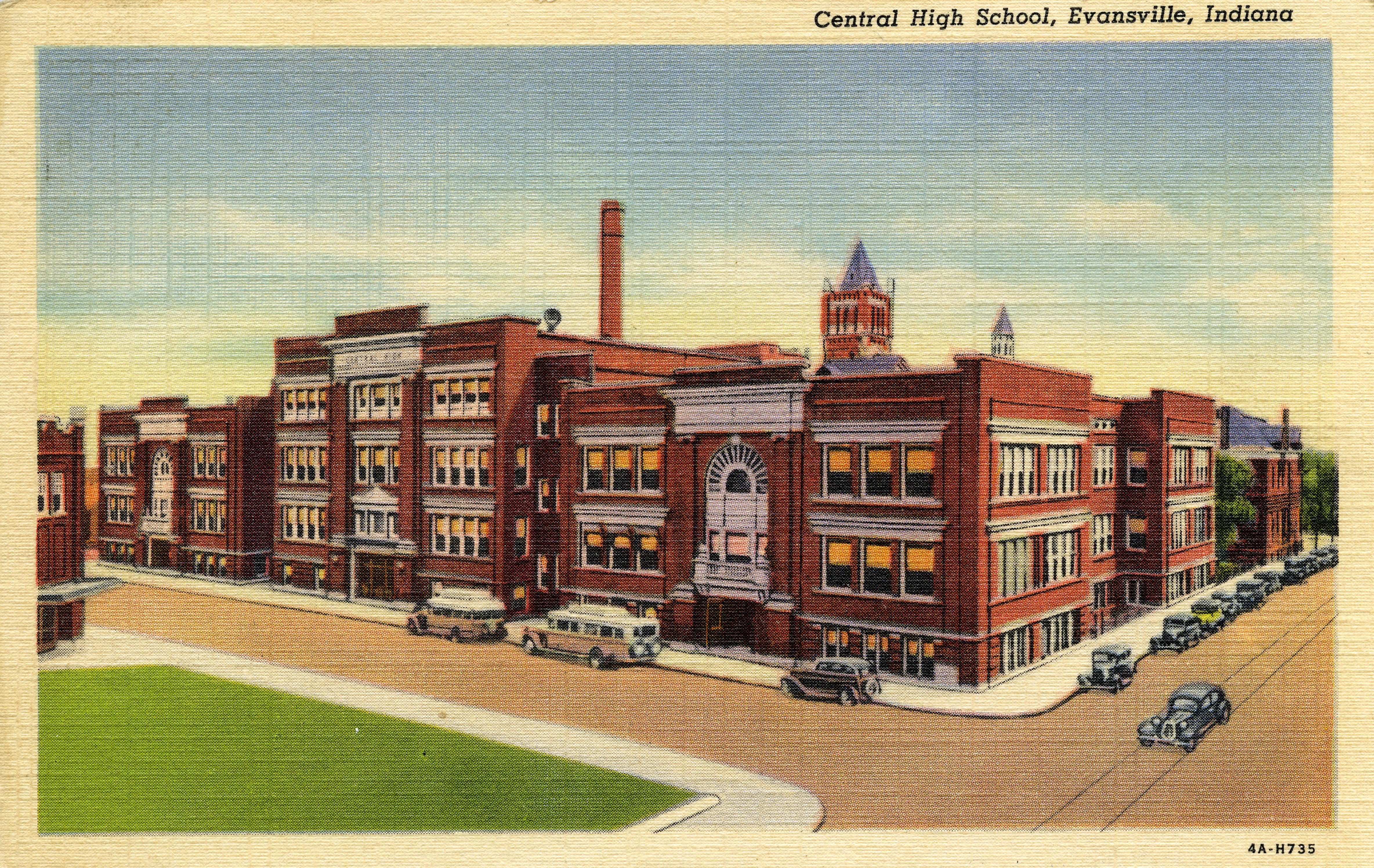 After having classes in various buildings, Evansville High School found a permanent home in 1868 on Seventh Street between Vine and Court Streets--the official address was 203 NW 6th St. In 1898 the tower and north and south wings were added. By 1918 the population of the Evansville had grown to the point where another high school, further west, was needed and Francis Joseph Reitz High School was built. At that time, the facility seen here became known as Central High School. In 1971 a new Central was built and this building was closed, and razed in 1973. The one exception was the gymnasium, which still remains today and is part of the current downtown YMCA. This is postcard 4A-H735. Text on the back calls this "one of the oldest and largest free high schools in the United States. Enrollment approximately 2000. Valuation approximately $650,000."