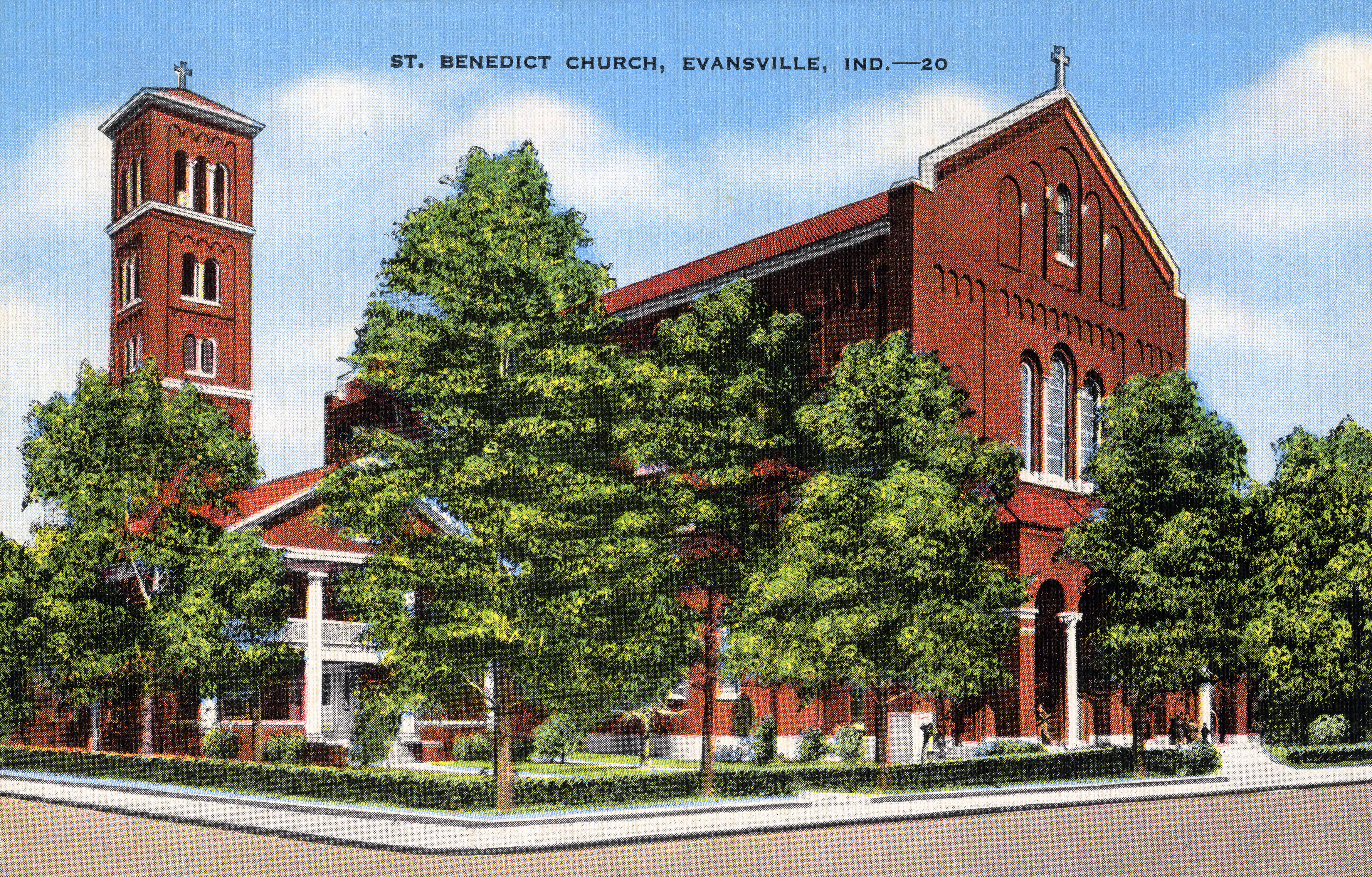 St. Benedict Catholic Church at 1328 Lincoln Ave. "St. Benedict Parish was established in 1912 on the far east side of Evansville. The pastoral care for the parish was given to Benedictine Monks from St. Meinrad Abbey from the beginning. The founding families set out immediately to gather on Sundays for Mass and to provide for the education of their children, guided by the efforts of the Benedictine Sisters of Ferdinand. In 1913, construction was begun on a building that would house almost all the functions of the parish: a church, classrooms, housing for the Sisters, and a cafeteria. We now call this building St. Meinrad Hall. In short order, the founding pastor, Father Martin Hoppenjans, OSB, led the community in putting up a convent and a rectory. The present church building was completed in 1928 in the Lombard-Basilica style. It was dedicated March 18, 1928, by Abbot Athanasius Schmidt, OSB. The cathedral features ceilings that are 65 feet high, a baldachin over the altar and a seating capacity of over 900 people. A second school building, St. Scholastica Hall, including an auditorium, cafeteria, and gymnasium, was completed in 1953. The most recent construction, St. Benedict Hall, was completed in 2004 and houses offices, classrooms, and parish meeting rooms. The church was renovated after the liturgical reforms of the Second Vatican Council. The baldachin was moved forward about 25 feet and the former high altar was dismantled and the new altar was created. Two of Evansville�s bishops were ordained and installed in St. Benedict�s before it became a cathedral; Francis R. Shea in 1970 and Gerald A. Gettelfinger on April 11, 1989. On October 21, 1944, Pope Pius XII established the Diocese of Evansville. Assumption Church, Evansville������s oldest Catholic parish, was chosen as the first cathedral. The property was sold to the city of Evansville who demolished it in 1965 for the new civic center. Holy Trinity, Evansville�s second oldest parish, served as the Pro-cathedral from 1965 to April 11, 1999, when St. Benedict�s was consecrated as the third cathedral for the Evansville Diocese. (https://www.saintbenedictcathedral.org/about-us/) The back of the postcard bears the number 32157N. The front has a 20 after the location. This is postcard 32157N.