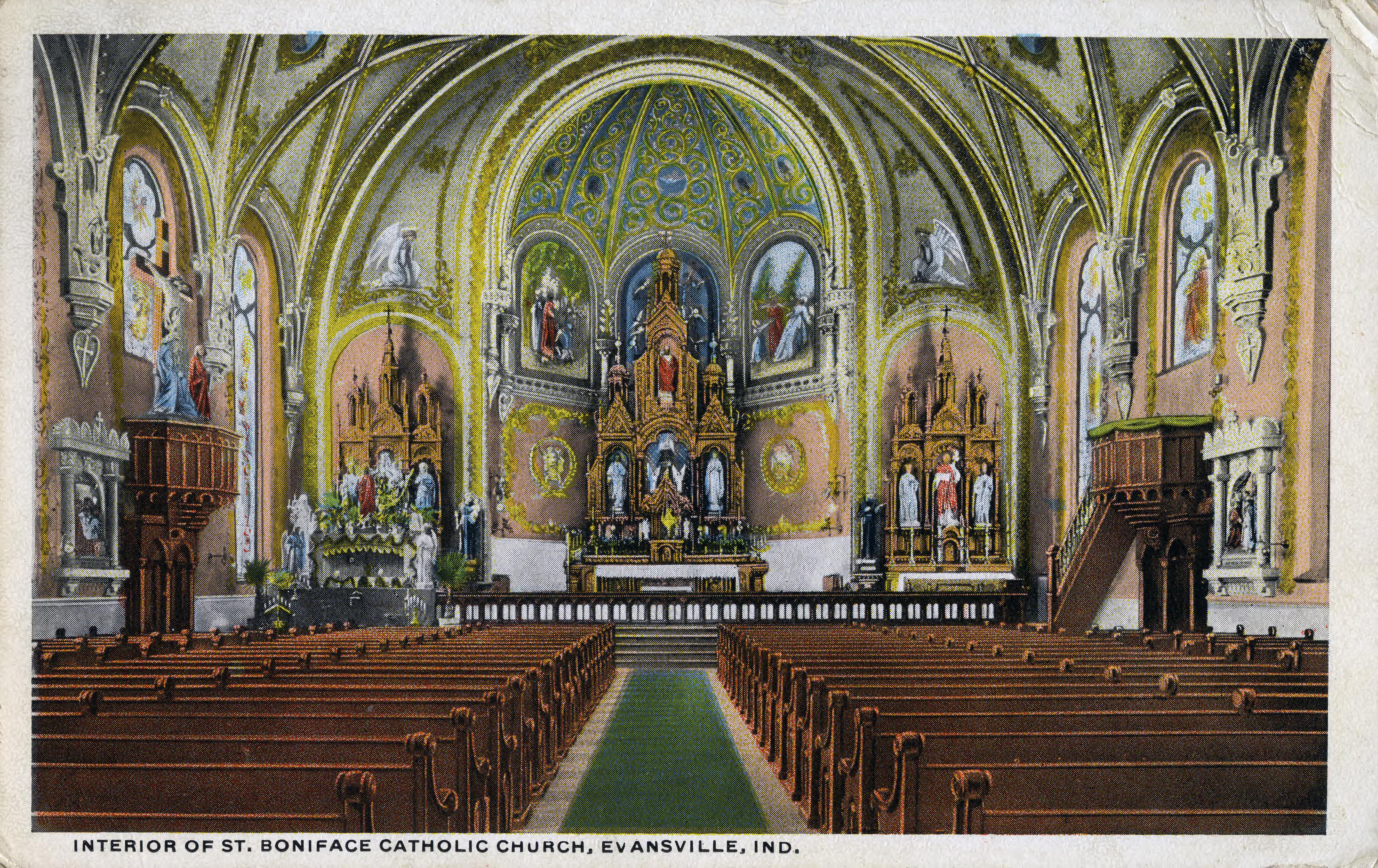 Sanctuary of St. Boniface Catholic Church at 614 Wabash Ave. "St. Boniface was established because of travel for the large German population living in the northwestern portion of the city. Its territory formerly belonged to Holy Trinity parish, however, it was remote and inconvenient for many. The first move to build this church was a meeting of prominent Catholic Germans at the residence of Mr. Charles Schulte in October 1878. The land for the church was a lot bounded by Wabash Ave, Michigan St, 10th Ave and Virginia St. It was purchased by five Catholic gentlemen (Adam Helfrich, Charles Schulte, August Rosenberger, Henry Rietman, and Theodore Rechtin) in 1878 for $5,000. Soon after a letter was sent to the bishop of the Diocese of Indianapolis setting forth the facts. On January 4, 1880, Rev. Bishop Chatard visited Evansville and received the deed to the property from the gentlemen. He appointed Rev. William Bultmann as pastor thus creating St. Boniface's parish. St. Boniface became the fourth parish and the third of the German-speaking Catholic congregations in Evansville. The first church was a temporary wood frame building. Construction began February 1, 1880 and it was built within one week. After two months an addition had to be made to accommodate the people, and in less than a year later this building was torn down to give room for the first St. Boniface. The cornerstone of the original church was laid on September 4, 1881, and construction moved rapidly. The building, shown above, was dedicated on April 27, 1882 with a final price tag of $68,000. It was 70 feet wide, 147 feet long, and the spires stood 202 feet. On March 30, 1902 (Holy Saturday), the church building was struck by lightning at 11:30pm. A fire broke out and raged on through Easter morning. Only the 12 inch brick walls were left standing, and a few of the valuable articles were saved. Still, the parish was undaunted. No sooner had the flames completed their devastating work when plans were made to rebuild the church superior in beauty and size to the one destroyed. The original walls were used, gables where added and the steeples were lowered to 175 feet. The construction costs totalled $62,000, and the building was rededicated later that year. Over the years, the present church (shown to the right) has remained remarkably true to its original state. Several renovations over the years, including most recently in 2006, have preserved its integrity and earned the church a spot on the National Register of Historic Places. The rectory, or parsonage, is the oldest remaining building on the St. Boniface campus. Originally, the priest stayed in a home on Wabash Avenue across from the church. The current rectory, a Queen Anne, red brick with white stone trimmings, was built in 1892. It is a substantial building complementing the larger homes across Wabash Avenue. The wrap around front porch was an early 1900s addition. The first school was a small frame building about one block away from the original church. It was erected in the spring of 1881, though by 1885 a new school was needed because of overcrowding. The second school, built at the corner of Michigan Street and Wabash Avenue. The six-room building cost $10,000 and was dedicated in December 1885. The sisters' home was also in the school until they got their own building in 1907. The school served the parish well until it was replaced with a more modern building in 1923. It was eventually torn down in 1951 and made into the current parking lot. A new and larger school (present building) was built in 1923 on the west end of the lot. It was brick and stone and had a had a labratory, an office, an auditorium, a gymnasium, and a cafeteria. When the school opened, the Ursuline Sisters from Louisville who taught there temporarily stayed at the original St. Mary's Hospital in the old Marine Hospital on Ohio St. The parish obtained a house on the southwest corner of Virginia St and 10th Ave in November 1881. The sisters stayed at this home (which is still standing) until 1886 when they moved into the second school building mentioned above. In 1907, a 15-room, state-of-the-art sisters' home was erected. It was a two story brick Georgian revival building designed by Harris & Shopbell. It is still standing on the south side of the block, but it was vacated in November 22, 1978 due to shortage of nuns."(http://www.saintbonifaceevansville.com/) Since 2014 this church is part of a three part parish, along with Sacred Heart of Jesus Parish and the former St. Agnes, Virgin and Martyr Parish.