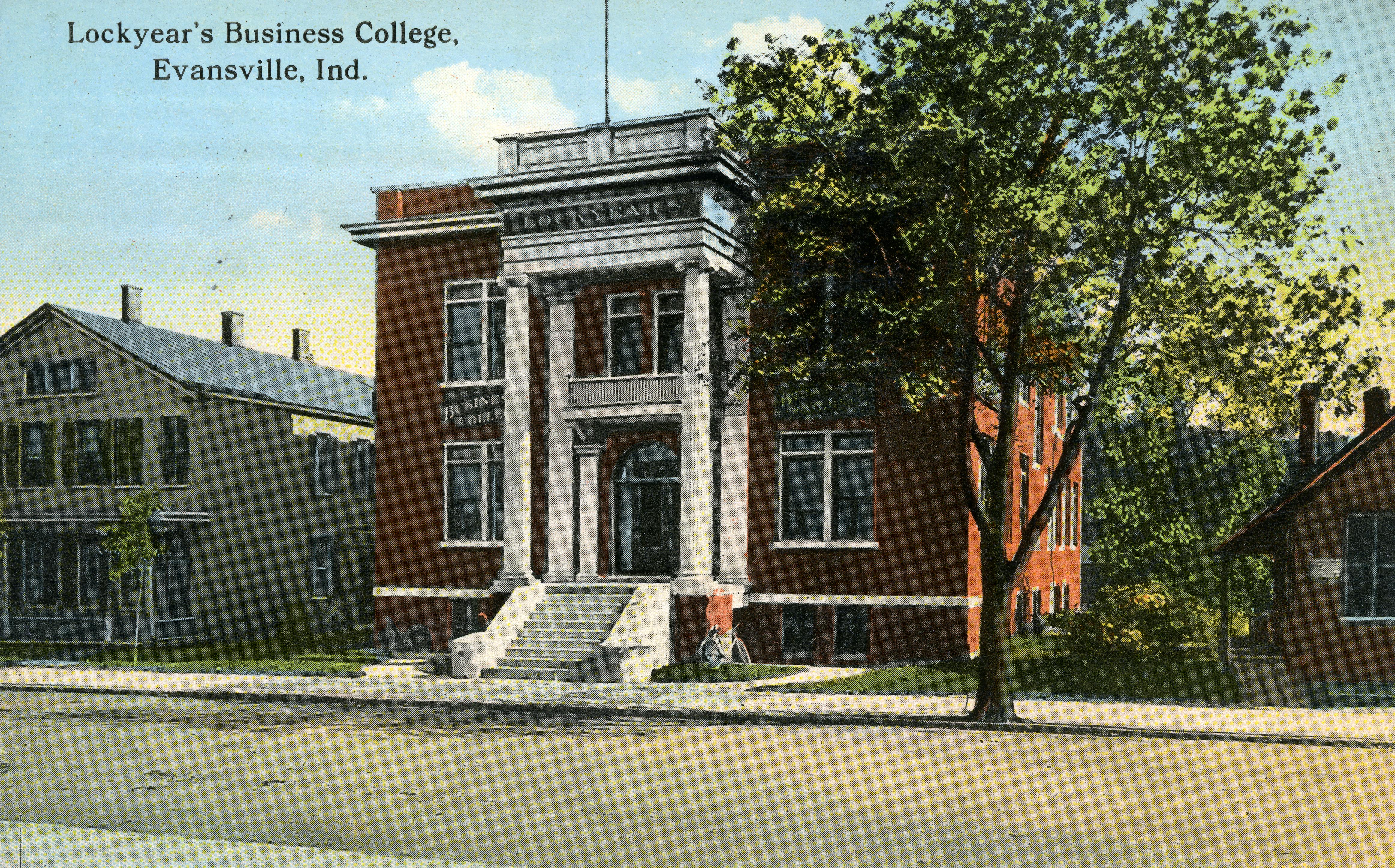 Originally named Columbian Business College when it opened in 1893 at Fourth and Main Streets (seen in RH 033-541), the institution became known as Lockyear Business College after Melvin H. Lockyear became president four years later. Continuing growth led to the new building on Fifth Street (seen here), which was erected opened in 1911. In 1975, Lockyear opened a branch in Indianapolis, but financial problems forced the college's closing in 1991. The building shown here was razed in 1993 and is now a parking lot. This is postcard A25232.