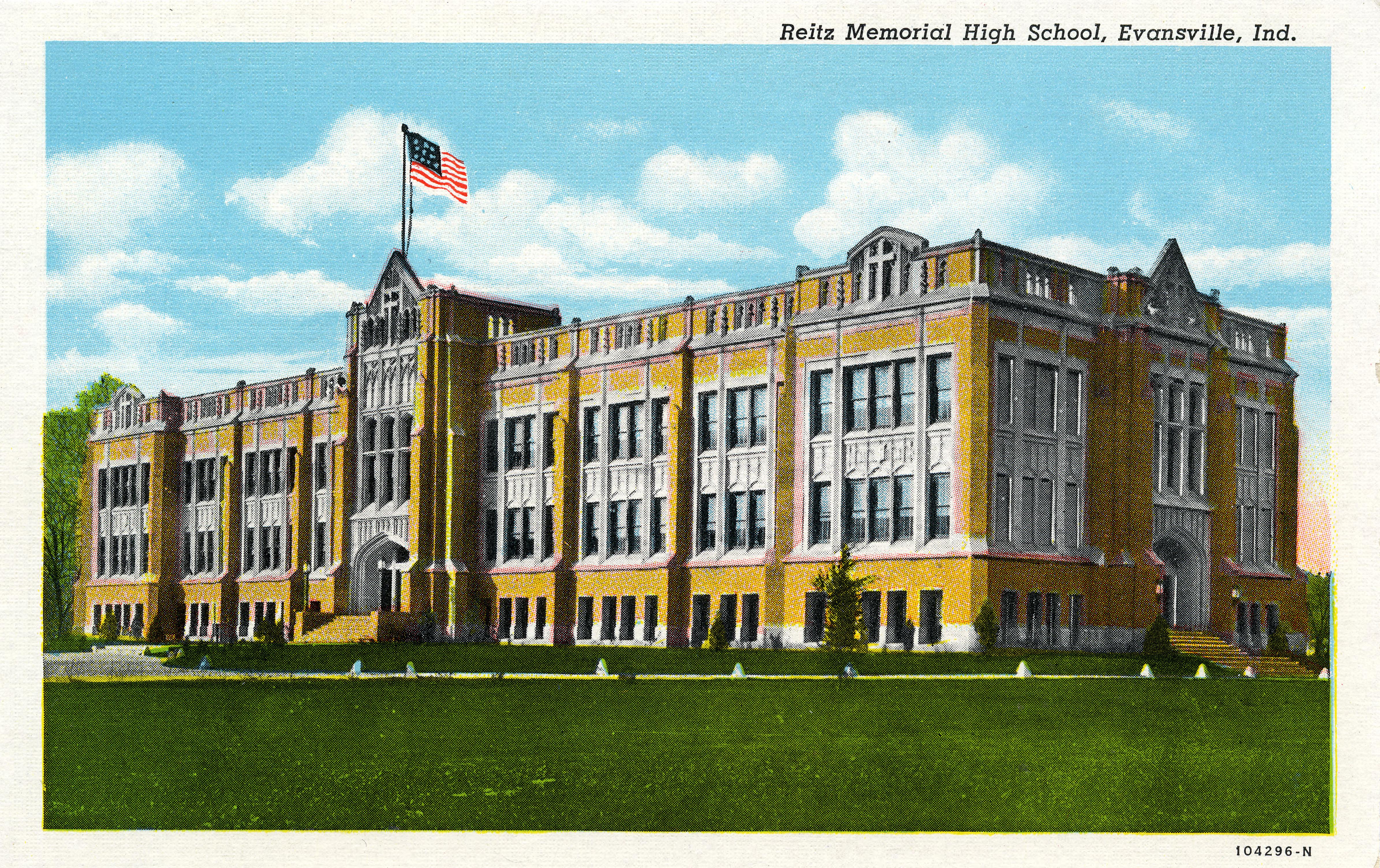 Reitz Memorial High School at 1500 Lincoln Ave., originally 1700-1800 Lincoln Ave." In 1922, Francis Joseph Reitz pledged money for the original Memorial High School to be built. Before he purchased the 13-acre tract of vacant property on Evansville�s Lincoln Avenue, Reitz had searched nearly a year for an appropriate site for the city�s new Catholic High School. A prominent local financier, Reitz demanded a location accessible by streetcar and near light, gas, and water lines. For his one million dollar gift to the youth of Evansville, Reitz was presented with the insignia of Knight and Knight Commander of the Order of Pius IX. The original school had 18 classrooms, an auditorium with a stage that doubled as a gymnasium, library, and cafeteria, along with a candy store, parlor, and a large recreation room. The building was designed by Edward J. Thole and constructed by Albert J. Hoffman. The three-floor building was constructed of Ohio gray brick with elaborate trimmings of Indiana limestone. Bedford stone sculptures around the three main entrances, the window apertures, and the roof pediment supplemented the building�s Tudor-Gothic design. Ornamental pillars at the entrances of the walks and driveways reinforced the utility of design. New Year�s Day, 1925, Reitz Memorial High School was dedicated by Bishop Chartrand of Indianapolis. Classes began January 5, and the boys were taught by the Brothers of The Holy Cross and the girls by the Sisters of Providence. In 1969, a new addition was added to Reitz Memorial High School. The new wing extending along Bennighof Avenue came with expanded first and second floors, a new gym, band room, and library. The new gym could hold up to 2,000 people. On July 7, 1998, groundbreaking began for a new addition to Reitz Memorial High School. The new $5 million west wing expansion was dedicated on January 21, 2000. This new building included eight new classrooms, two art studios, two science labs, a wrestling room, an auxiliary gym, and a state-of-the-art media center. Renovations to the existing building included all new windows and a new heating and air conditioning system. The new improvements have increased Memorial�s functional capacity to nearly 900. (http://www.reitzmemorial.org/history.aspx) NOTE: this school is called Memorial High School, to distinguish it from a public high school with a very similar name and funded by the same man--Francis Joseph Reitz High School. That school is called Reitz High School. Reitz is seen in RH 033-551 and 552. This is postcard 104296-N.