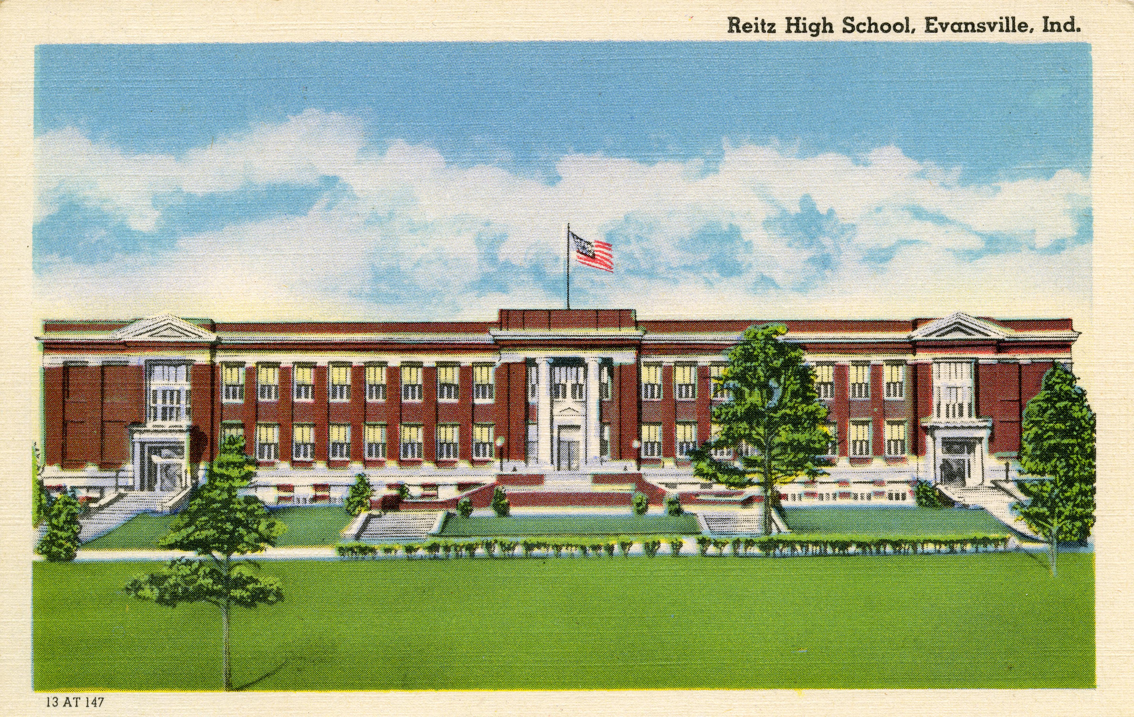 Francis Joseph Reitz High School at 350 Dreier Blvd. "In order to serve the west side of town, a second high school was planned to be built atop Coal Mine Hill. With financial difficulties from WWI, Francis Joseph Reitz funded the school's construction, and in turn the school was named in after him. On November 3, 1917 the cornerstone was laid with Mayor Benjamin Bosse presided over the ceremony. After a year of construction, the school opened in September 1918." In 1921, the Reitz Bowl was completed.".In 1926, a four-story classroom building was added to the west end of the building. Several changes to Reitz occurred in the 1950s. In 1956, another addition was added to the west end of the building. Then, in 1957, the five-story classroom wing that juts out was built, with the gym boxing it in. The school additions in the 1950s destroyed the beautiful entrance to Reitz High School as the new entrance was located on the northeast side of the school near the offices. In the early 1990s, Reitz was the oldest and smallest school in town. An east wing was built, and renovations helped to modernize the school. (http://historicevansville.com/site.php?id=reitz) Because of construction/additions to the front of this, this facade is no longer visible. NOTE: this school is called Reitz High School, to distinguish it from a Catholic high school with a very similar name and funded by the same man--Francis Joseph Reitz Memorial High School. That school is called Memorial High School. Memorial is seen in RH 033-548. This is postcard 13 AT 147.