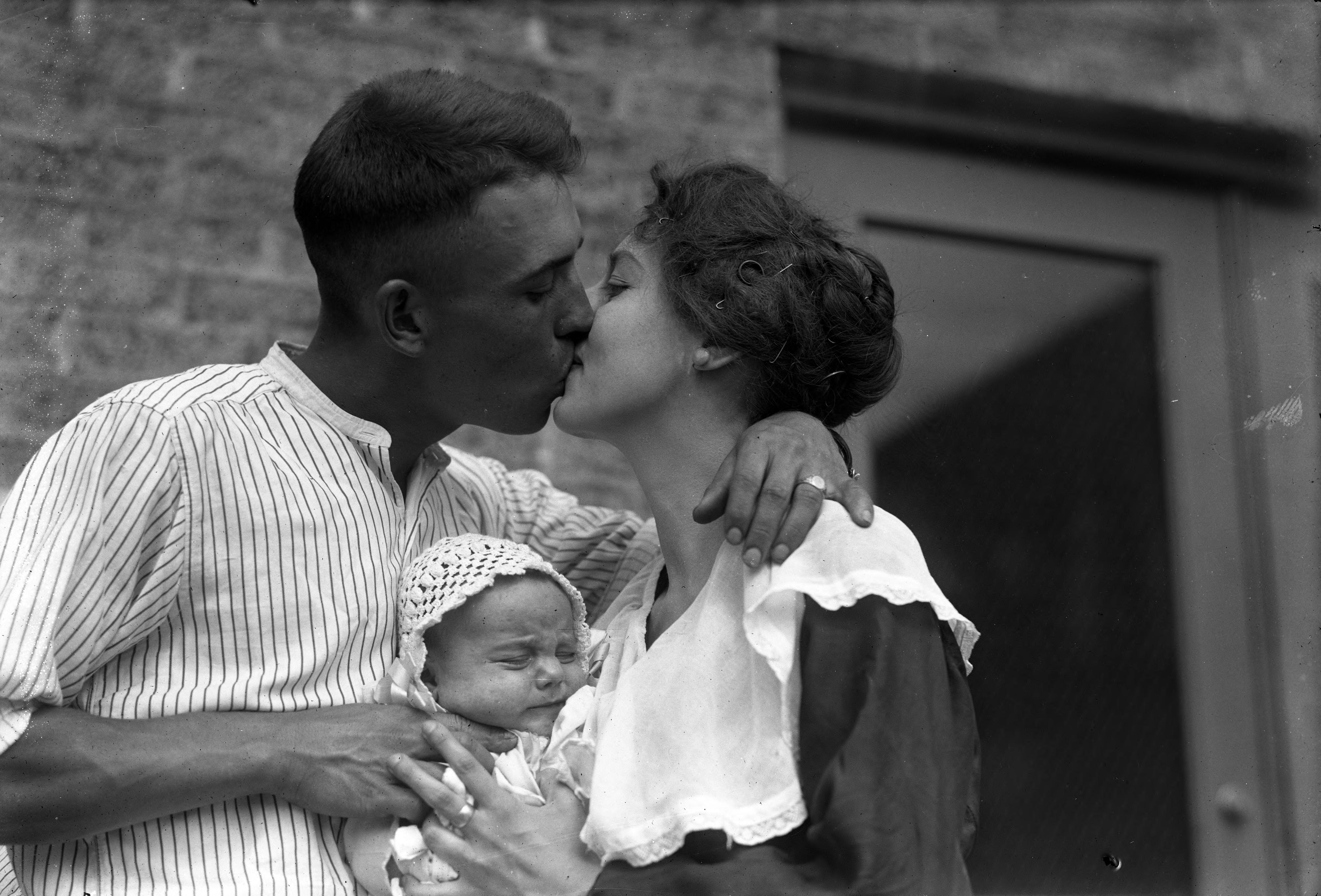 Soldier kissing wife goodbye with baby