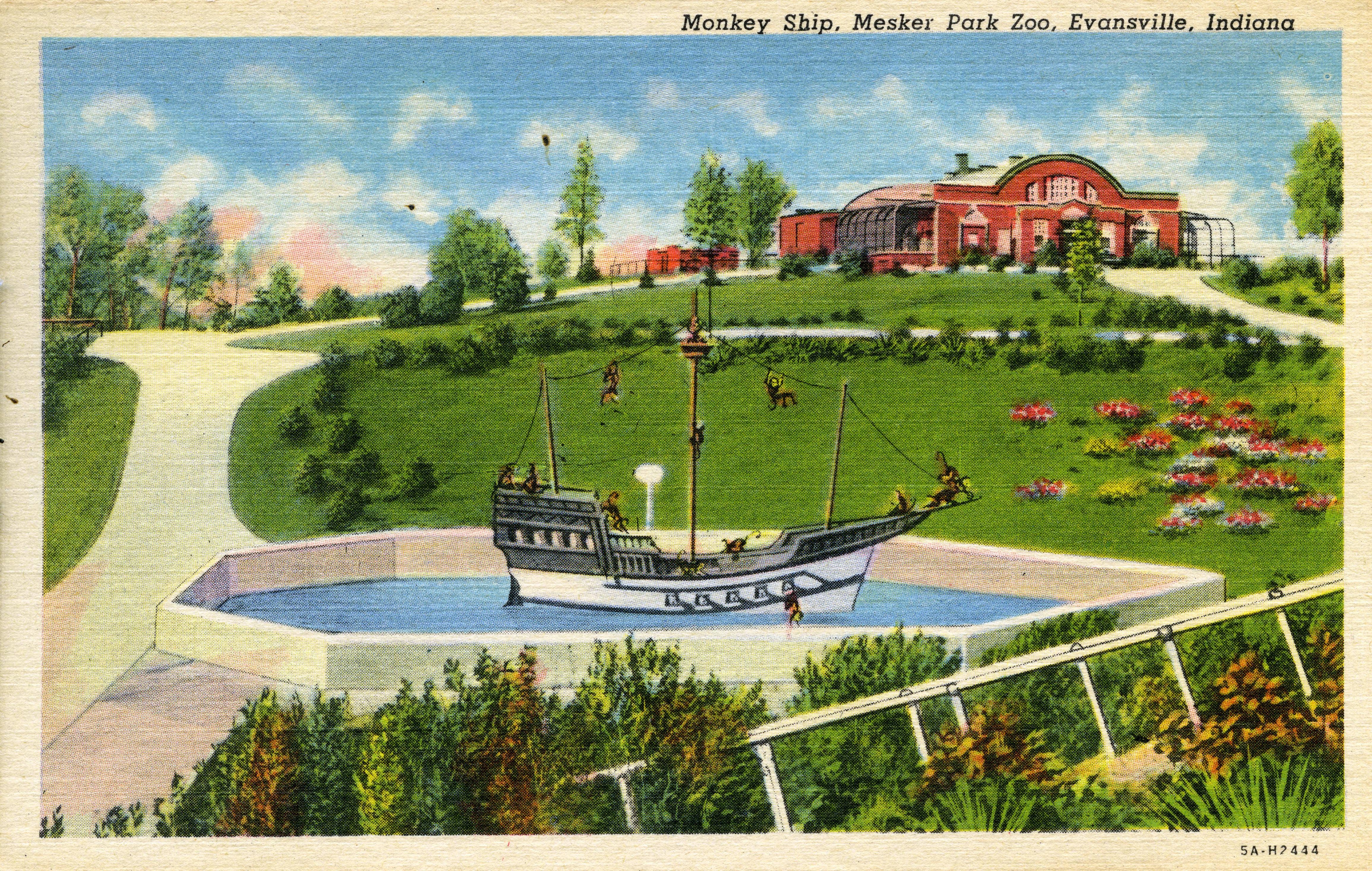 Monkey ship at the zoo at Mesker Park, a.k.a. Oak Summit Park, on west side of Mesker Park Dr. south of Wimberg Ave. It was laid out as a pleasure park in 1899 with many rides and concessions--it was the property of a street car company but open to public free. George Mesker, owner of Mesker Iron Co., donated the original 40 acres (across the street from Oak Summit Park) in 1900. In 1915 he donated $25k to acquire more land and improve the area. Around 1917 the two parks merged. The zoo was built on east side of Mesker Park Dr., opening in 1928 --one of first with a moat system. "Opened the summer of 1933, the Monkey Ship was a popular attraction at Mesker Park Zoo for many decades. A 1/3 scale, concrete replica of Christopher Columbus�s flagship the Santa Maria, the ship was christened by Georgia, one of the zoo�s chimpanzees, after a bottle of orange juice was broken over the bow. It was designed to house monkeys and opened with 18 rhesus monkeys that called the ship home from the months April to November. In later years, capuchins and lemurs were added and young alligators once swam in the moat surrounding the ship. The animals were removed from the display in 1991 and housed in enclosures that more closely resembled their natural habitats. On September 29, 1935, the Evansville Press reported that a female rhesus monkey named Sookie lead a �mutiny on the Santa Maria.� After she began leaping from the ship to the wall of the pond enclosure, a distance of about 15 feet, other monkeys began to mimic Sookie despite the fact she was the only one strong enough to make the jump. She was able to escape the ship and spent a reported 3 hours �vacationing� in a grove of nearby trees. (https://www.courierpress.com/story/life/2017/11/13/history-lesson-mesker-park-zoos-monkey-ship/857878001/) This is postcard 5A-H2444.
