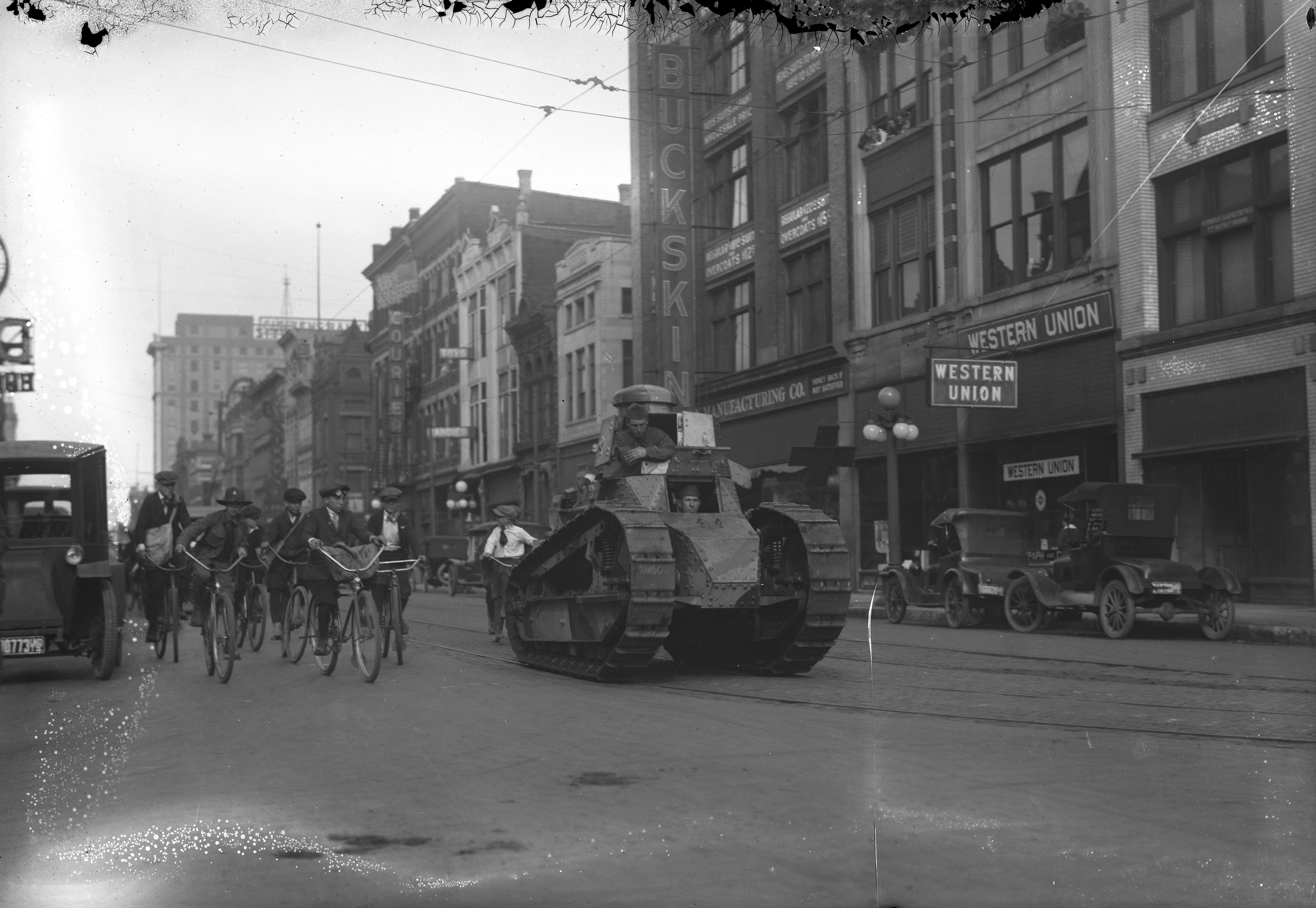 Tank driving down street, World War I era