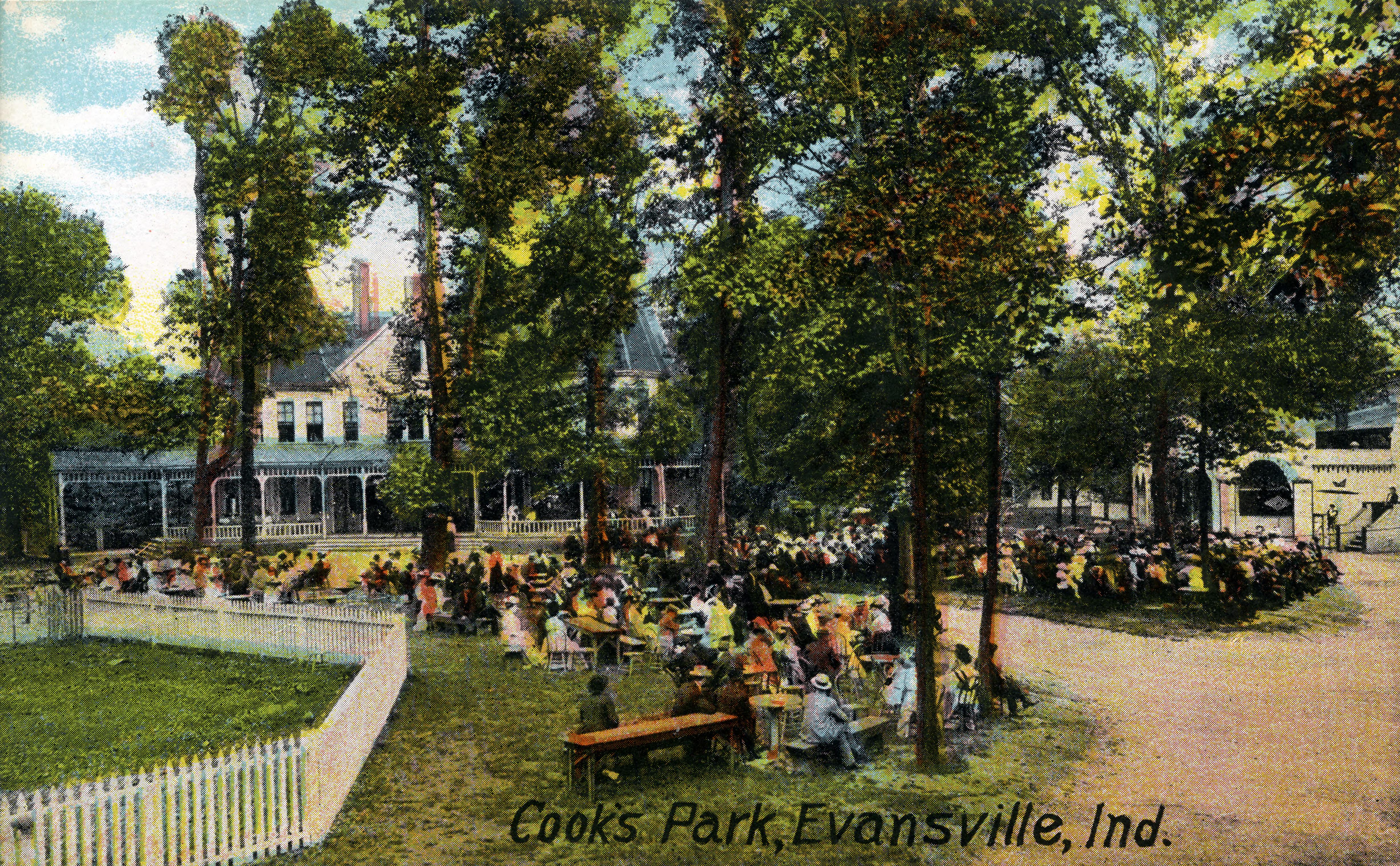 Cooks Park at what was formerly 410 Maryland St. Circa 1842, Nathan Rowley and Thomas Gifford cleared land around an old salt well, creating Pigeon Springs, which was a very popular health resort in the 1850s. It had a salt well, not a salt pool. It was located on the east bank of Pigeon Creek, where Columbia Street now crosses. It had extensive buildings for lodging guests who came to enjoy the rest and the mineral waters. William Bates, the proprietor, catered especially to the Southern trade. Cook Brewing took it over sometime between 1890-1895 and enhanced it by the addition of a clubhouse, lake, pavillion, and pool. It was also known as Exposition Park and later Pleasure Park. It closed during Prohibition and was subsequently razed.