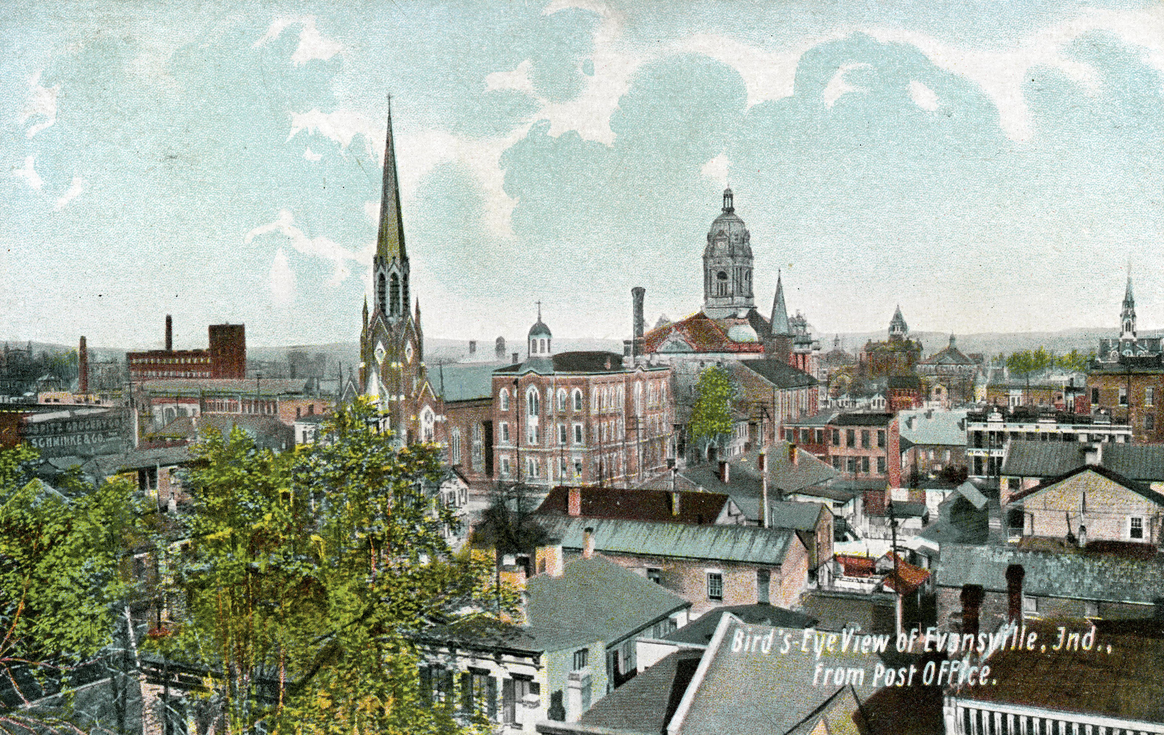 "Birds Eye View, Evansville, Ind. The cupola is the (old) Vanderburgh County Courthouse at 201 NW 4th St., built in 1890 to replace an earlier building and in use as a courthouse until 1969. It stands today. The church spire on the left is Holy Trinity Catholic Church 211 NW 3rd St., originally 12-16 Upper 3rd St. It was built in 1849-1851, and the steeple seen here added in 1873. A fire destroyed the church on Easter weekend April 3, 1950. Lightning struck the building overnight, and it burned to the ground. Services were temporarily held in the former school building until the present church was built. (The new church is very plain and modern and looks nothing like this.) The building shown here next to it (closer to foreground) is its school at 20 Upper 3rd St. It was built in 1869 and served as the Catholic High School, closed in 1948, and was razed in 1958. This postcard, Nr. C 1846, was printed in Germany.