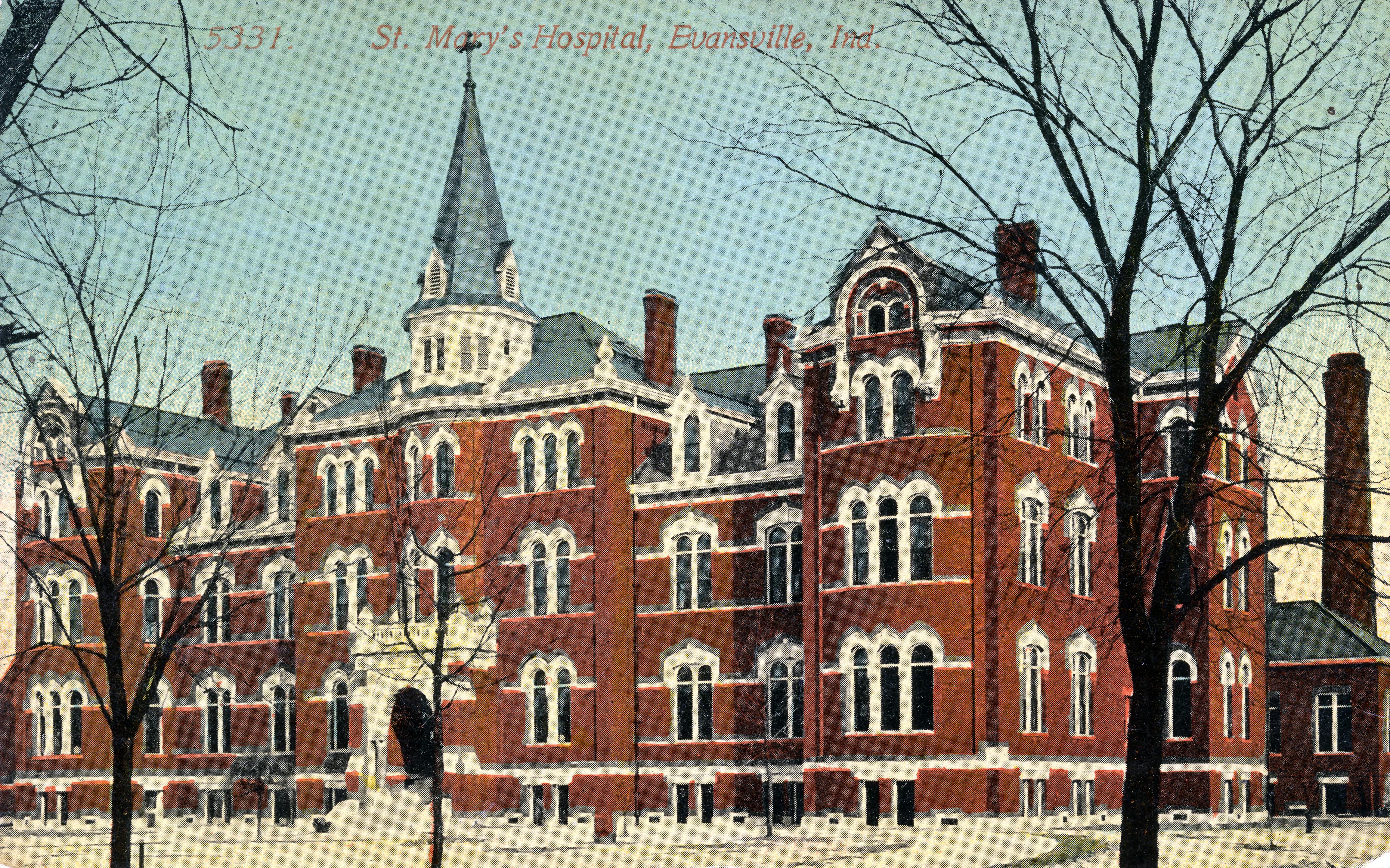 St. Mary's Hospital at what was formerly 1113 First Ave. This is the second location for the hospital; the hospital as an organization began in 1872, this location opened in 1894. An addition was added in 1922 and a nurses' home in 1947. On March 10, 1956, the hospital moved to its current east side location--all in one day. The location seen here was razed, with the exception of the addition, in 1960. The addition now houses medical offices, and a Hacienda restaurant is on the site of the hospital. This is postcard 5331.