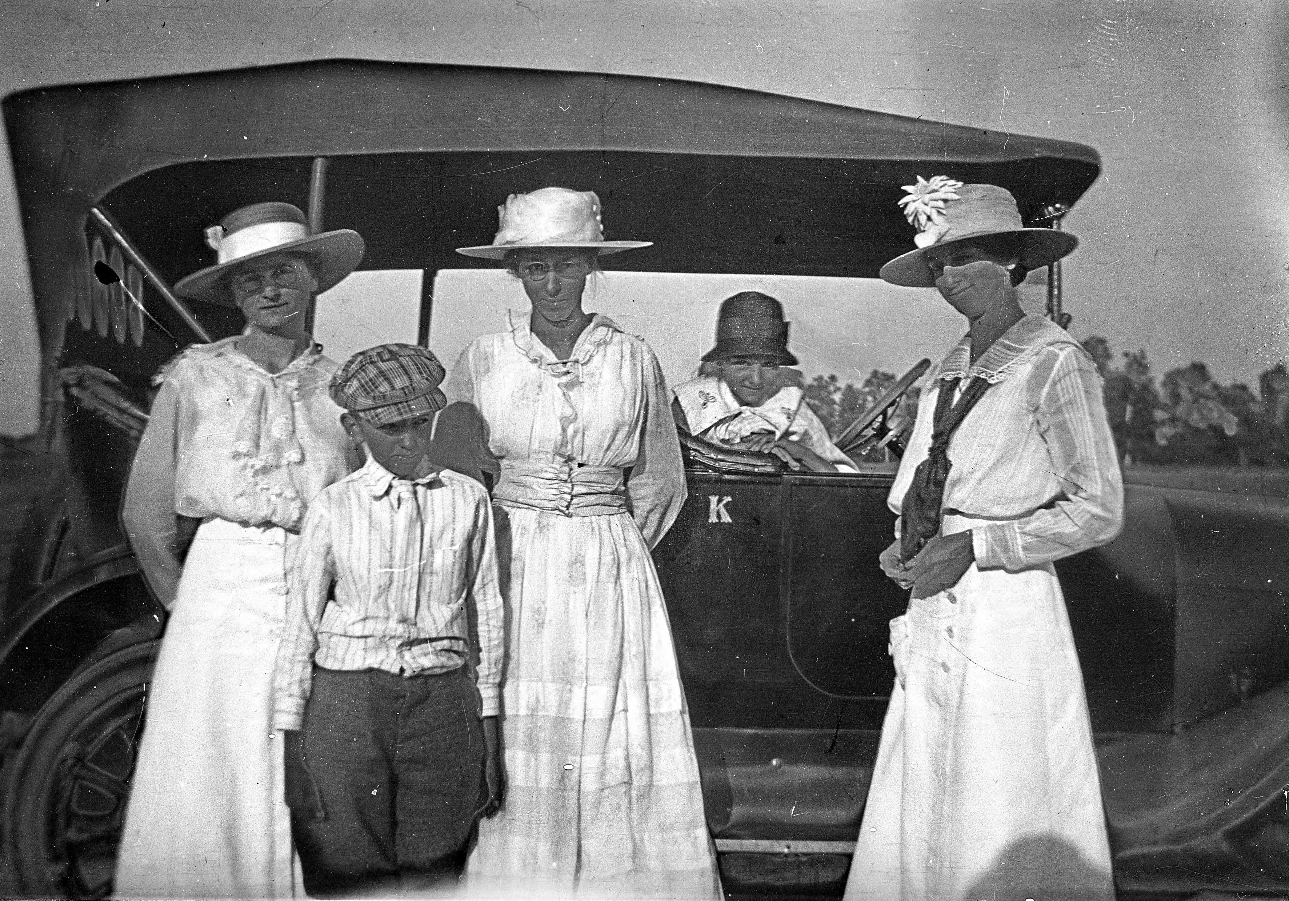 Women and children standing in front of and inside a car