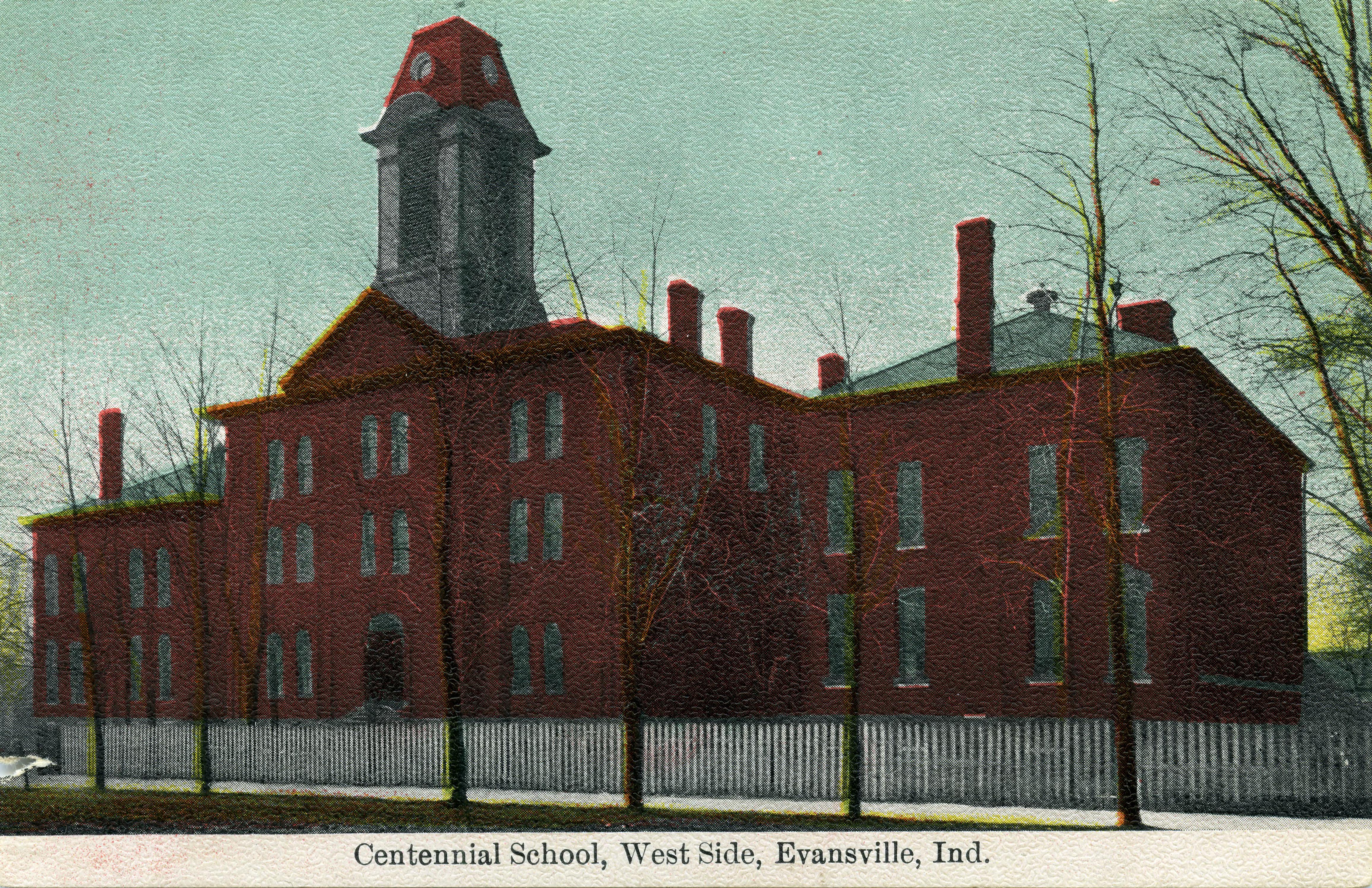 Centennial School at 112 N 12th Ave. was built in 1875-1876 to serve the growing population of the west side of the city. Additional wings were added circa 1895, 1910, and 1940. The school corporation built a newer school called Helfrich Park in 1965 and closed and sold this one to Mead Johnson. Also in 1965, public higher education came to Evansville in the form of a branch campus of Indiana State University, Indiana State University Evansville, or ISUE. ISUE classes were held in this building until 1969 when the campus moved to its current location. ISUE is now independent and renamed the University of Southern Indiana, or USI. Centennial School was razed in 1972.