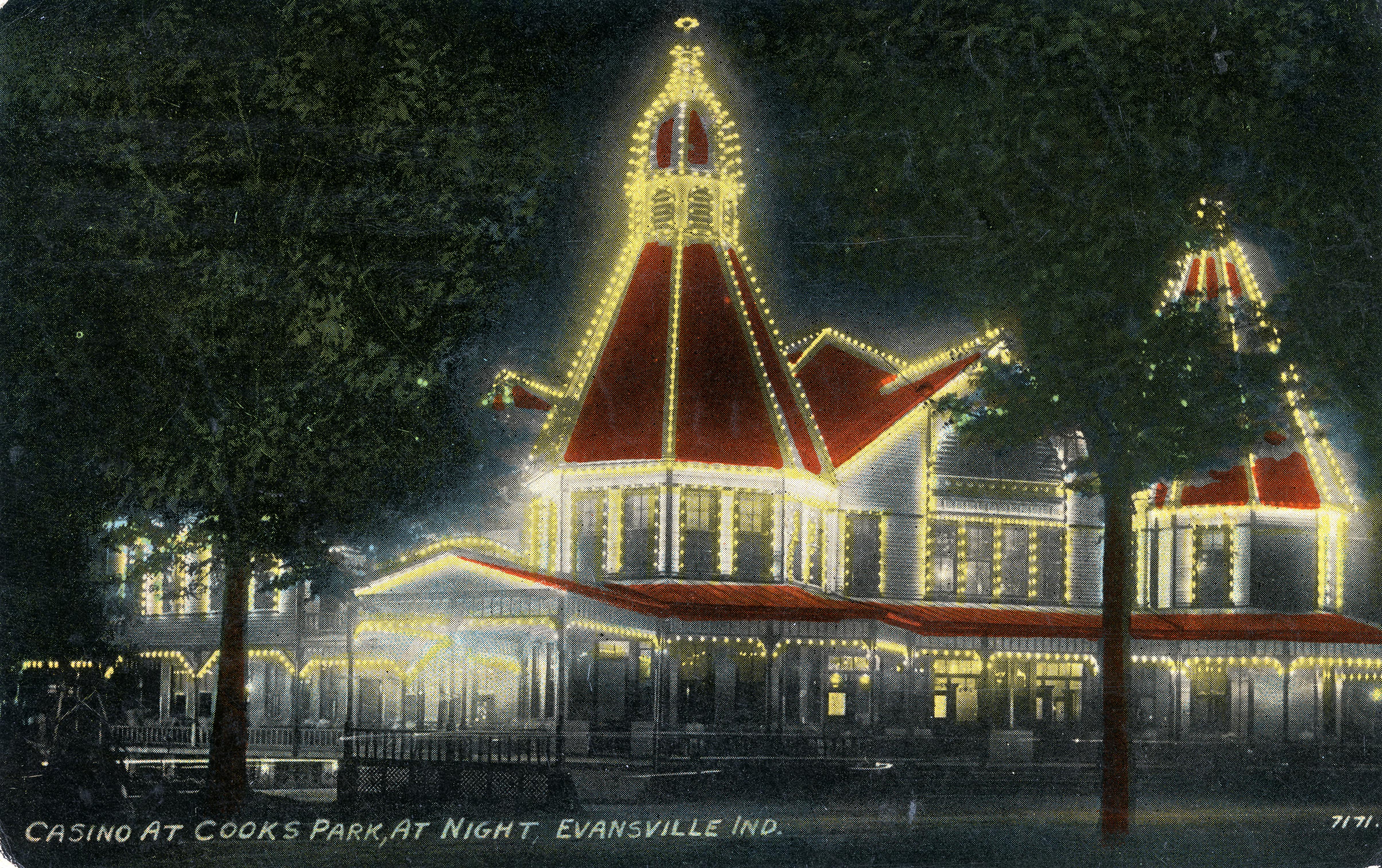 Casino in Cooks Park at what was formerly 410 Maryland St. Circa 1842, Nathan Rowley and Thomas Gifford cleared land around an old salt well, creating Pigeon Springs, which was a very popular health resort in the 1850s. It had a salt well, not a salt pool. It was located on the east bank of Pigeon Creek, where Columbia Street now crosses. It had extensive buildings for lodging guests who came to enjoy the rest and the mineral waters. William Bates, the proprietor, catered especially to the Southern trade. Cook Brewing took it over sometime between 1890-1895 and enhanced it by the addition of a clubhouse, lake, pavillion, and pool. It was also known as Exposition Park and later Pleasure Park. It closed during Prohibition and was subsequently razed. This is postcard 7171.