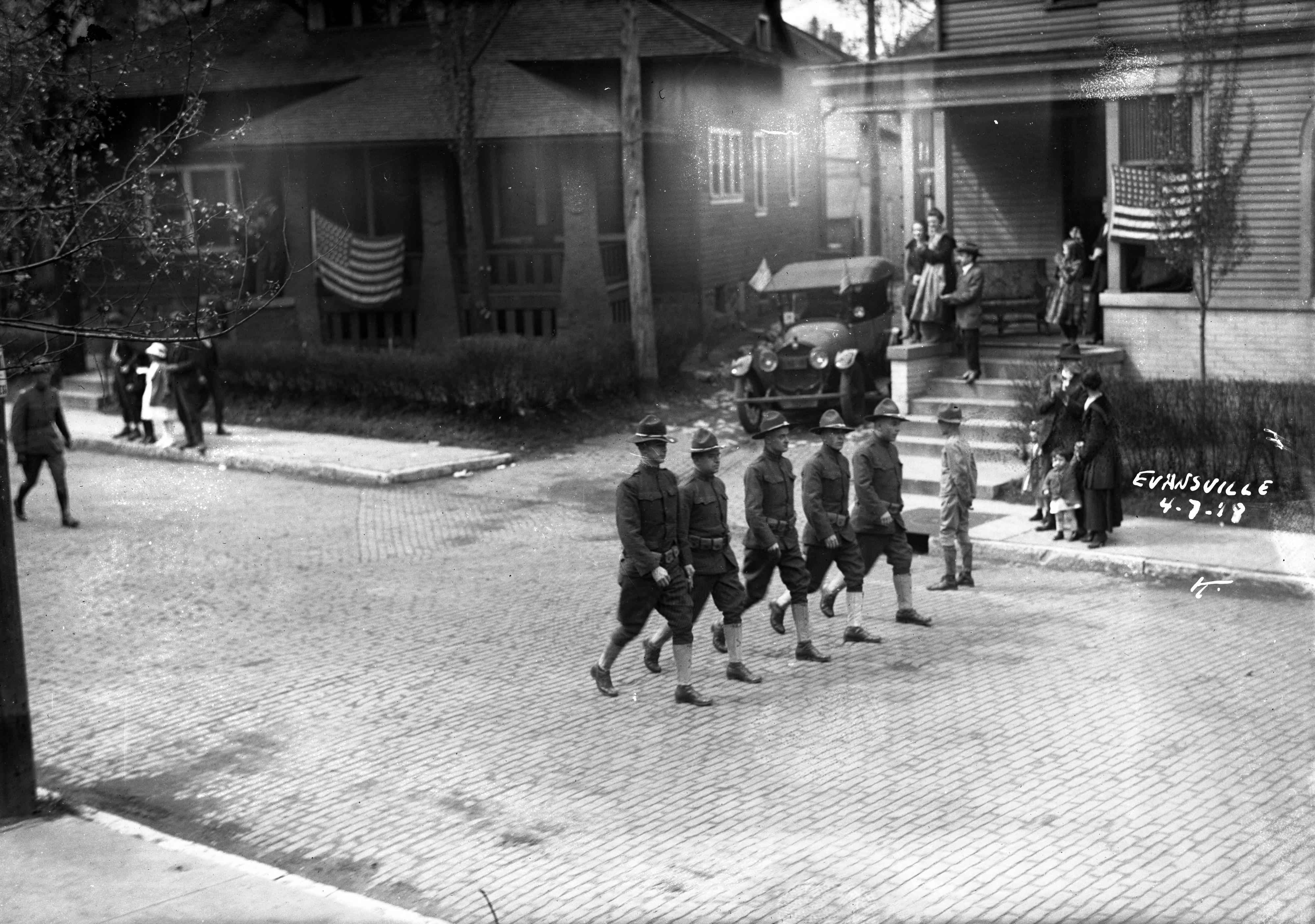Soliders parading on brick street