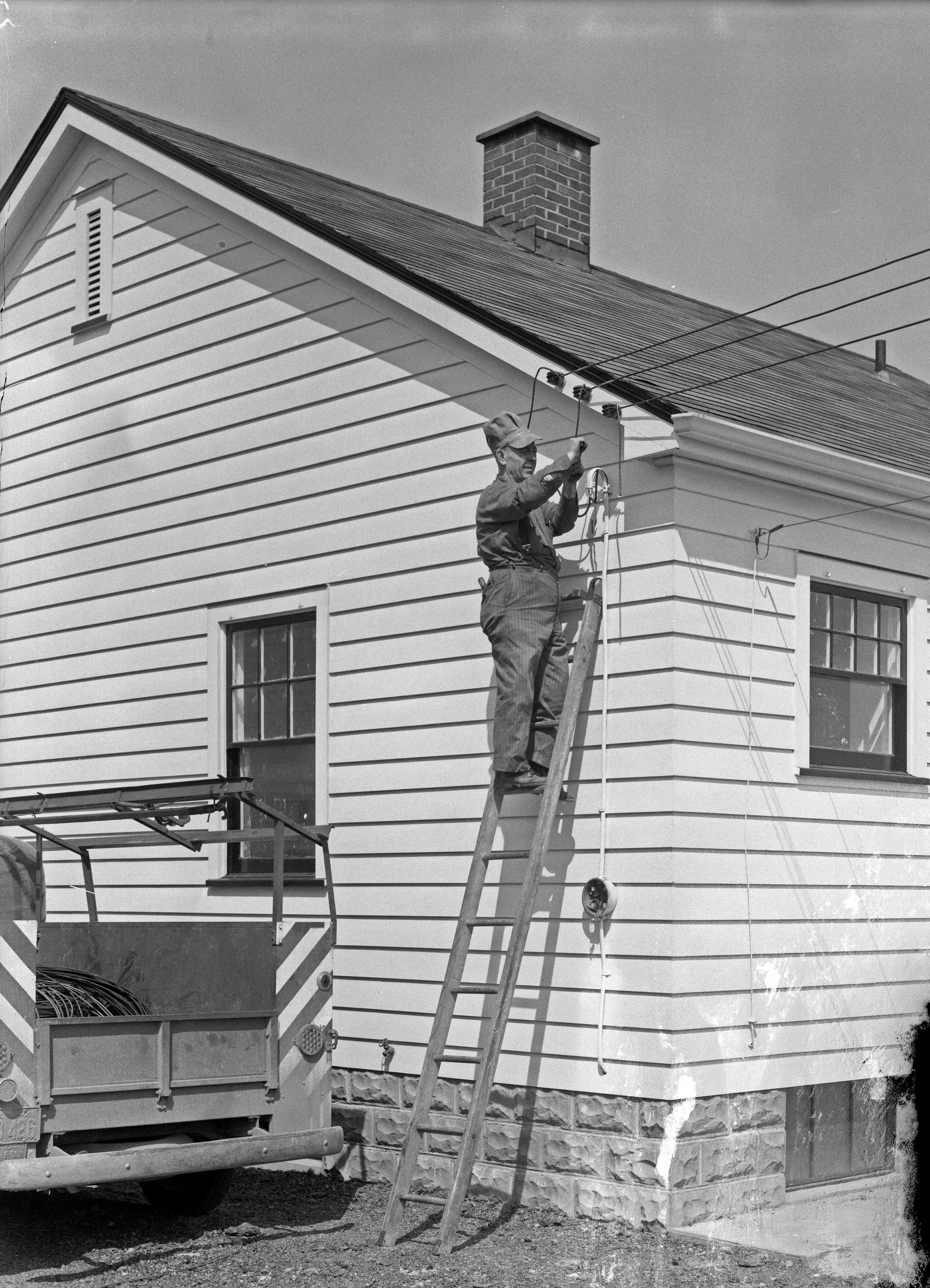 Unidentified man working on the electrical lines of a house