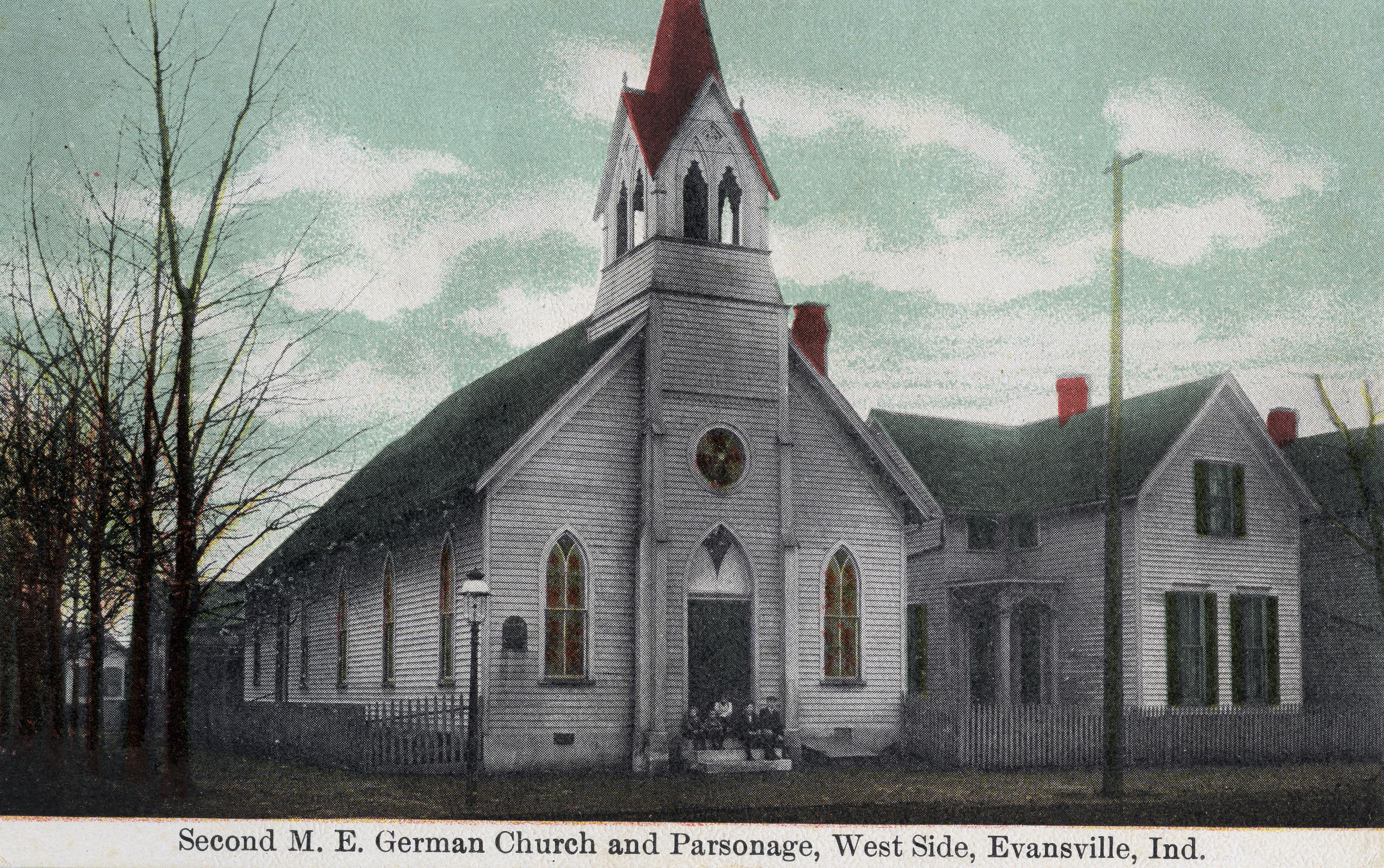 Second German Methodist Episcopal Church and parsonage at 2214 W. Indiana St. (formerly 1114), aka Bethlehem ME. This church was founded in 1887; in 1939 it merged with Simpson Methodist and the congregation moved to 2201 W Illinois St., formerly 1101 W. Illinois St. In 1940 the building shown here was supposedly moved to 1900 N. Fulton Ave. and remodeled for another Methodist church. Today there is a Methodist church at that location, although not the one that was supposedly moving there in 1940, and the building, if it is indeed the same, so remodeled as to not be recognizable.