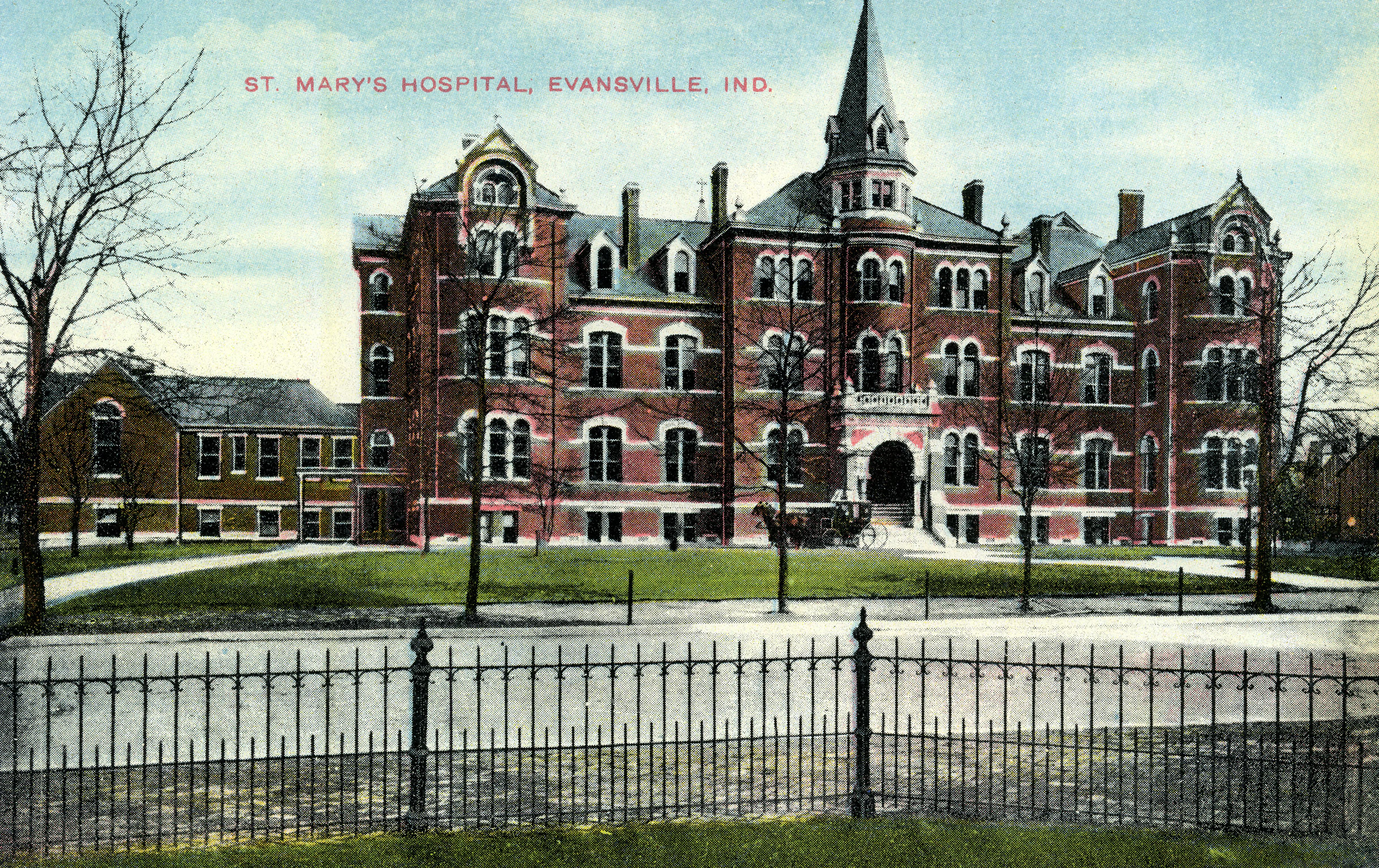 St. Mary's Hospital at what was formerly 1113 First Ave. This is the second location for the hospital; the hospital as an organization began in 1872, this location opened in 1894. An addition was added in 1922 and a nurses' home in 1947. On March 10, 1956, the hospital moved to its current east side location--all in one day. The location seen here was razed, with the exception of the addition, in 1960. The addition now houses medical offices, and a Hacienda restaurant is on the site of the hospital. This postcard was printed in Germany.