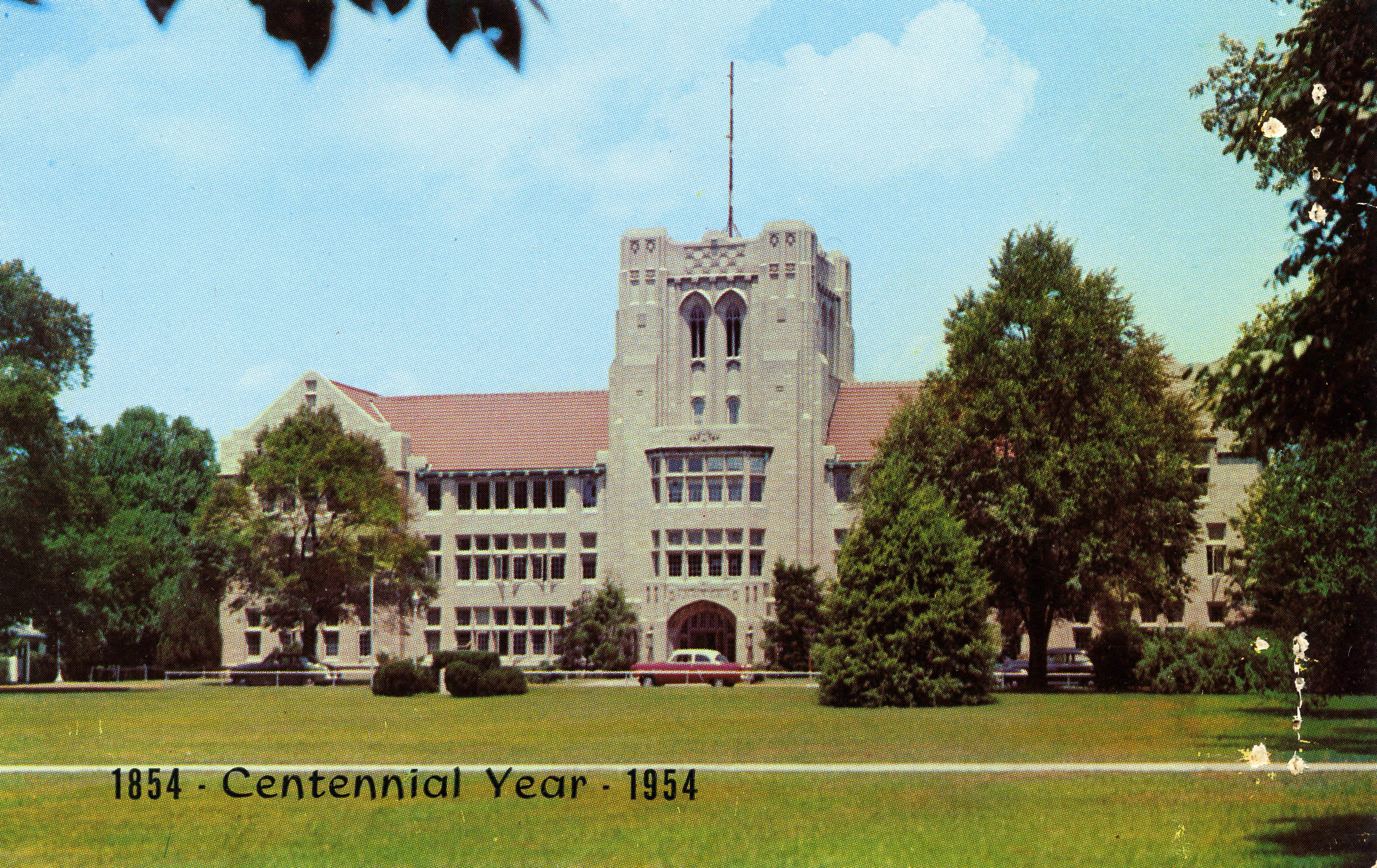 Administration building at Evansville College at 1800 Lincoln Ave., celebrating the centennial year of the original school. In 1919, Moore's Hill College relocates to Evansville and is called Evansville College. Classes were held in an old synagogue for 3 years until the current campus was ready in 1922, when this building opened. In 1967 the school was renamed the University of Evansville (UE)"The University was founded in 1854 as Moores Hill Male and Female Collegiate Institute in the little town of Moores Hill in Dearborn County in southeastern Indiana. The first college building at Moores Hill was completed on December 1, 1856, although the opening day of classes for the new college was held in the building on September 9 of that year. A cornerstone was laid for a second building over 50 years later on June 12, 1907. The new building was dedicated on June 18, 1908, and named "Carnegie Hall" after the chief donor, Andrew Carnegie. On March 21, 1917, George S. Clifford made a presentation at a special session of the Indiana Conference of the Methodist Church proposing to move the college to Evansville, Indiana. Clifford had prepared a map showing that if a circle with a 50-mile radius was drawn around each of the colleges within the state, none touched Evansville. After deliberation, the school was relocated to Evansville in 1919 and renamed Evansville College. In 1967, after continued growth and organizational changes, the name was changed to the University of Evansville with the approval of the Indiana State Legislature. (https://www.evansville.edu/aboutue/history.cfm) NOTE: although the surroundings have changed somewhat, this view is still consistent with what is seen today. This is postcard 389-D-8 63869.