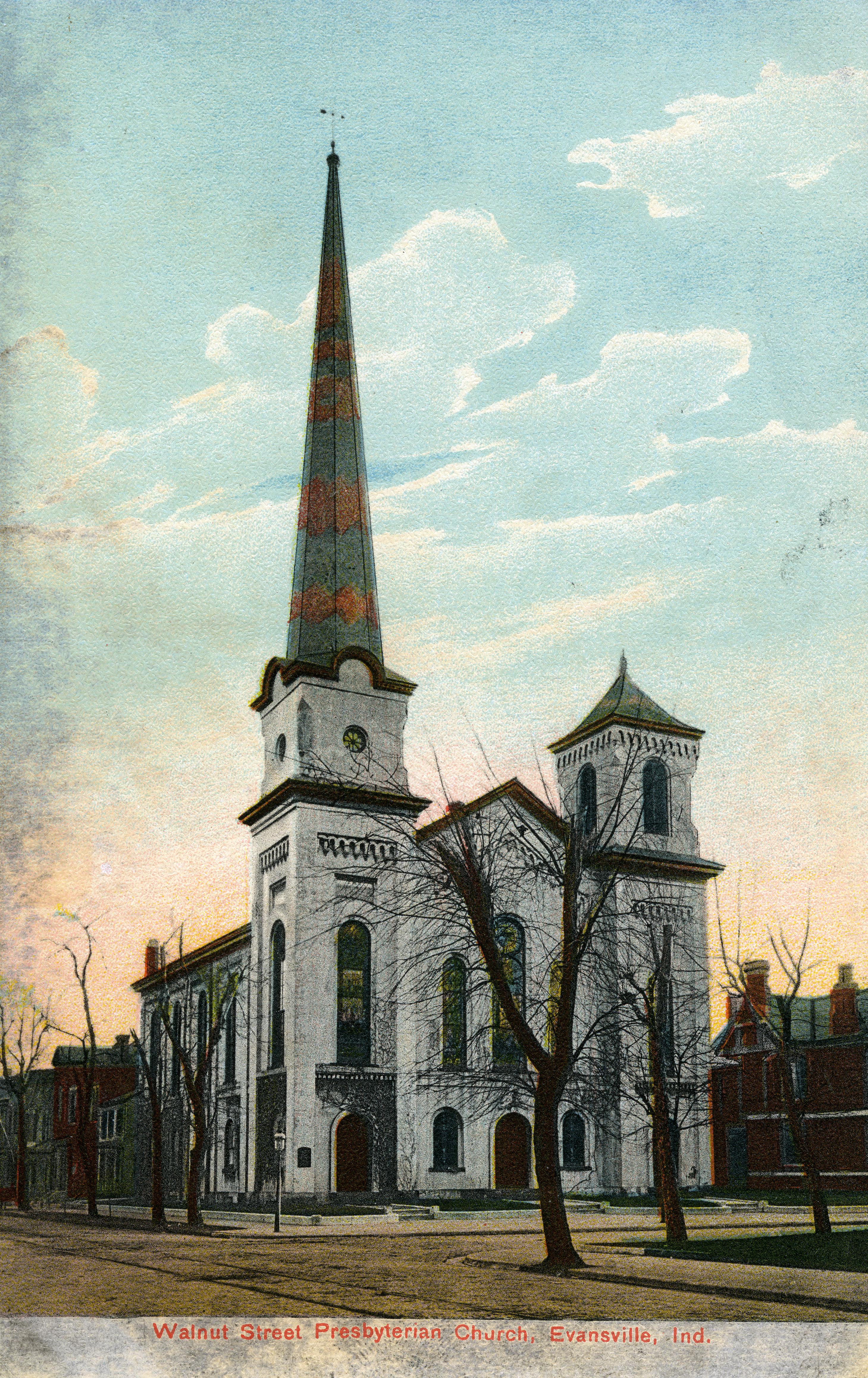 Walnut Street Presbyterian Church at 121 Walnut St. "[The] foundation laid in 1859 and services held in basement for first 2 years. [This] congregation moves from its old location, the "Little Church on the Hill." The new church is dedicated February 1863 and was renamed Walnut Street Presbyterian. In 1926, Walnut Street merged with Grace Presbyterian to become First Presbyterian. The two churches, which both had ties to the "Little Church on the Hill", finally rejoined forces after a theological division in 1837 caused their split. The rejoined church met at the First Presbyterian location, 601 SE 2nd St., formerly 901-5 Upper 2nd St. Another church moved into the structure seen here, but it was destroyed by fire in 1944. This is postcard No. C697.