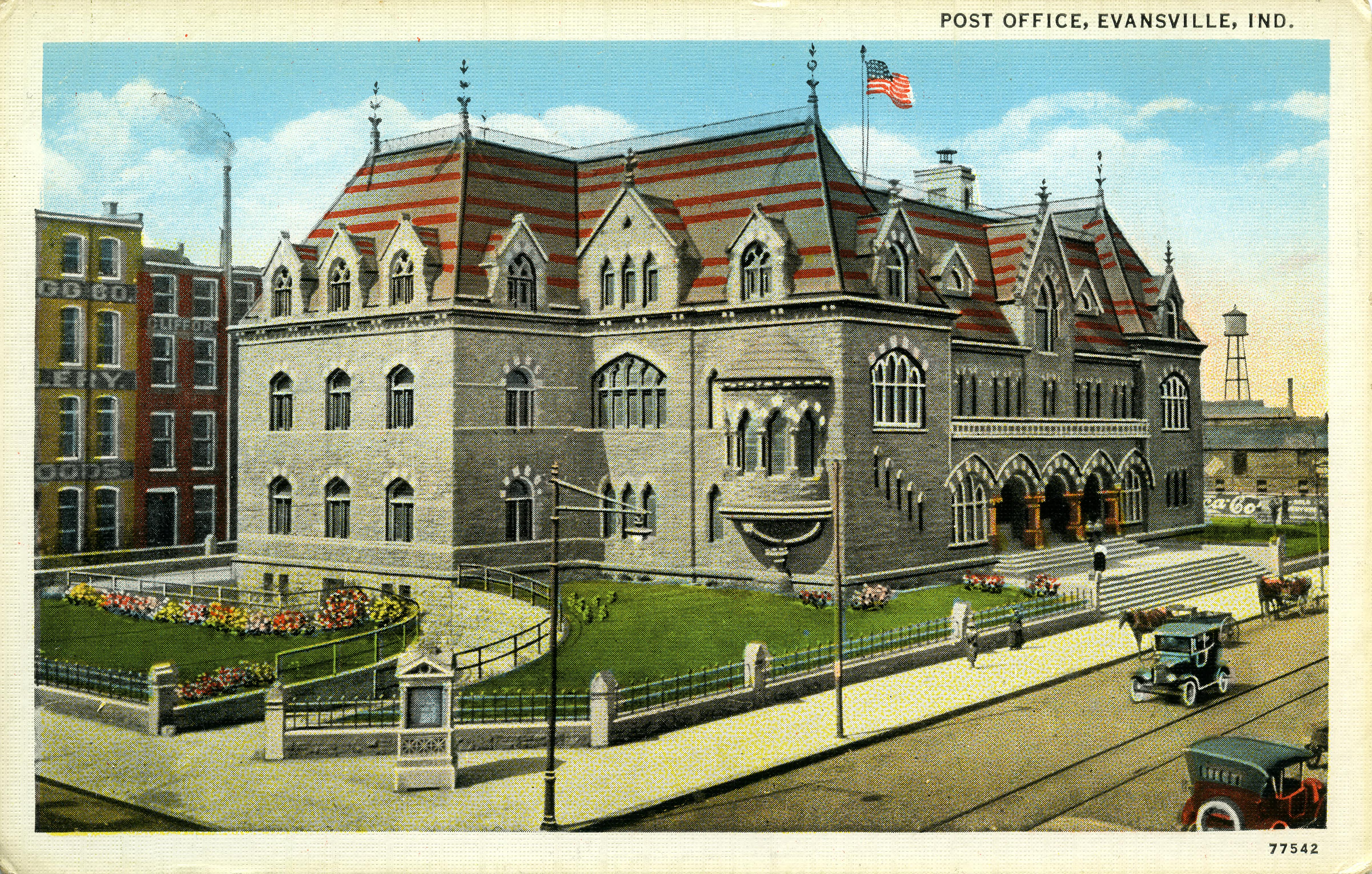 Old post office, a.k.a. Customs House, at 200 NW 2nd St. between Sycamore St. and Vine St. "Construction started in 1873 and the Old Post Office and Customs House was completed in 1879. The Old Post Office was designed by A.B. Mullett and Company in the Richardsonian Romanesqe style; featuring round arches, stone masonry and towers. This building, like many other historical downtown buildings was built by Charles Pearce and Company. In 1971, it was added to the National Register of Historic Places."(http://www.oldpostofficeplaza.com/history.html) Wings (seen here) were added to each end in 1918. The federal government abandoned this facility in 1969 and the city acquired it in 1977. Today it houses an event venue. This is postcard 77542.