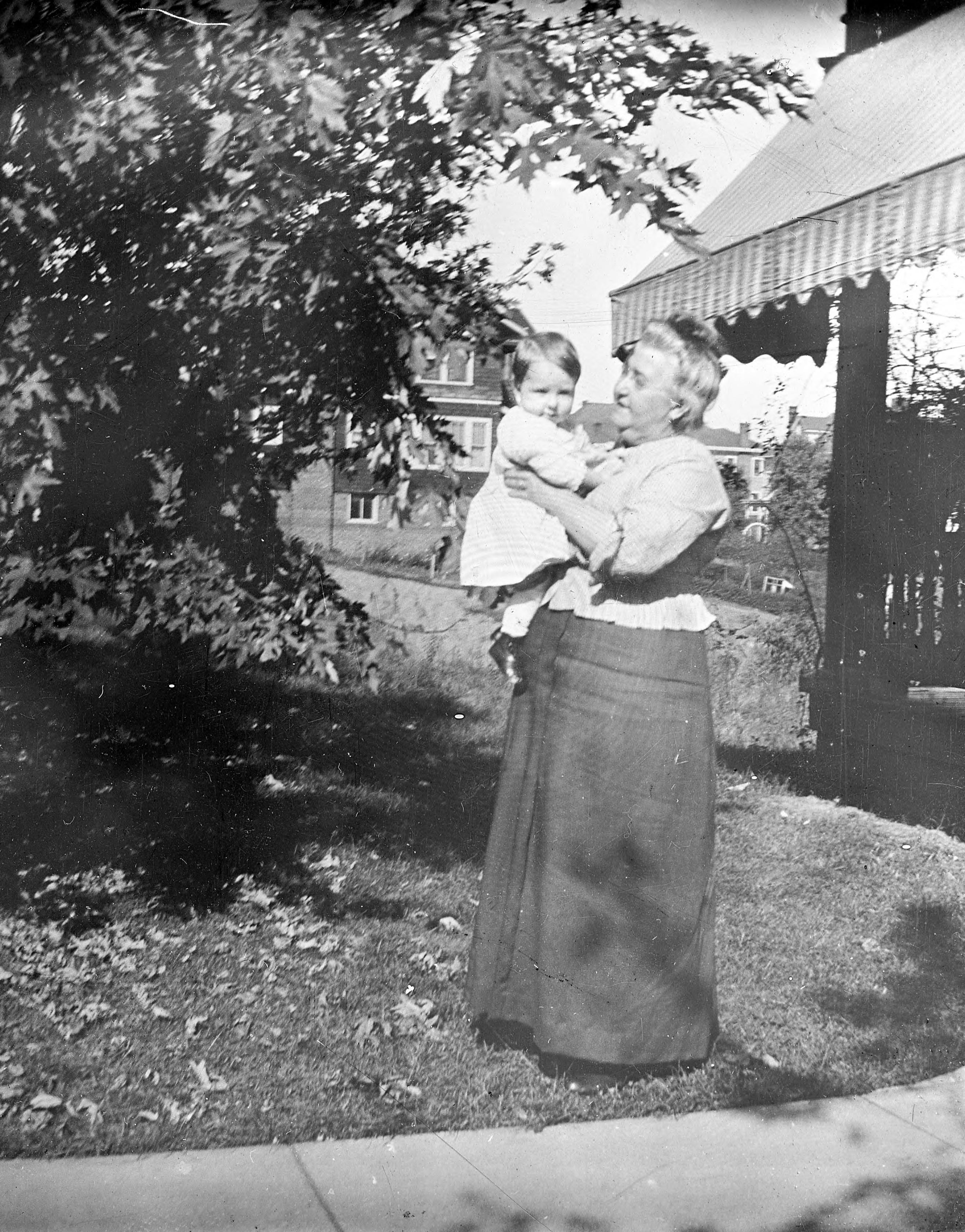 Women holding a child outside of a house