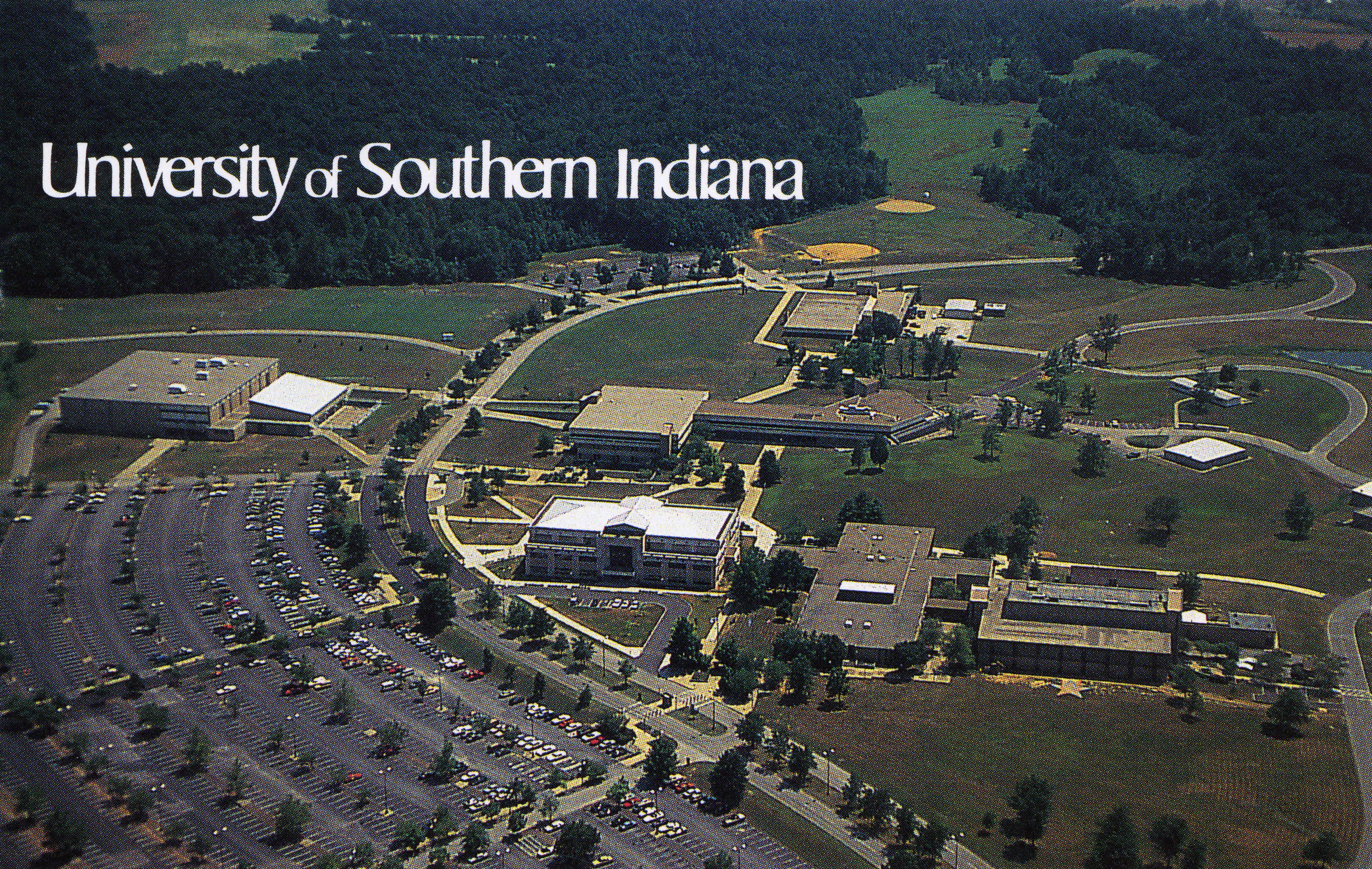 Aerial view of University of Southern Indiana at 8600 University Blvd. "The University of Southern Indiana began as a regional campus of Indiana State University, opening on September 15, 1965. [In the beginning, classes were held at an old school in Evansville, Centennial.] In 1967, Southern Indiana Higher Education, Inc. (SIHE) raised nearly $1 million to acquire 1,400 acres for the Mid-America University Center. Groundbreaking was held June 22, 1968. Since September 1969, the University has occupied 330 acres, mostly donated by SIHE. On April 16, 1985, legislation was signed which made USI a separate state university. All legal matters were effective July 1, 1985. On June 30, 2008, SIHE transferred ownership of over 900 acres of land and remaining assets to the USI Foundation. (http://www.usi.edu/about/history/) NOTE: this aerial view of campus is not current--the campus has expanded greatly since this was taken.