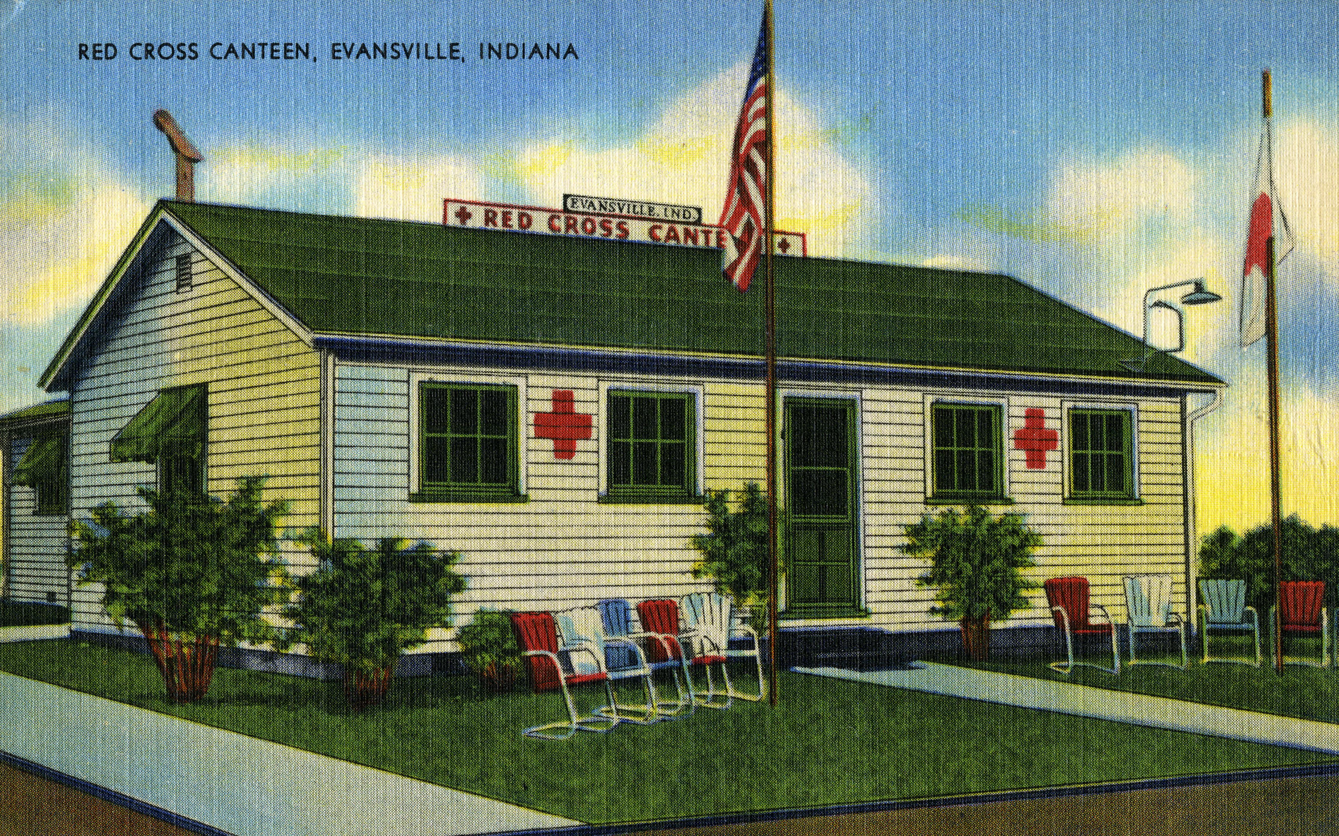 "The greatest Tri-state story of World War II, I believe, was the Evansville Red Cross Canteen. The Canteen was located at the intersection of Ohio Street and Fulton Avenue, next door to the L & N Railroad Depot. This small wood frame building served 1,612,000 service men and women. The Canteen operated only 3 years, averaging about 1,280 meals per day. The amazing fact is that no money was collected from any serviceman. All costs were provided for by the area citizens and the American Red Cross. All Canteen workers were volunteers, they numbered in the hundreds and for many this was their full time job. In June 1942 the land was loaned by Southern Indiana Gas & Electric Co. The building was built by the Evansville Courier and the Evansville Press. The 20 by 35 foot building was completed in two weeks and placed in service on June 14, 1942. Here are a few facts to clarify the situation; the usual mode of transportation was by railroad. America had about 11,000,000 men and women under arms. An inductee would ride to training base by rail; go home for leave by rail. Then perhaps to a special training camp, home again and then to a permanent duty station, all via the railroads. The usual military train did not have a diner car. Sometime, when the train had many civilian passengers, a dining car would be attached. The boys, however, often did not have money to pay for food. Some stories were distressing. One young man, Pvt. Taylor, said he had been standing on a train for 48 hours and often the troops said that they had not eaten for a day. It appears that the army and navy put the men on a train and provided water and toilets and nothing else. There may have been no dining provisions for them along the tracks. Some canteens charged for food. Remember, the main thing was to win the war. Everything else was in second place. At any one time, there would have been many thousands of troops in the rail system. Evansville averaged 1,500 men and women per day during 1943 when more than 500,000 persons stopped for a meal, a drink and a chance to stretch their legs. The Canteen received a constant flow of food, service and money contributions from a radius of about 50 miles around Evansville. The towns in Illinois, Kentucky and Indiana took the Canteen on as their responsibility; they kept it very well supplied with what they could offer. The Evansville Courier gave a daily summary of goods and supplies that were donated. The gifts may have been a 4-H club prize beef, an entire crop, a live animal (prepared by an area packing house), canned goods, fresh produce, pies, cakes, tobacco products, coal for winter heat, cash, postage etc. One family donated 1,000 post cards for the boys. Contributions would come from a small town, church groups, neighborhoods, a street, a city block, a store or a war plant. While the flow of goods was endless, one must wonder how the canteen staff could continually deal with goods of such variance and quantity. Often, the donations may have included, for instance, a jar of canned pickles, several dozen donuts, a bushel of unshelled beans, a ham or some chickens. Keep in mind that the building was not as large as a modern mobile home and it had little storage space and a tiny food preparation area." One night the women staffers were treated by 30 black sailors from the Great Lakes Naval Training Station. The young men sang Anchors Aweigh in appreciation for dinner. Often the Canteen had volunteer entertainment for the troops. The canteen women served as mothers or doctors to those in need, menders to those with rips and lost buttons. Perhaps the 2,100 soldiers having supper in a two hour time period was a record. Some days as many as 3,500 service men were accommodated. In 1943 5,000 Christmas packages were given to soldiers at the Camp Breckinridge hospital. At times, the service men were sleeping or could not leave the train, so the volunteers would always take food and drink to the train. Sixty-five wounded troops on a hospital train were served sandwiches, ice cream and cigarettes by the Red Cross women. The Red Cross had a multi-purpose mobile unit that collected large contributions, delivered food and drink to service men groups that may have had special problems or sick travelers that needed emergency aid at a hospital or physician. The Red Cross had a mobile canteen van that would go where there were large numbers of troops." In 1944 a small building was built between airplane hangers to serve as the Red Cross Airport Canteen for the many airmen that flew into and out of the busy Evansville Airport. They served around 100 meals per day. Praise and tributes were shared on many allied ships and bases by boys that were served while passing through Evansville. Fred Redman, a radio-gunner on a B-24 bomber made a special trip to Evansville to tell the Canteen volunteers how much he and the boys enjoyed the good food and fine treatment they had received at the canteen. "When we talked about our hometowns nobody had ever heard of Epworth, Illinois," Redman said, "but when I would say Epworth was 38 miles from Evansville, the guys started talking about the Evansville canteen. You would have been very pleased if you could have heard only a few of their stories about this canteen." Redman told the women that he had been stationed in England, Ireland, Scotland, Greenland, Iceland, France and Germany and in all those countries the Evansville canteen was well known by many of his buddies. The Canteen closed January 1, 1946."(http://web.usi.edu/boneyard/redcross.htm)"