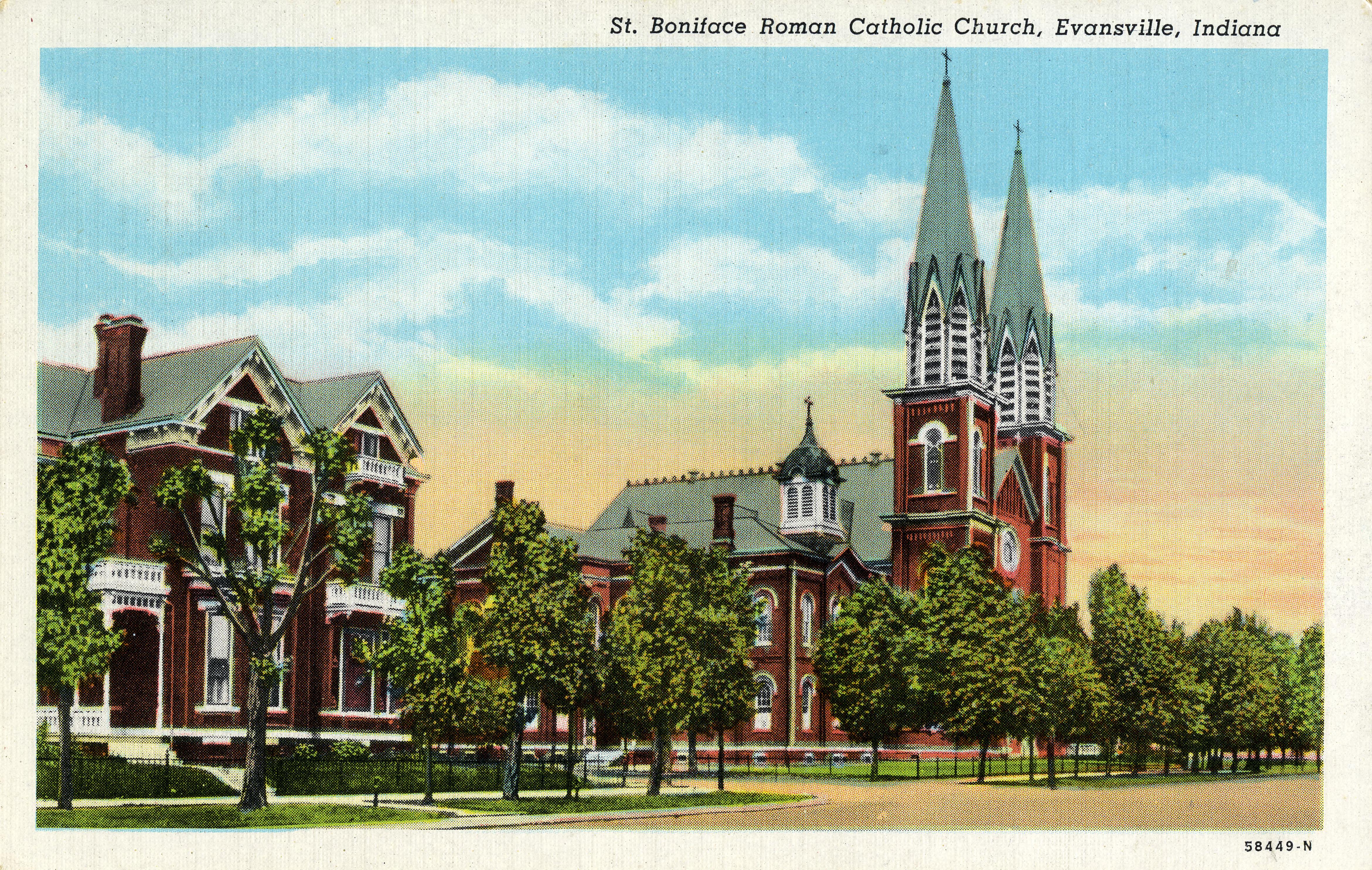 St. Boniface Catholic Church at 614 Wabash Ave. "St. Boniface was established because of travel for the large German population living in the northwestern portion of the city. Its territory formerly belonged to Holy Trinity parish, however, it was remote and inconvenient for many. The first move to build this church was a meeting of prominent Catholic Germans at the residence of Mr. Charles Schulte in October 1878. The land for the church was a lot bounded by Wabash Ave, Michigan St, 10th Ave and Virginia St. It was purchased by five Catholic gentlemen (Adam Helfrich, Charles Schulte, August Rosenberger, Henry Rietman, and Theodore Rechtin) in 1878 for $5,000. Soon after a letter was sent to the bishop of the Diocese of Indianapolis setting forth the facts. On January 4, 1880, Rev. Bishop Chatard visited Evansville and received the deed to the property from the gentlemen. He appointed Rev. William Bultmann as pastor thus creating St. Boniface's parish. St. Boniface became the fourth parish and the third of the German-speaking Catholic congregations in Evansville. The first church was a temporary wood frame building. Construction began February 1, 1880 and it was built within one week. After two months an addition had to be made to accommodate the people, and in less than a year later this building was torn down to give room for the first St. Boniface. The cornerstone of the original church was laid on September 4, 1881, and construction moved rapidly. The building, shown above, was dedicated on April 27, 1882 with a final price tag of $68,000. It was 70 feet wide, 147 feet long, and the spires stood 202 feet. On March 30, 1902 (Holy Saturday), the church building was struck by lightning at 11:30pm. A fire broke out and raged on through Easter morning. Only the 12 inch brick walls were left standing, and a few of the valuable articles were saved. Still, the parish was undaunted. No sooner had the flames completed their devastating work when plans were made to rebuild the church superior in beauty and size to the one destroyed. The original walls were used, gables where added and the steeples were lowered to 175 feet. The construction costs totalled $62,000, and the building was rededicated later that year. Over the years, the present church (shown to the right) has remained remarkably true to its original state. Several renovations over the years, including most recently in 2006, have preserved its integrity and earned the church a spot on the National Register of Historic Places. The rectory, or parsonage, is the oldest remaining building on the St. Boniface campus. Originally, the priest stayed in a home on Wabash Avenue across from the church. The current rectory, a Queen Anne, red brick with white stone trimmings, was built in 1892. It is a substantial building complementing the larger homes across Wabash Avenue. The wrap around front porch was an early 1900s addition. The first school was a small frame building about one block away from the original church. It was erected in the spring of 1881, though by 1885 a new school was needed because of overcrowding. The second school, built at the corner of Michigan Street and Wabash Avenue. The six-room building cost $10,000 and was dedicated in December 1885. The sisters' home was also in the school until they got their own building in 1907. The school served the parish well until it was replaced with a more modern building in 1923. It was eventually torn down in 1951 and made into the current parking lot. A new and larger school (present building) was built in 1923 on the west end of the lot. It was brick and stone and had a had a labratory, an office, an auditorium, a gymnasium, and a cafeteria. When the school opened, the Ursuline Sisters from Louisville who taught there temporarily stayed at the original St. Mary's Hospital in the old Marine Hospital on Ohio St. The parish obtained a house on the southwest corner of Virginia St and 10th Ave in November 1881. The sisters stayed at this home (which is still standing) until 1886 when they moved into the second school building mentioned above. In 1907, a 15-room, state-of-the-art sisters' home was erected. It was a two story brick Georgian revival building designed by Harris & Shopbell. It is still standing on the south side of the block, but it was vacated in November 22, 1978 due to shortage of nuns."(http://www.saintbonifaceevansville.com/) Since 2014 this church is part of a three part parish, along with Sacred Heart of Jesus Parish and the former St. Agnes, Virgin and Martyr Parish. This is postcard 58449-N.