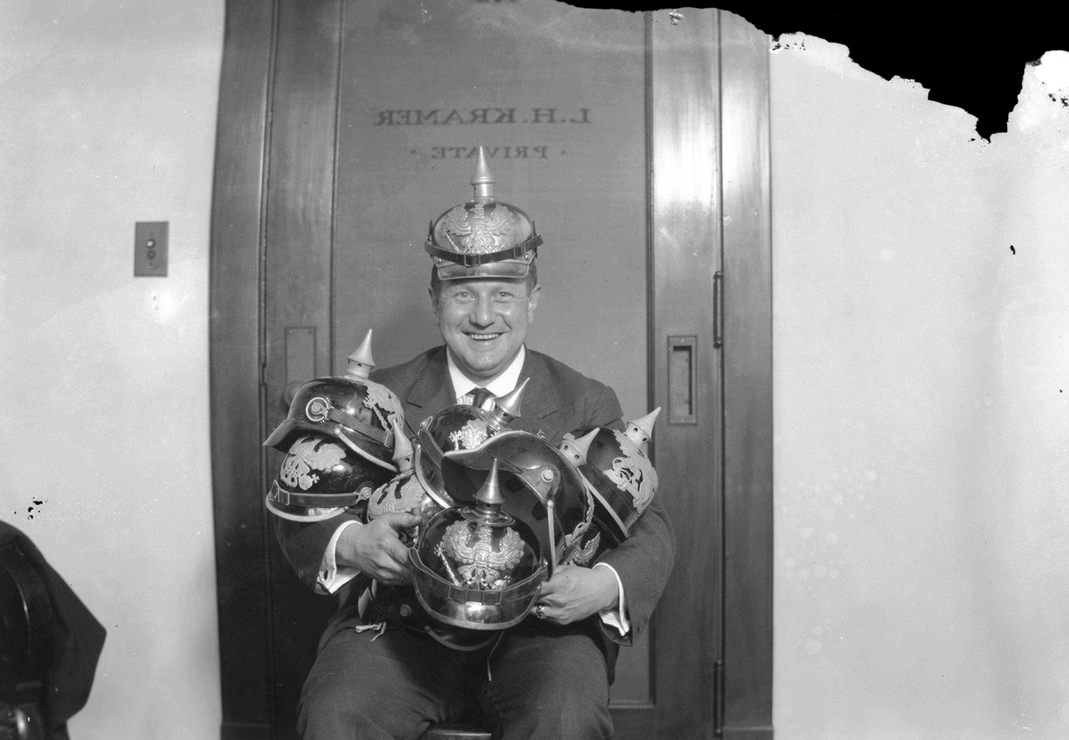 Louis Crane posing with captured German helmets
