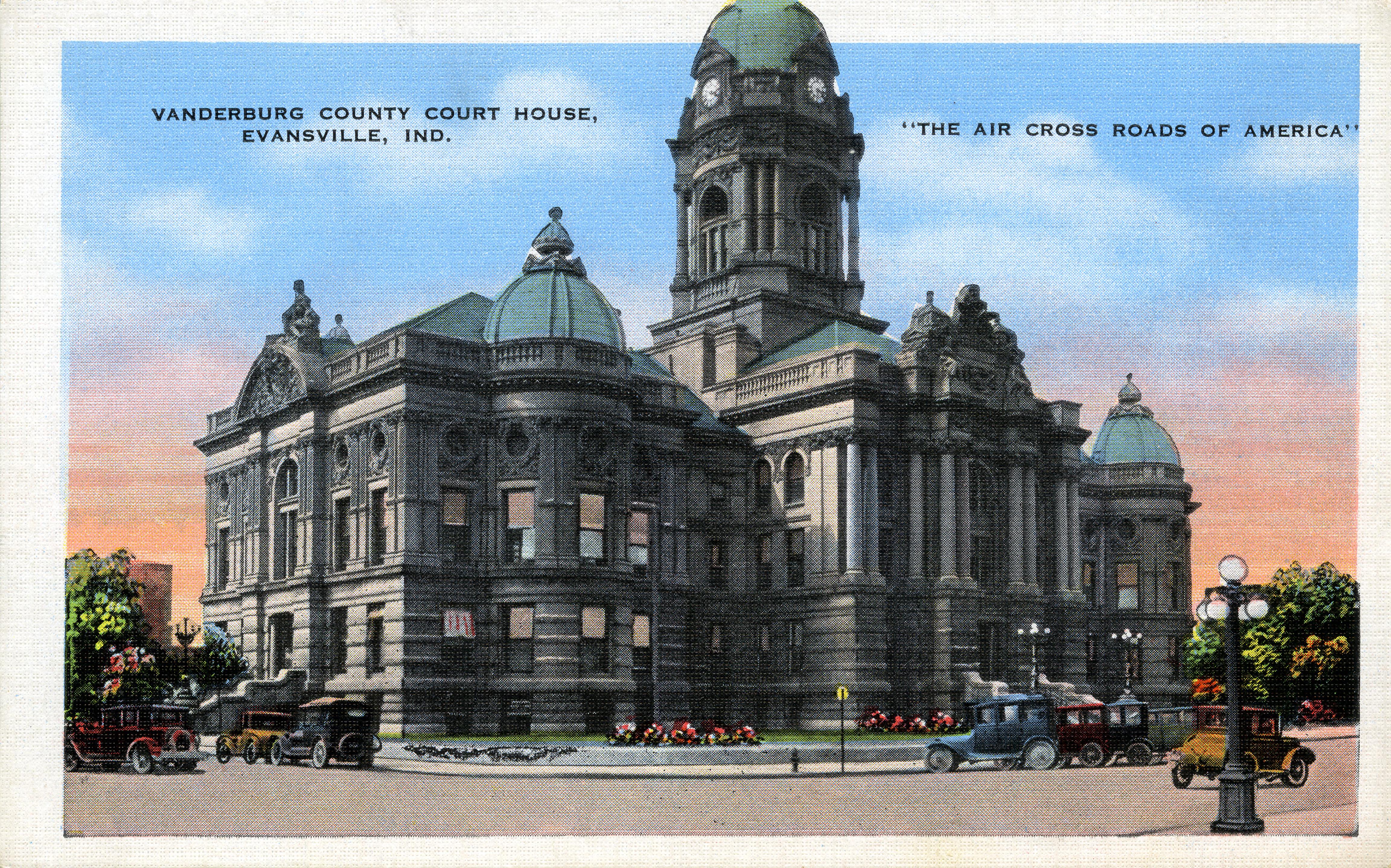 Vanderburg County Courthouse at 201 NW 4th St. The card also calls this "the air cross roads of America. A note about the spelling--Vanderburgh is the more common. "The Old Vanderburgh County Courthouse is considered by architectural historians to be onf the most important examples of 19th century governmental architecture in the country. It was designed by Henry Wolters of Louisville, Kentucky and exemplifies Beaux Arts architecture which was just coming into vogue at the time of the Courthouse�s design, replacing heavier Victorian styles. Wolters himself studied at the Ecole de Beaux Arts in Paris. It occupies a full city block bound by Fourth, Vine, Fifth and Court streets in downtown Evansville which was once a turnaround basin for the Wabash and Erie Canal. Franz Engelsmann of Chicago is credited with carving the fourteen main statues that surround the courthouse. Much about the history of Vanderburgh County can be gleaned from the sculptures which were all carved onsite. The building is constructed of Bedford Stone, limestone native to Indiana, and the interior boasts marble floors, Ettewa pink marble wainscots, slate stairs and wrought iron and brass handrails. At its tallest point, 216 feet, the courthouse�s bell tower dominates the skyline of Downtown Evansville. Construction on the courthouse began in 1888 and was completed by 1890 at a cost of $379,450. County government personnel started moving into the courthouse in early 1891. The courthouse was the epicenter of community life and for the big events of its day. The Commissioners room served as the military headquarters during the 1937 flood when martial law was declared and the courthouse was a stop on the campaign trail for President Harry Truman in 1948 and John F. Kennedy in 1960. Both gave speeches from the courthouse steps. The building was vacated in 1969 when county government offices were moved to the new Civic Center Complex. (https://oldvanderburghcourthouse.com/about-the-old-courthouse/) This is poatcard 4641.