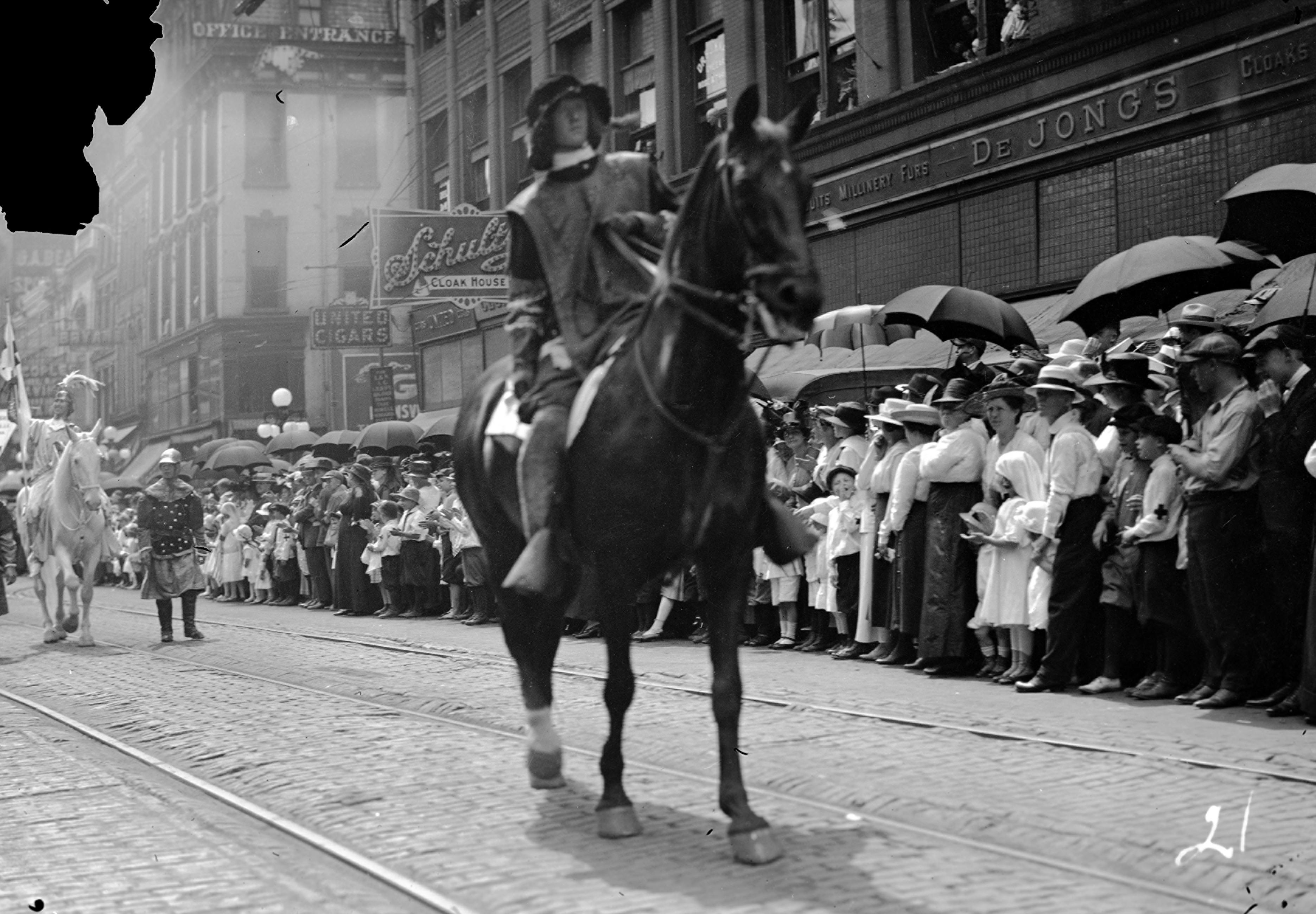 Man on horseback in Red Cross parade, downtown Evansville
