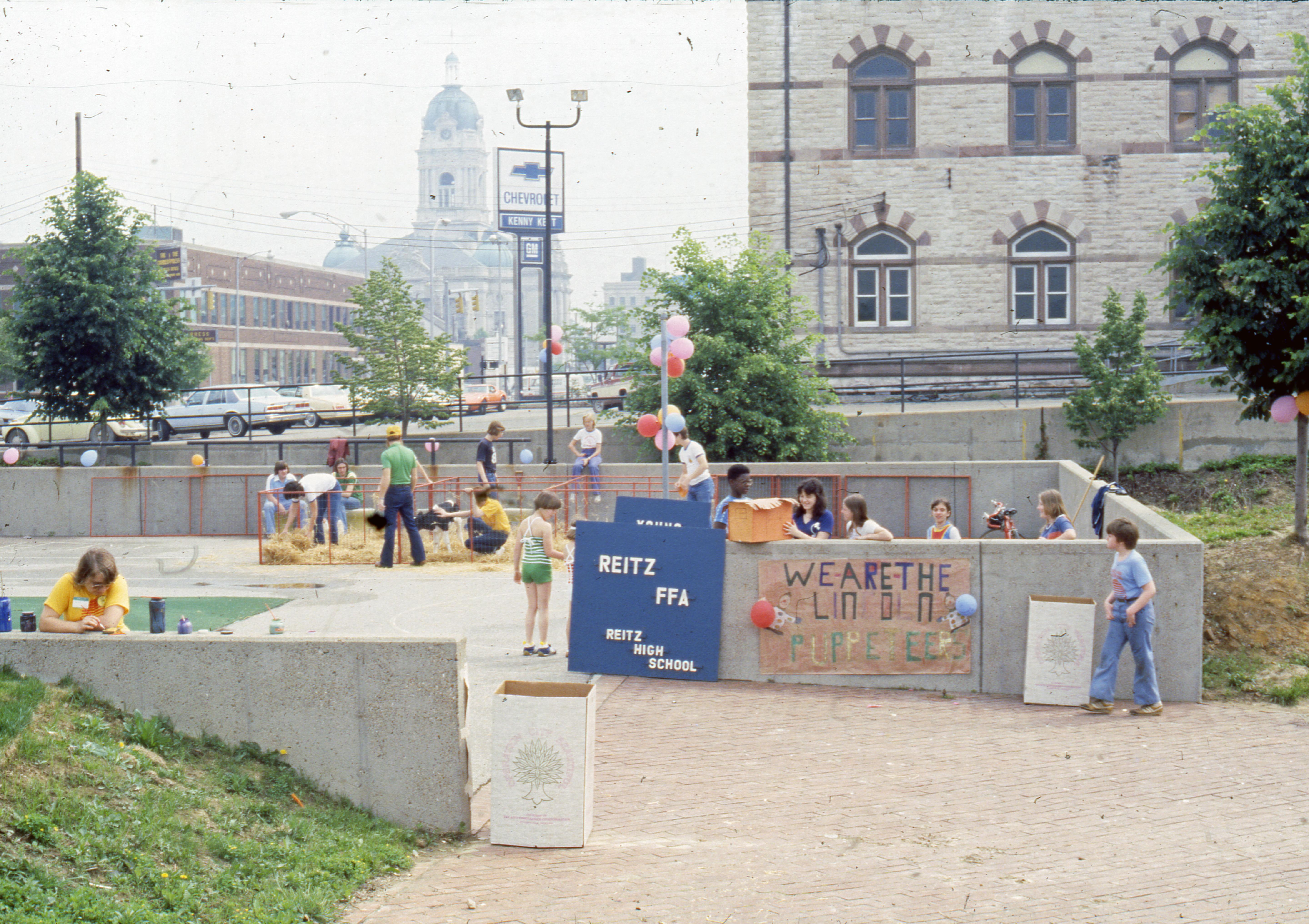 Reitz High School FFA sign, along with a sign proclaiming, "We are the Lincoln Puppetteers. This is likely associated with the Ohio River Arts Festival. This is next to the old post office at 200 NW 2nd St. It was built 1873-1879. Abandoned by the federal government in 1969, it was acquired by the city in 1977 and currently holds a catering/event venue. Across the street is the Courier and Press newspaper building at 201 NW 2nd St. To its right is the Vanderburgh County Courthouse (building with cupola) at 201 NW 4th St., completed in 1890. The building still stands, but is now referred to as the old courthouse, as government offices moved into another building in 1969.