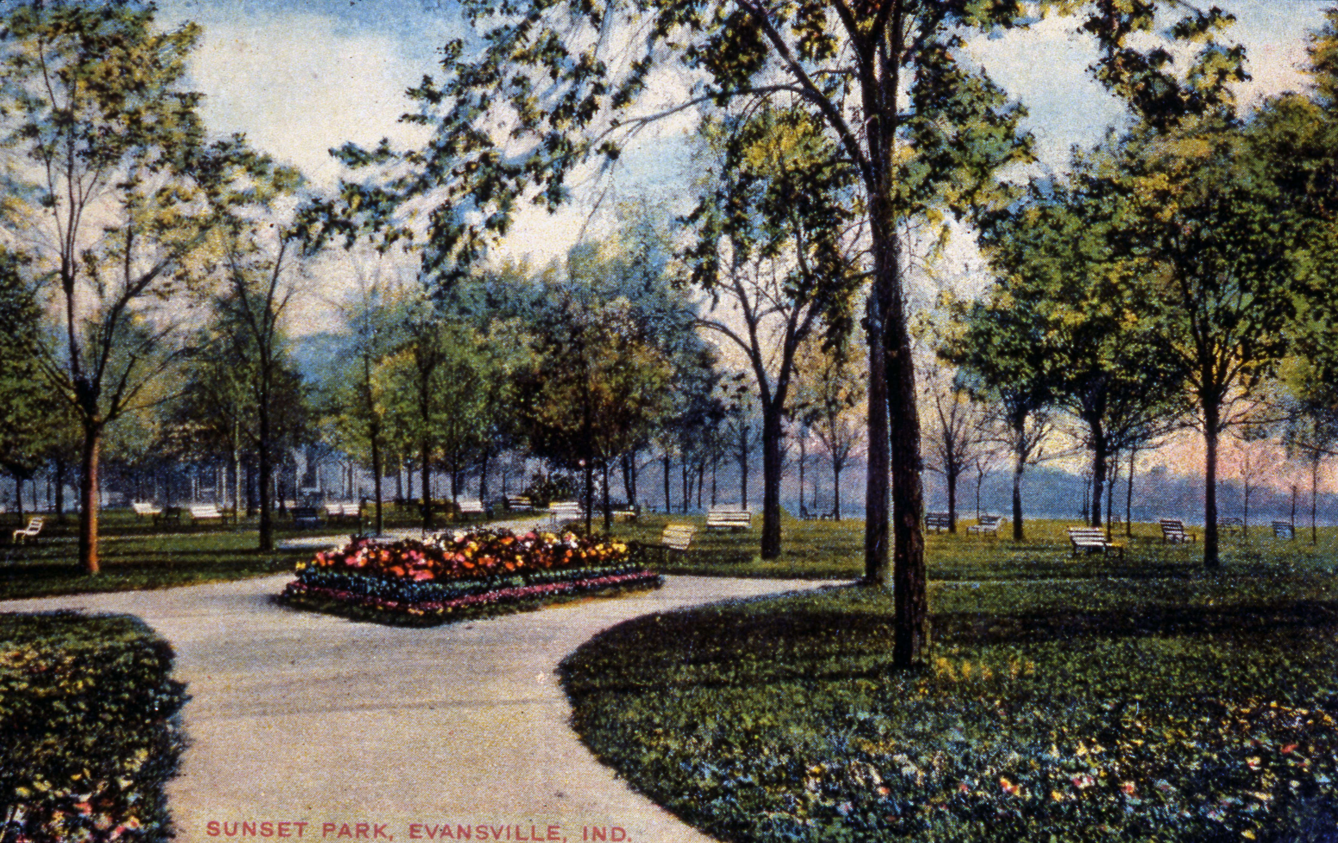 Postcard of flowers at Sunset Park. "Evansville's Riverfront once was the hub of the city's commercial activity, but residents soon recognized its recreational possibilities. In 1850, a newspaper suggested that the "delightful tract" of land along the river be converted into a public park, and by the early 20th century, the vision had become a reality. Offering a magnificent view of the setting sun, the newly landscaped park was aptly named Sunset Park. An added amenity was a Japanese-style shelter house, which was constructed in 1913. Now commonly known as the Pagoda, it featured a roof garden, cupola bandstand and public restrooms. (http://historicevansville.com/site.php?id=sunsetpark) The restored pagoda now serves as the Evansville Visitors Center. Technically, on today's map, Sunset Park is a bit further east, but the two areas aren't that distant as the crow flies.