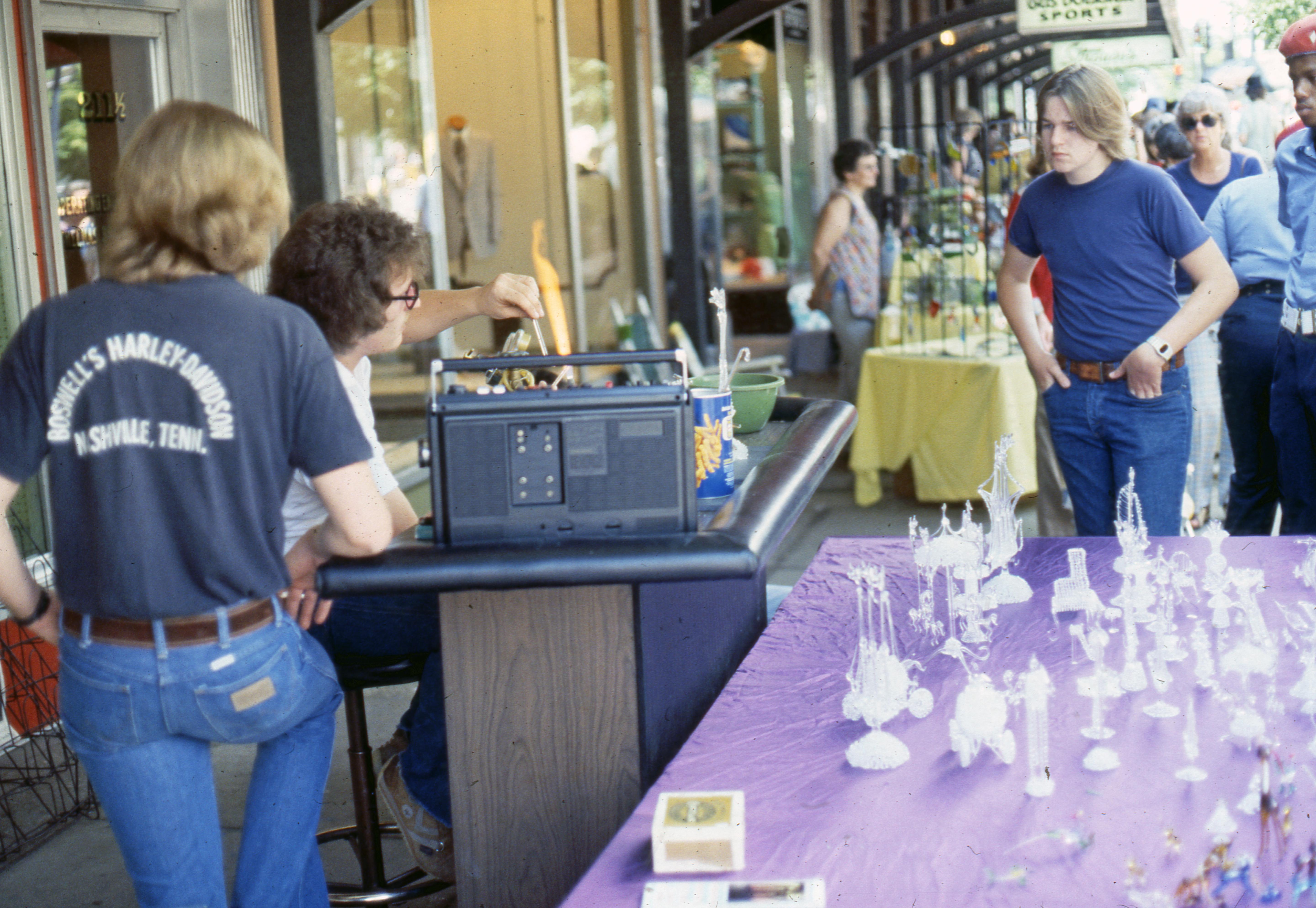 A booth selling glass objects at Ohio River Arts Festival on the Main St. walkway, near Gus Doerner Sports at 207 Main St.. Closed to all but pedestrian traffic in the 1960s, Main St. reopened to one way vehicular traffic in 2002.