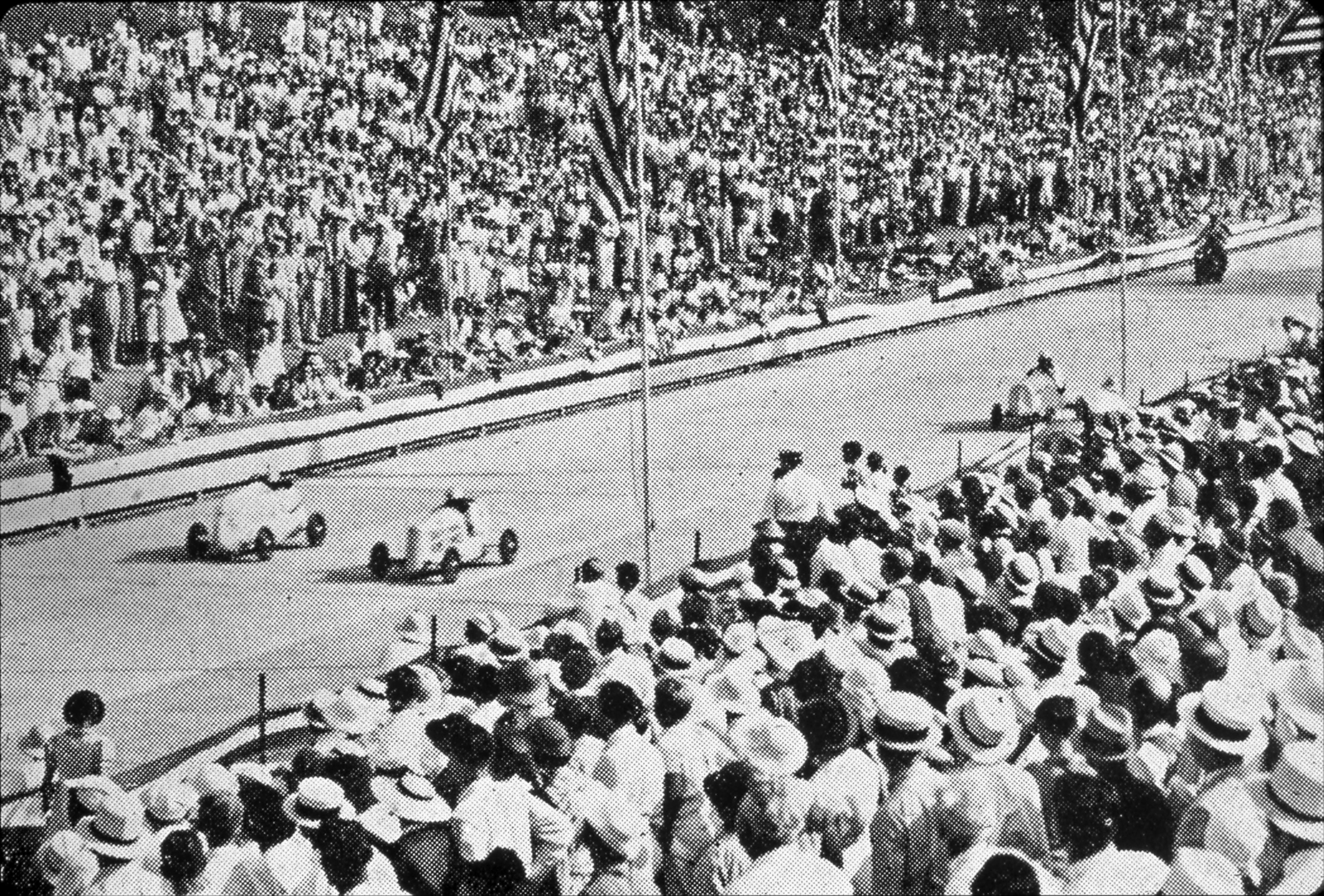 Soap box derby in front of a large crowd with American flags flying, unidentified location. According to Wikipedia, "In the wake of the first car races, local youth auto races took place in the US at a very early stage. In 1914 the motion picture Kid Auto Races at Venice starring Charlie Chaplin was shown in the cinemas." Larger, national competitions came into existence in the 1930s. Although the sport still exists today, the 1950-1960s were its heyday. Since many of the the men in this photo are wearing boaters, this is thought to be in the 1+10s-1920s.