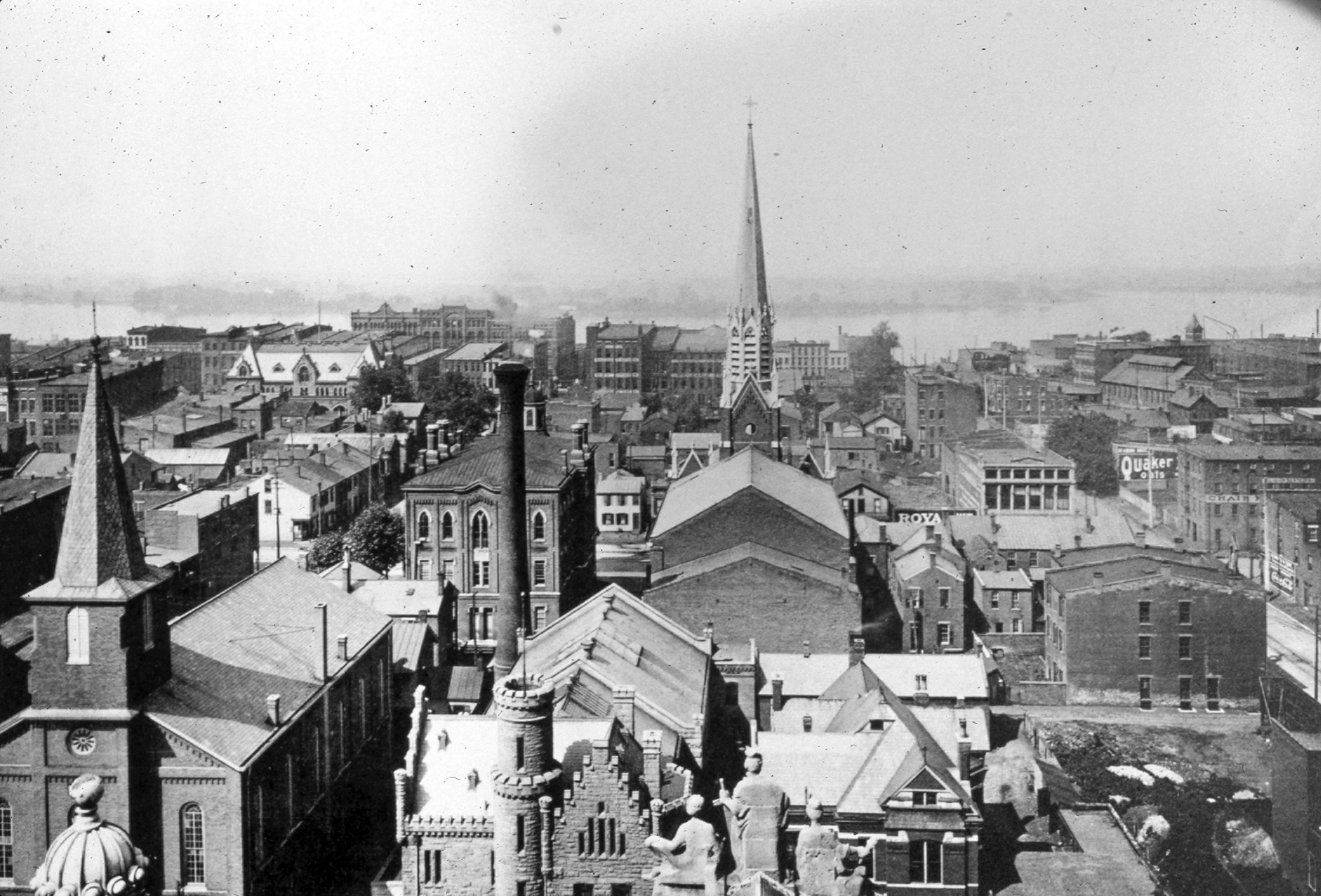 View of downtown Evansville, lookin from atop the old Vanderburgh County Courthouse at 201 NW 4th St. south towards the Ohio River. Immediately in front, in the middle, is the old jail and sheriff's residence at 208 NW 4th St. Only partially visible here, it was built in 1890 and modeled after Lichtenstein Castle. According to the Historic Evansville website, "The building itself is designed to invoke fear in the observer." The Vanderburgh County Jail is also connected to the former Courthouse, which lies across the street, via an underground dungeon-like tunnel. During the time of the jail's use, the tunnel served as a passageway to transport prisoners to and from court." It served as a jail until 1969. The building has been restored and today houses attorneys' offices. The tall spire in the middle is Holy Trinity Catholic Church at 211 NW 3rd St., originally 12-16 Upper 3rd St. "Holy Trinity Catholic church, an unimposing little church downtown on 3rd St, has the distinction of being Evansville�s oldest Catholic parish. Originally the second oldest, it took that title from Assumption Church when it was torn down in 1965 for the Civic Center. But what most people may remember was the beautiful old church building that burned down in 1950. With the boom of German immigrants into Evansville, Holy Trinity was the result of the need for a German-speaking parish (Assumption was English-speaking). The cornerstone was laid in 1849, but a cholera epidemic halted construction. The church was finally completed in 1851 and Holy Trinity parish was born. The church occupied the entire half block of Third St between Court St (originally Division St) and Vine St. The gorgeous chuch with its tall spire was a downtown landmark. A huge school building was on the corner of Vine which for a time served as the Catholic high school (before Memorial was built). A sister�s home was located behind the school fronting Vine St. A new rectory was built in 1912 on the corner of 3rd and Court which is still standing but hidden by the later addition of the education building. Sadly, after standing for a century the church was struck by lightning Easter Sunday and burned down April 3, 1950. The blaze completely gutted the church." Downtown lost one of its most prominent churches, and the city skyline was noticeably missing something. Mass was temporarily held in the school while the present Holy Trinity church was being built. When it burned, it was the oldest Catholic church in the city. While Trinity is still the oldest congregation, St Mary Catholic Church, built 1867, is now the oldest Catholic church building in town. (http://www.vchshistory.org/2014/03/19/holy-trinity-catholic-church-and-fire/) The church on the left, seemingly next to the jail, is the German Methodist Episcopal Church at 202 NW 4th St., built in 1865, dedicated in 1867, with a name change to 4th St. Methodist Episcopal Church in 1917. Its congregation merged with another and moved to another location, so in 1937 that building became the courthouse annex. It was razed in 1973. The congregation itself dates back to at least 1842.
