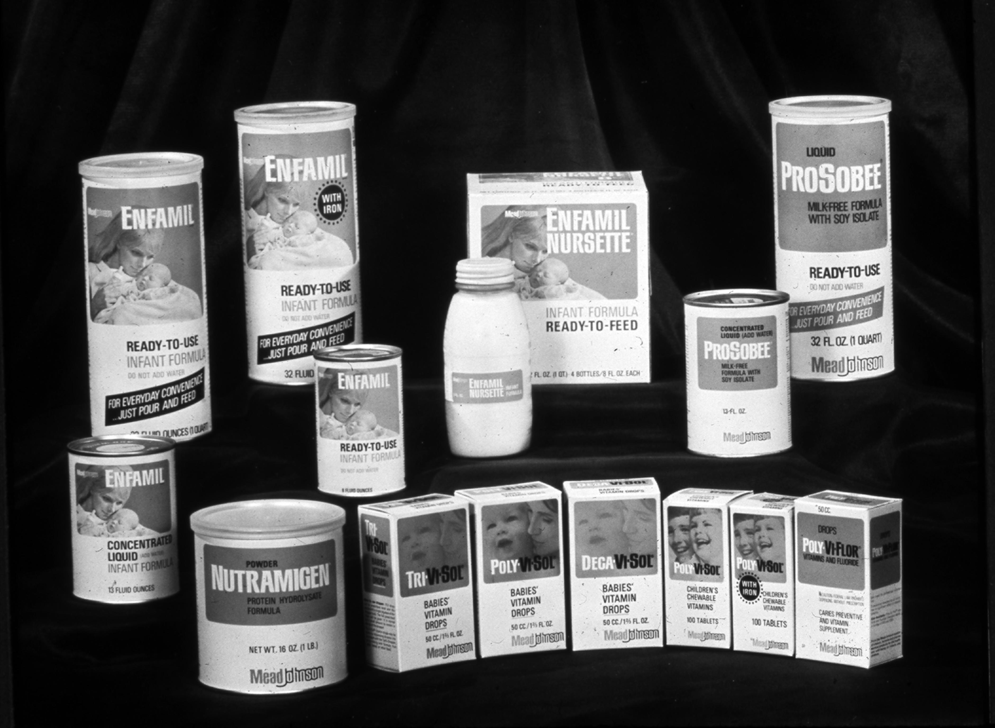 Advertisement for these Mead Johnson baby products: Enfamil, Nutramigen, ProSobee, and various baby vitamin drops. "Introduced in 1959, Enfamil was Mead Johnson�s first routine formula designed to be patterned after the nutritional composition of breast milk." Mead Johnson developed Nutramigen in 1942 to cater to the needs of infants with allergies to cow�s milk protein and was the first protein-hydrolysate infant formula available in the United States. Nutramigen today is the most widely studied formula for the dietary management of allergic manifestations." ProSobee, the first infant formula in the United States with soy protein isolated from whole soy flour, was introduced for infants with difficulty tolerating routine milk-based infant formula." Mead Johnson introduced the first line of water-soluble paediatric vitamins, called Vi-Sols. [in the 1960s] Today they remain the leading physicians-recommended paediatric vitamins. (http://www.meadjohnson.com/brands/our-brand) Edward Mead Johnson, part of the family that founded Johnson & Johnson, began his own firm in 1905 in New Jersey. The company moved to Evansville, Indiana in 1915 in an effort to be closer to the source of the agricultural goods used in its infant nutritional products.
