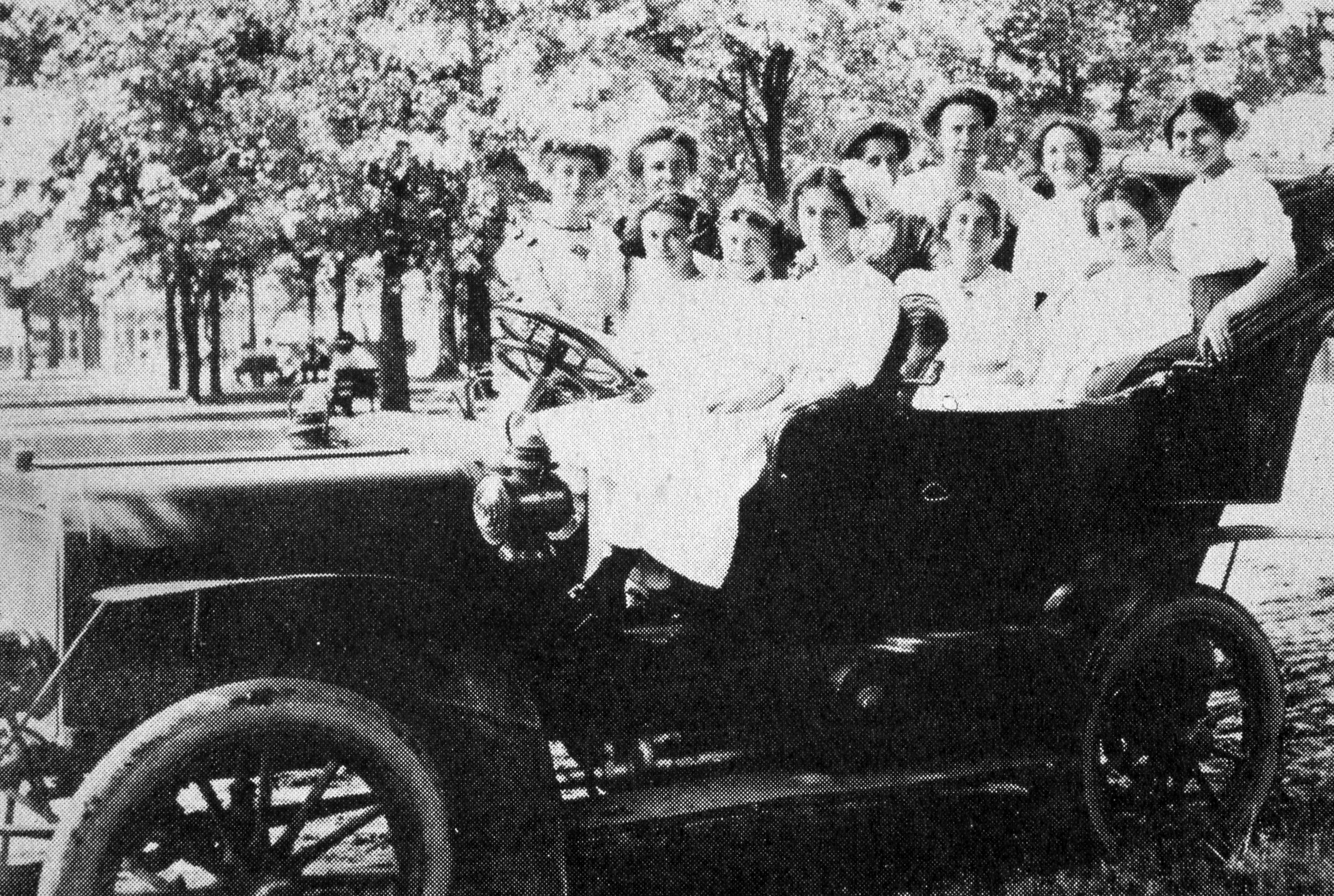 Eleven women in a 1907 Model C Simplicity Touring Car, built by the Evansville Automotive Co. The Simplicity was manufactured in Evansville between 1907-1911, by Willis Copeland at the Singer Center Buggy Works, 5th and Locust Sts.