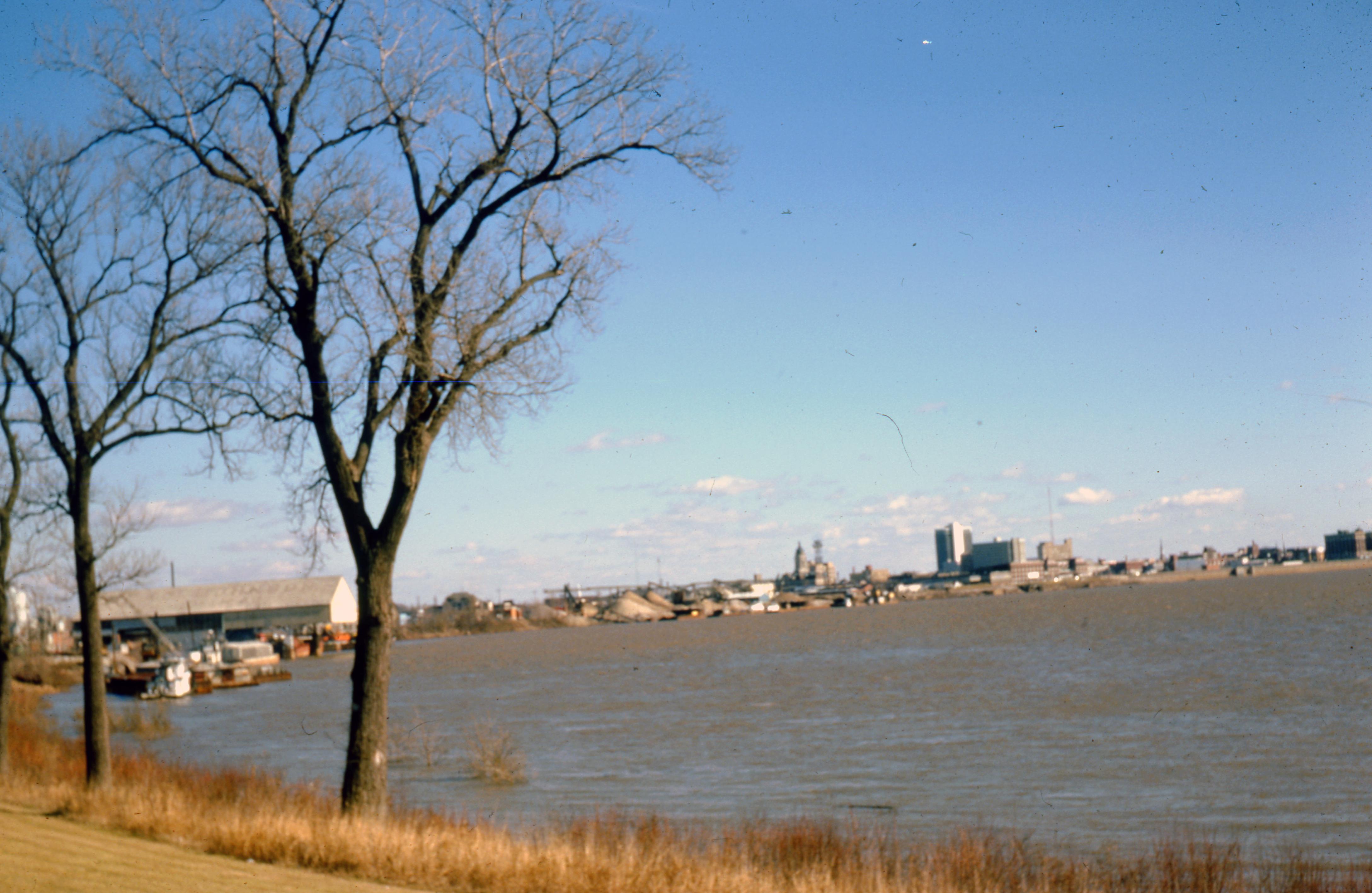 Evansville as seen from the west across the bend in the Ohio River. The building between the trees is Mead Johnson Terminal at 1830 W. Ohio St. Mead Johnson is still in Evansville, and this terminal still exists, although probably changed somewhat. The dome of the old Vanderburgh County Courthouse and the former Old National Bank tower are just visible on the horizon.