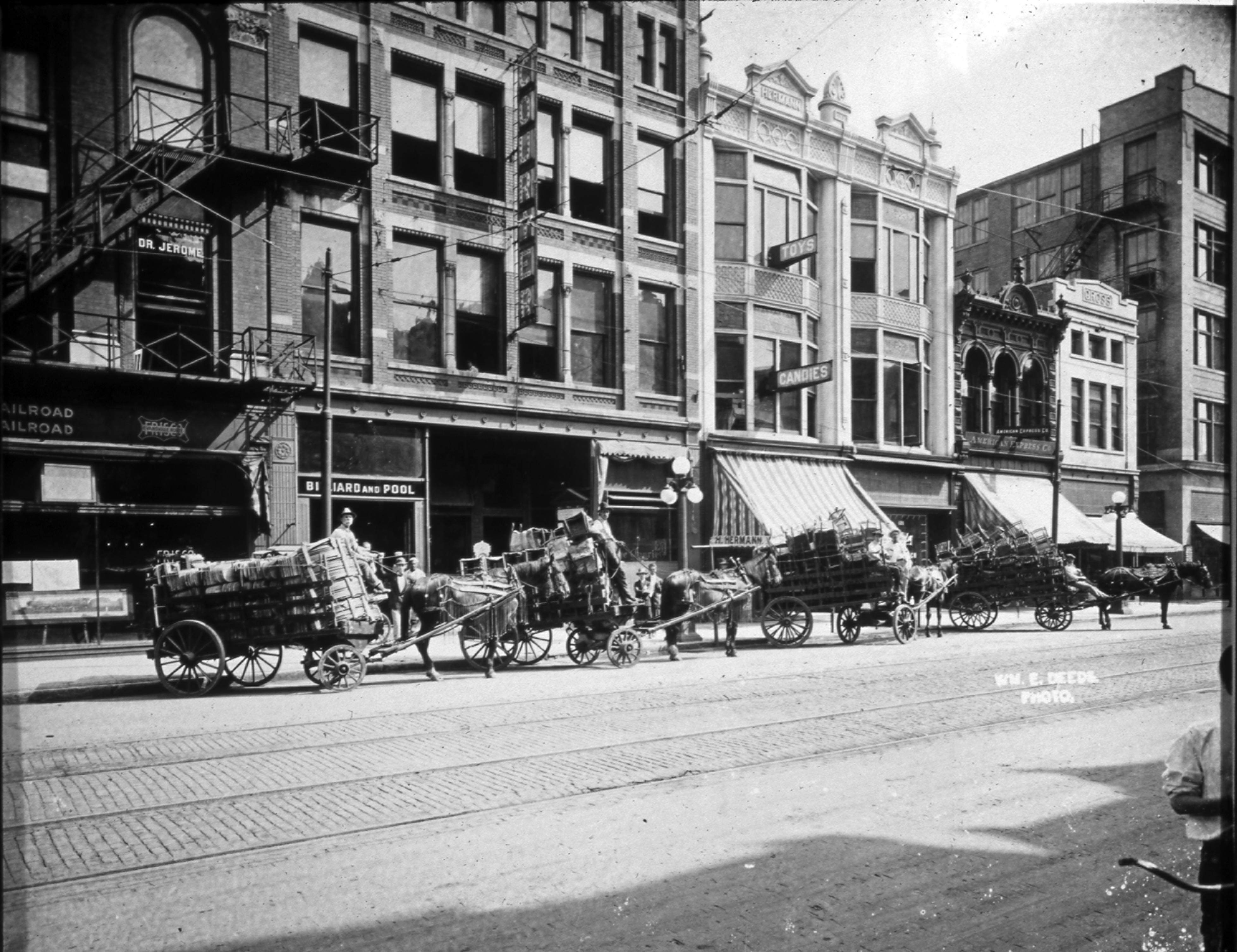 100 block of Main St. The large building on the left is the Courier Building at 125-127 Main St., which dates back to the 1880s but has since been razed. The newspaper itself is still published, now called the Evansville Courier & Press. The building in the middle, with the striped awning, is the Hermann building, housing the Hermann Candy Store and ice cream parlor. It was in business at least as early as 1882 but was razed in the late 1950s-early 1960s. Next is the American Express Co. at 119 Main St. It, too, dates to the 1880s but was razed in the 1950s-1960s, The last building to be fully seen is the Gross Building at 117 Main St., with the same time frame for construction and razing. The smaller businesses seemingly in the Courier Building cannot be verified. As for the line of heavily loaded wagons in the middle of the street, the Historic Evansville website identifies them as "R. M. Cuttridge [sic] & Sons, haulers operating the famous yellow line of drays." City directories of the period identify a Robert M. Cutteridge as a teamster or drayman. This photograph is identified as being produced by Wm. E. Deeds., who was affiliated with the newspaper.