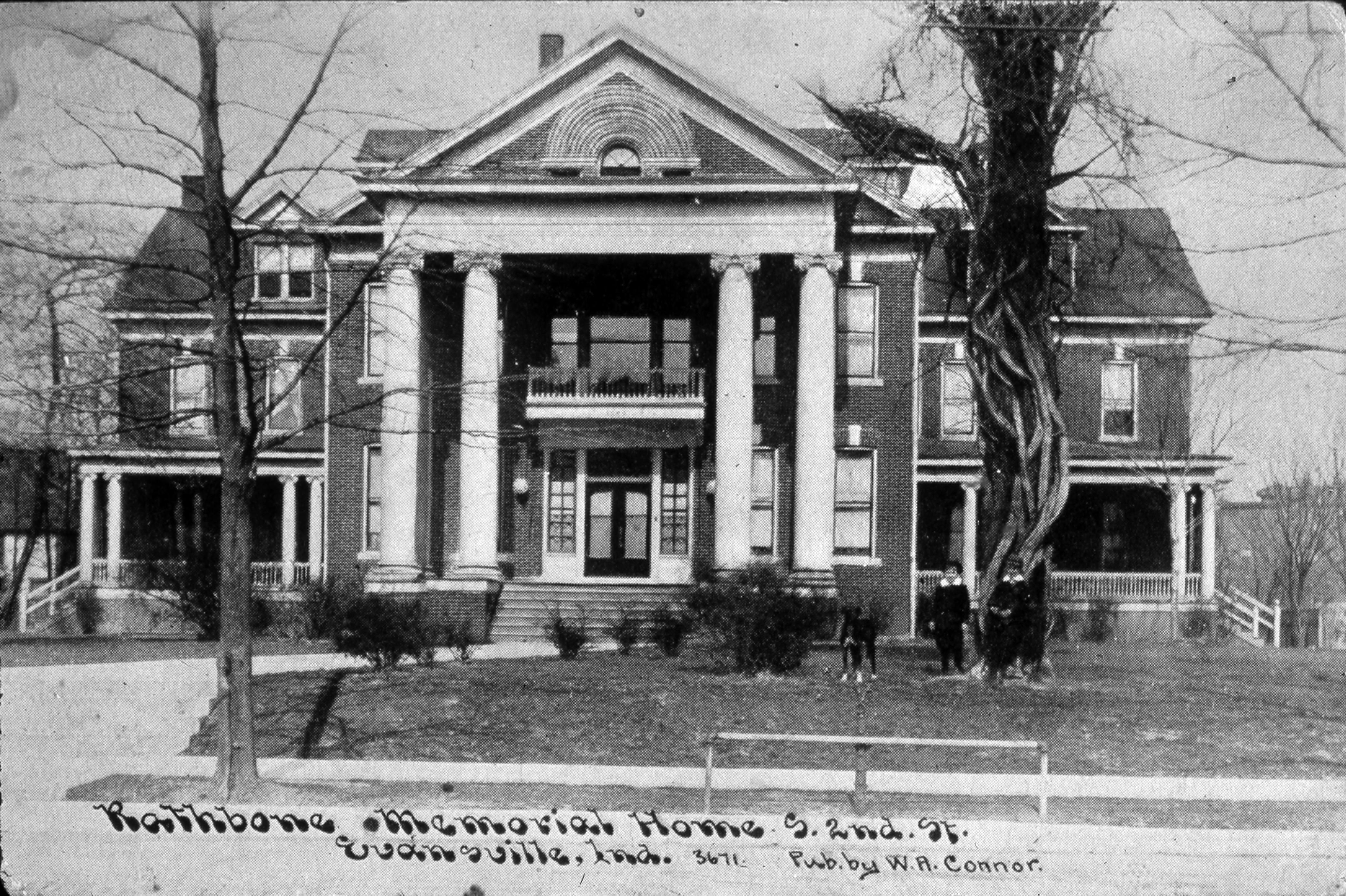 Postcard " of Rathbone Memorial Home at S. 2nd St. Evansville, Ind. 3671 Pub. By W.A. Connor--this text is written in fancy script that, by the slant, may have been written by a left hander. There are 2 small children and a dog in the yard. "The Rathbone Memorial Home, located at 1320 SE Second St., was dedicated April 5, 1905, after 20 years of planning. The home was founded by Kate and Caroline Rathbone, wife and sister of prominent banker George Rathbone, as a residential facility for elderly women of means. Residents would provide at least $300, more than $7,800 in today's money, and any other assets to the foundation, who would then provide care to residents for the rest of their life. The Rathbone Home was one of the earliest nursing homes in Indiana, predating the modern safety net for the elderly. The Rathbone was acquired by Welborn in 1967 and continued as a retirement home until 1983. After briefly serving as apartments, the Rathbone Retirement Community was opened in the building in 1988, to provide assisted living to its residents. (http://www.courierpress.com/story/life/columnists/2017/04/10/history-lesson-rathbone-memorial-home/100171822/) A recent announcement said that the Rathbone Home was closing August 2017. George Washington Rathbone (1813-1883) was with Evansville National Bank, the predecessor to today's Old National Bank.