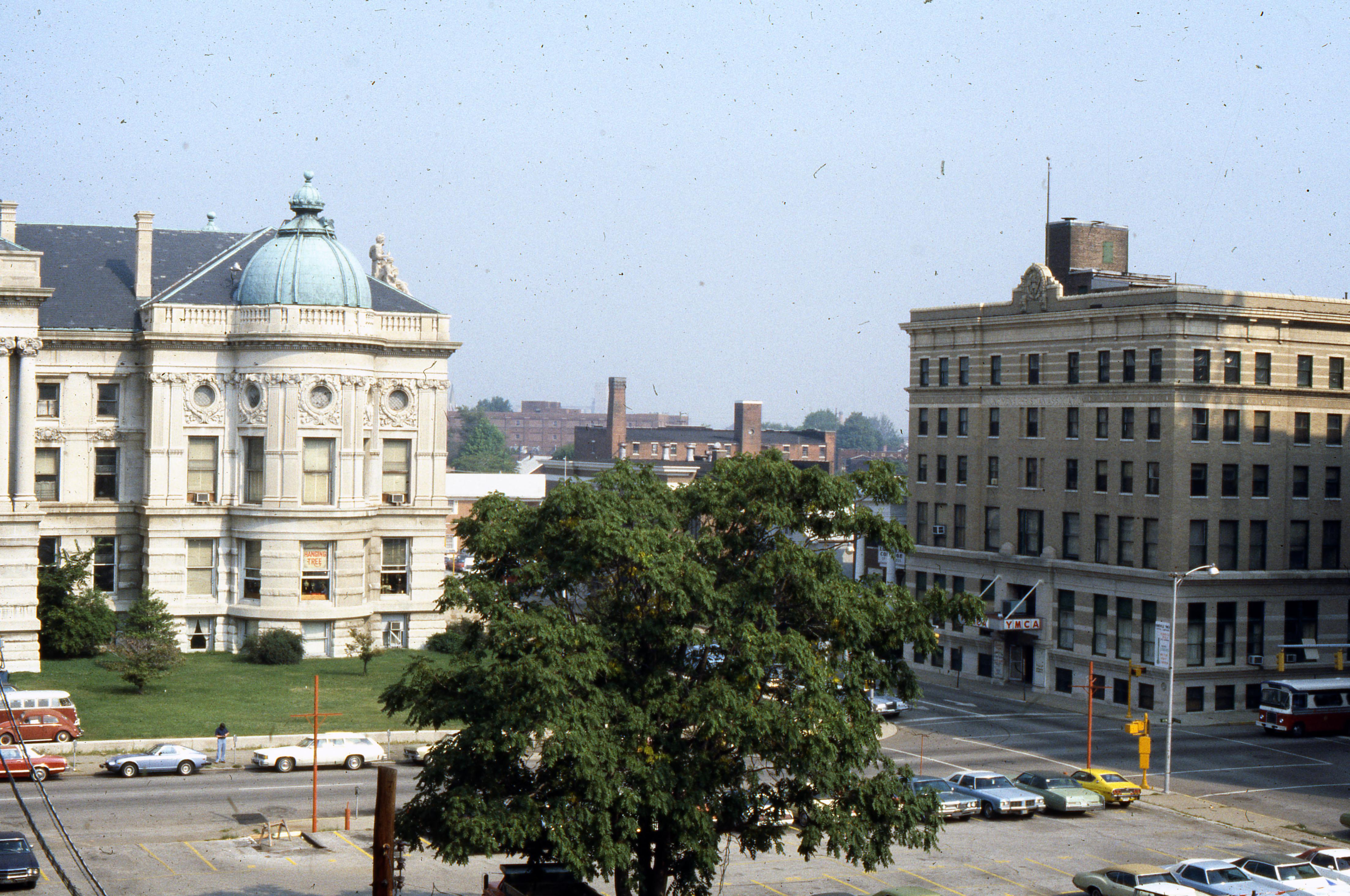 The old Vanderburgh County Courthouse, a Beaux Arts structure, was designed by Henry Wolters of Louisville, KY. Construction began in 1888 and was completed by 1890, with offices moving in early in 1891. It occupies the block bounded by 4th, Vine, 5th, and Court streets, an area that was once a turnaround basin for the Wabash and Erie Canal. The building still stands, although it has not served as a courthouse since 1969. (It would not have served as a courthouse at the time of this photograph.) The 5th St. side is shown shown here. Across Vine St. is the YMCA at 203 NW 5th St. The YMCA moved into this building 1913/1914, although as an organization it has been in Evansville at least since 1891. According to one source, this building was vacated in 1981 when the Y moved next door, but reoccupied again in 1997 when the Y expanded back into it. When Central High School was located on 6th St., a gym was built for it in 1927. The school building has since been razed, but the gym still stands and as of 1979, is part of the YMCA. Today's Downtown YMCA extends down Vine St. to NW 6th St., across NW 6th St. to Court St., and halfway back Court St. towards NW 5th St. In other words, it encompasses almost the entire block, save for the space occupied by a law office at NW 5th St. and Court St. What is seen here still stands (different roof line), although the current street address/main entrance is now on NW 6th St. There is also another YMCA on the east side of town.